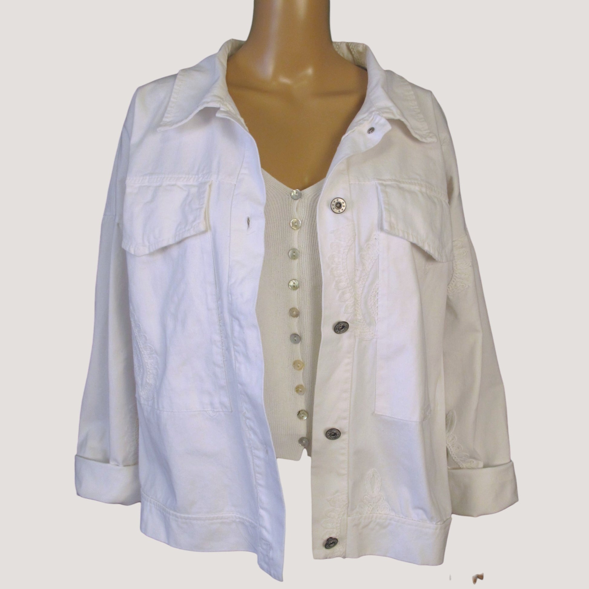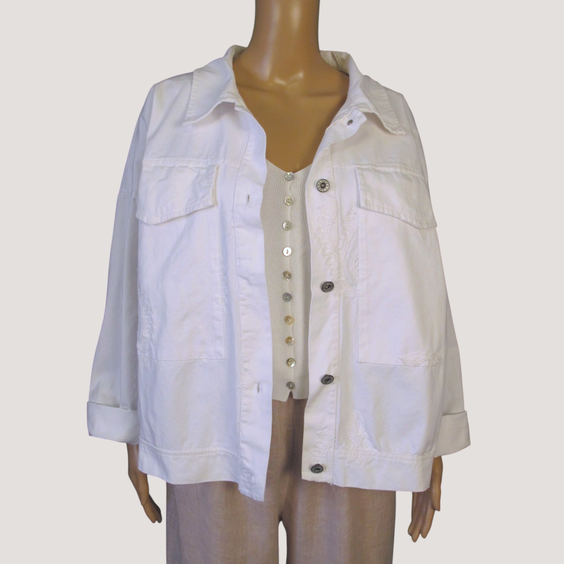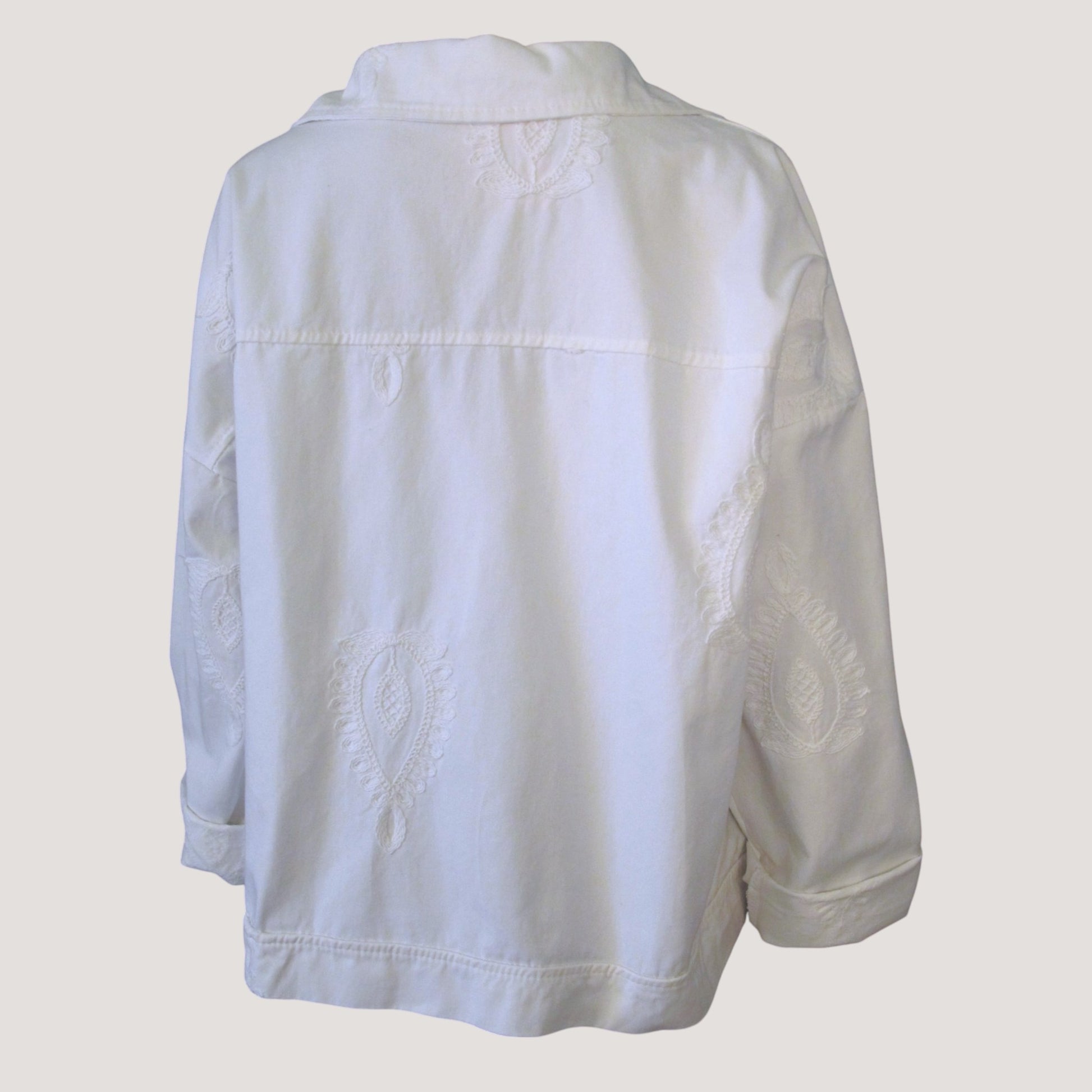Vit paisley mönstrad jeansjacka med bröstfickor och knappar framtill.
