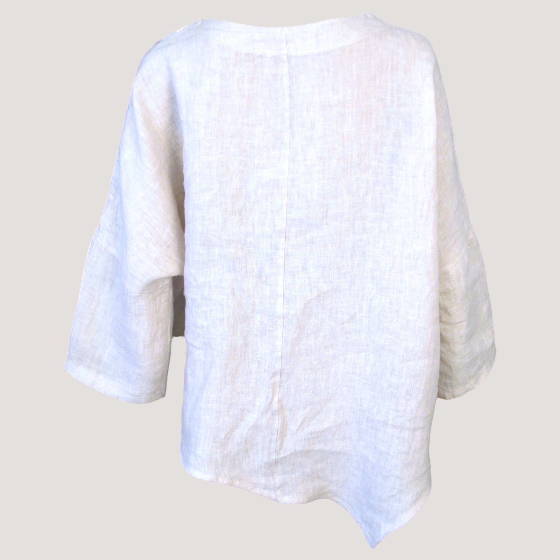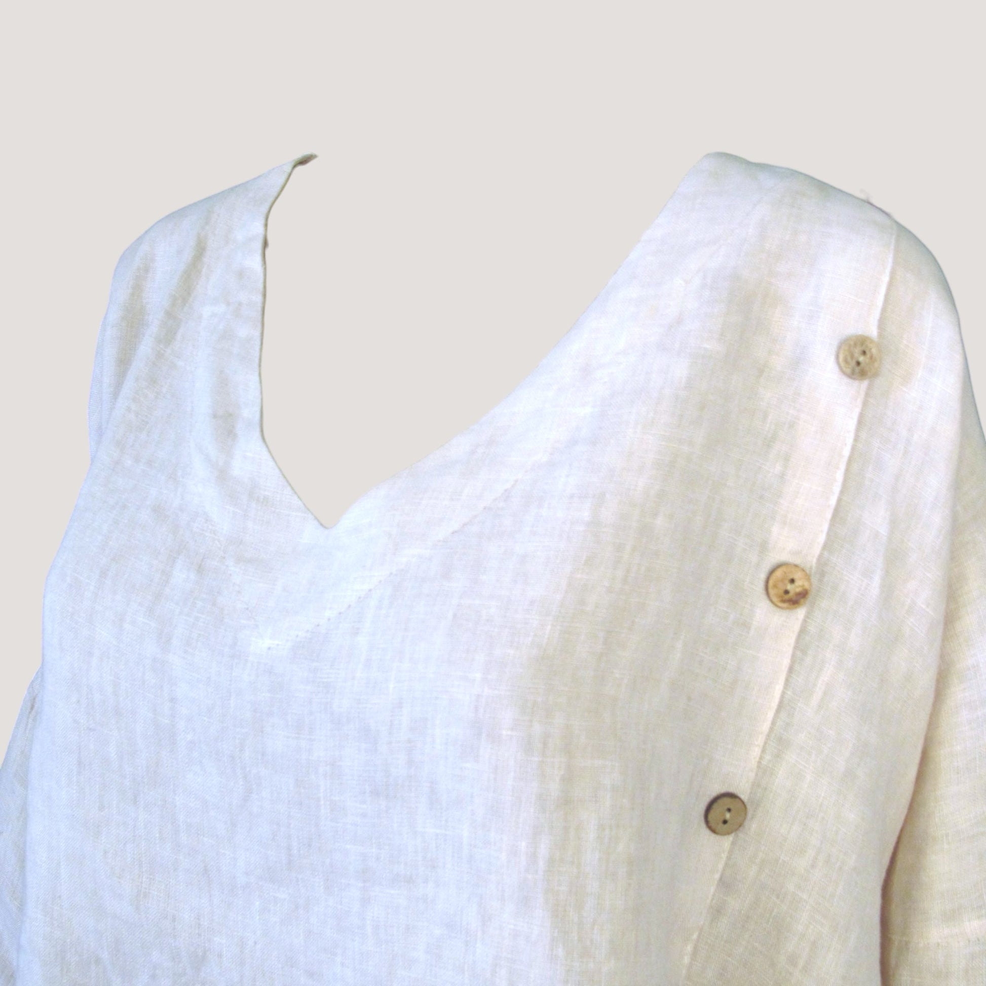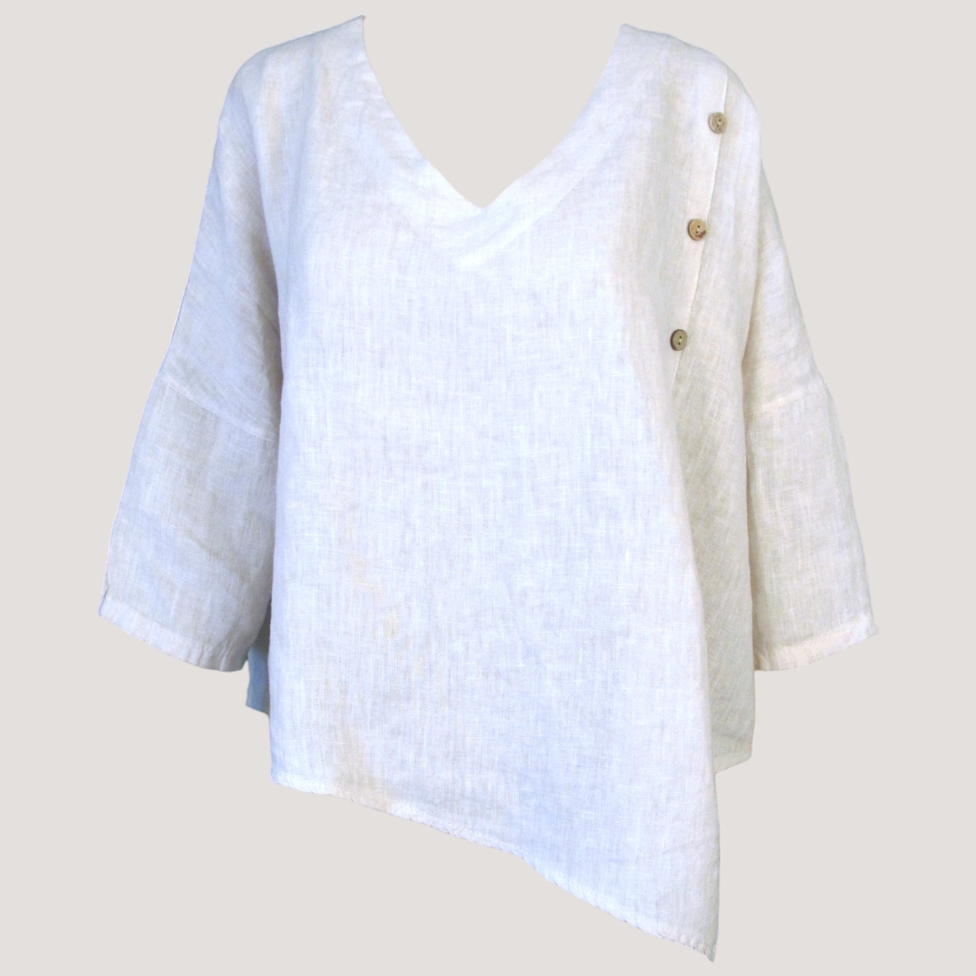 Asymmetrisk sydd linne blus med V-ringad hals och detalj trä knappar på sidan.