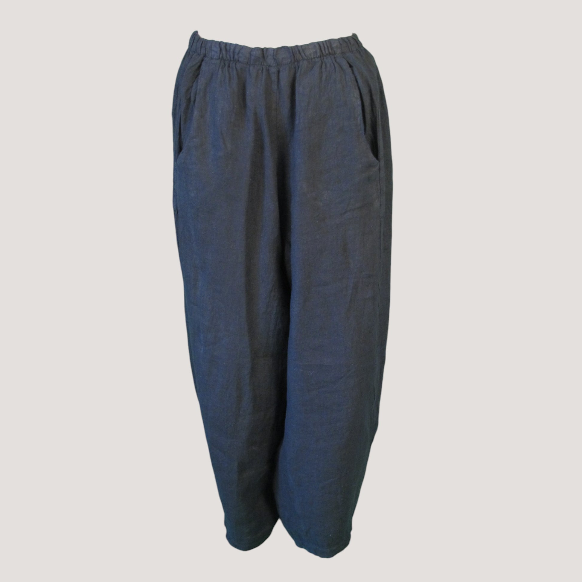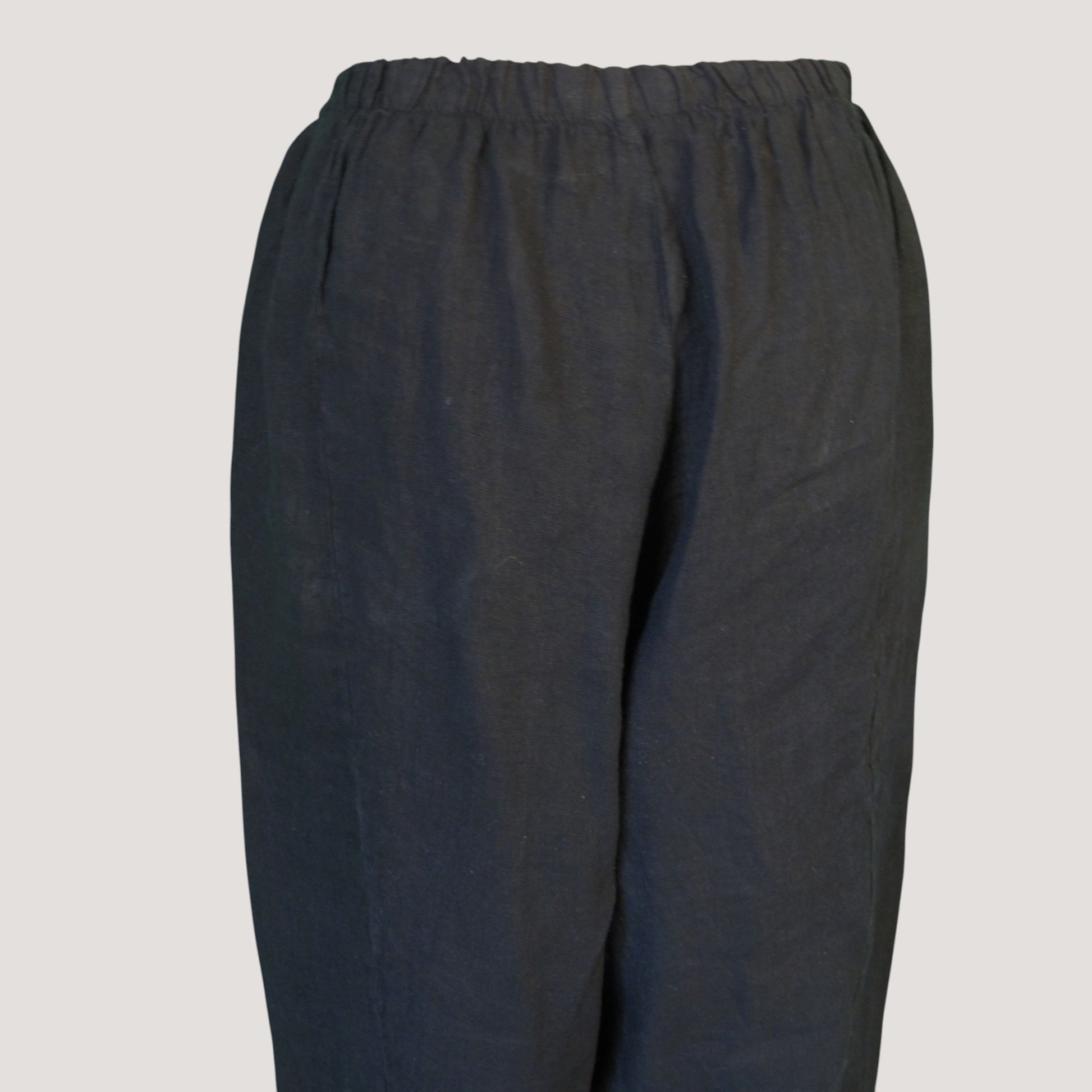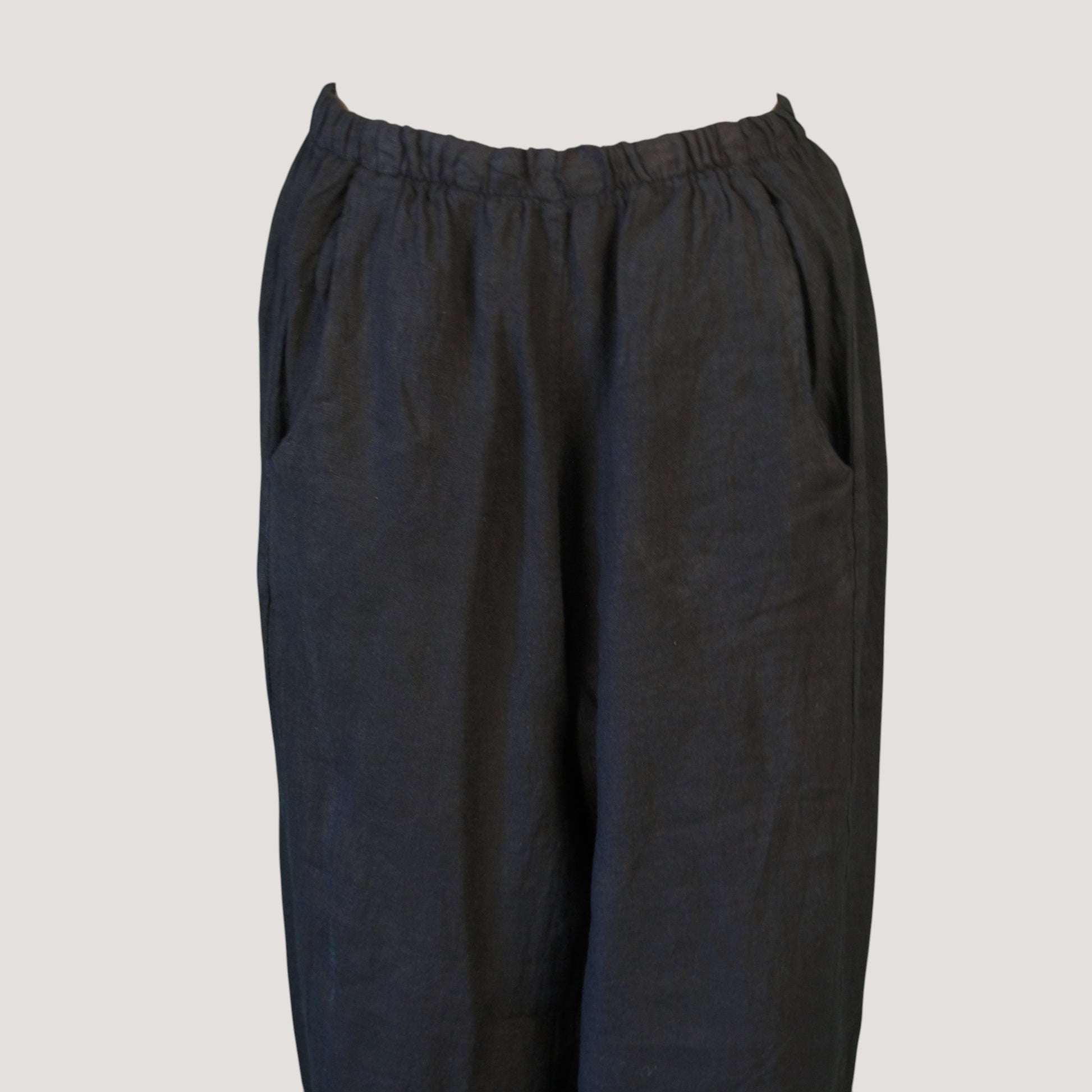 Svart linne byxa med resår i midjan och fickor på båda sidor.