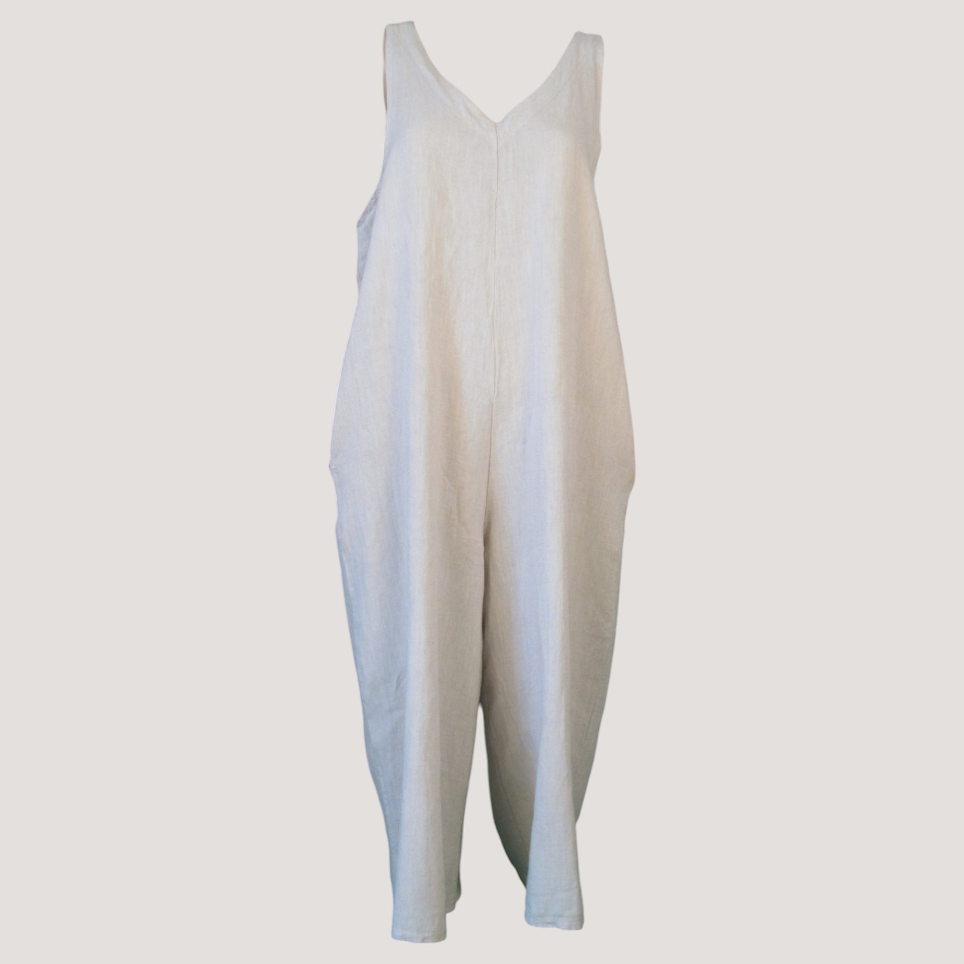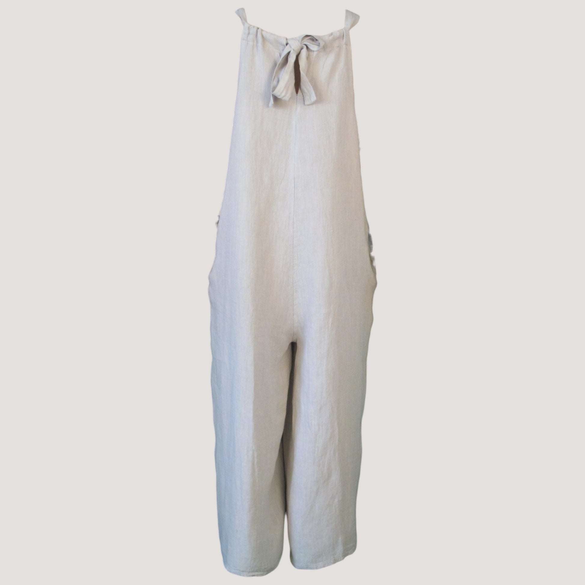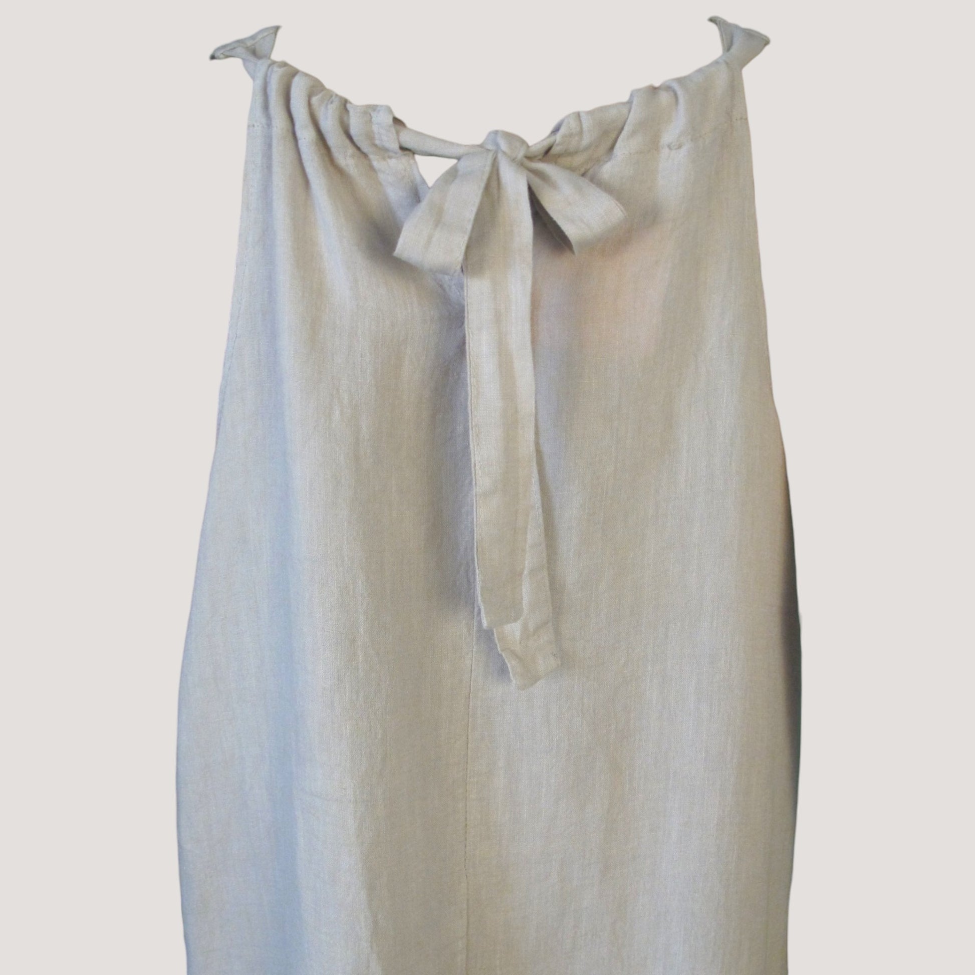 Byxdress i linne med smalare band och fickor på sidan, fin detalj bak med knytning i ryggen.