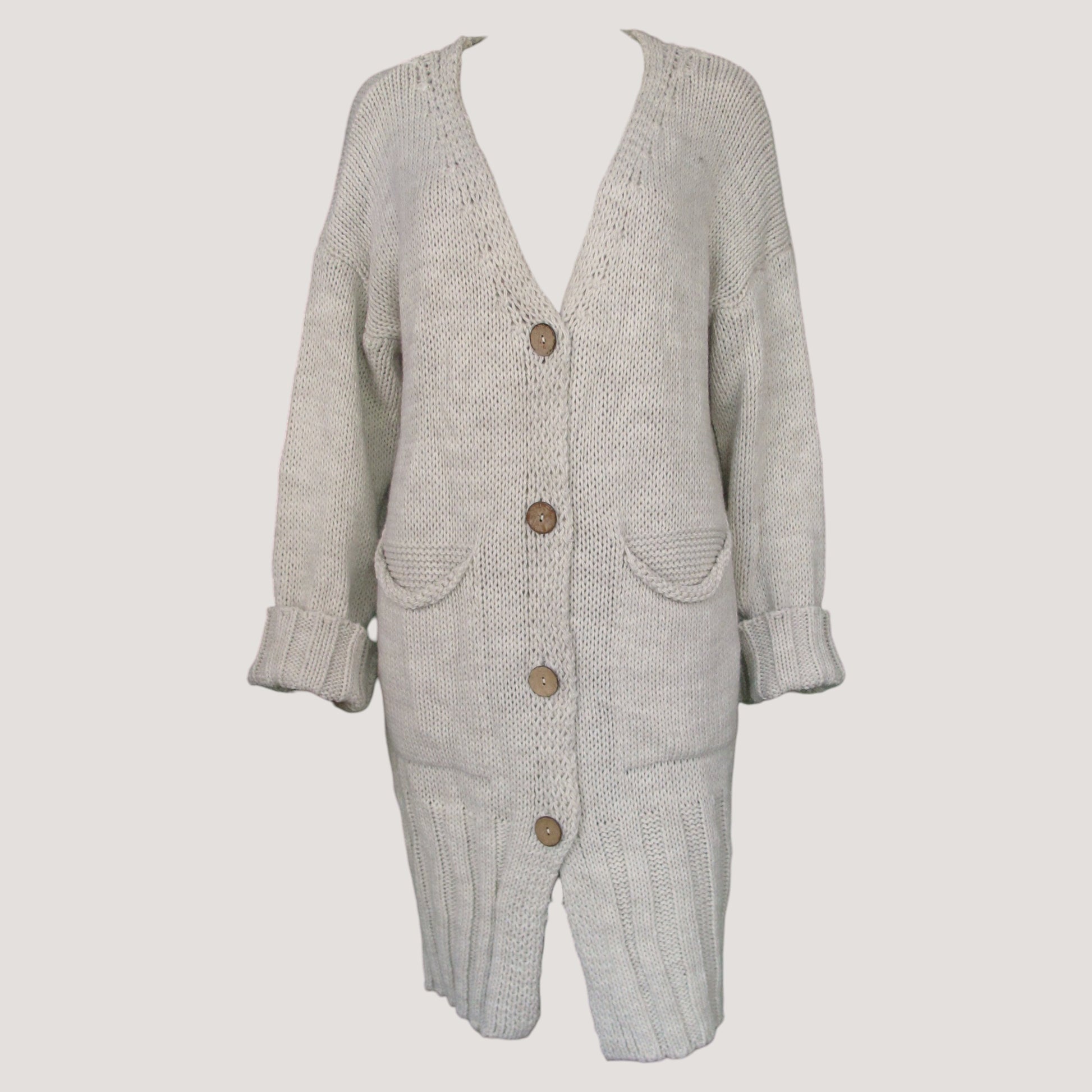 Stickad lång kofta med fyra större knappar framtill och fickor på framsidan. Mönsterstickad nertill.