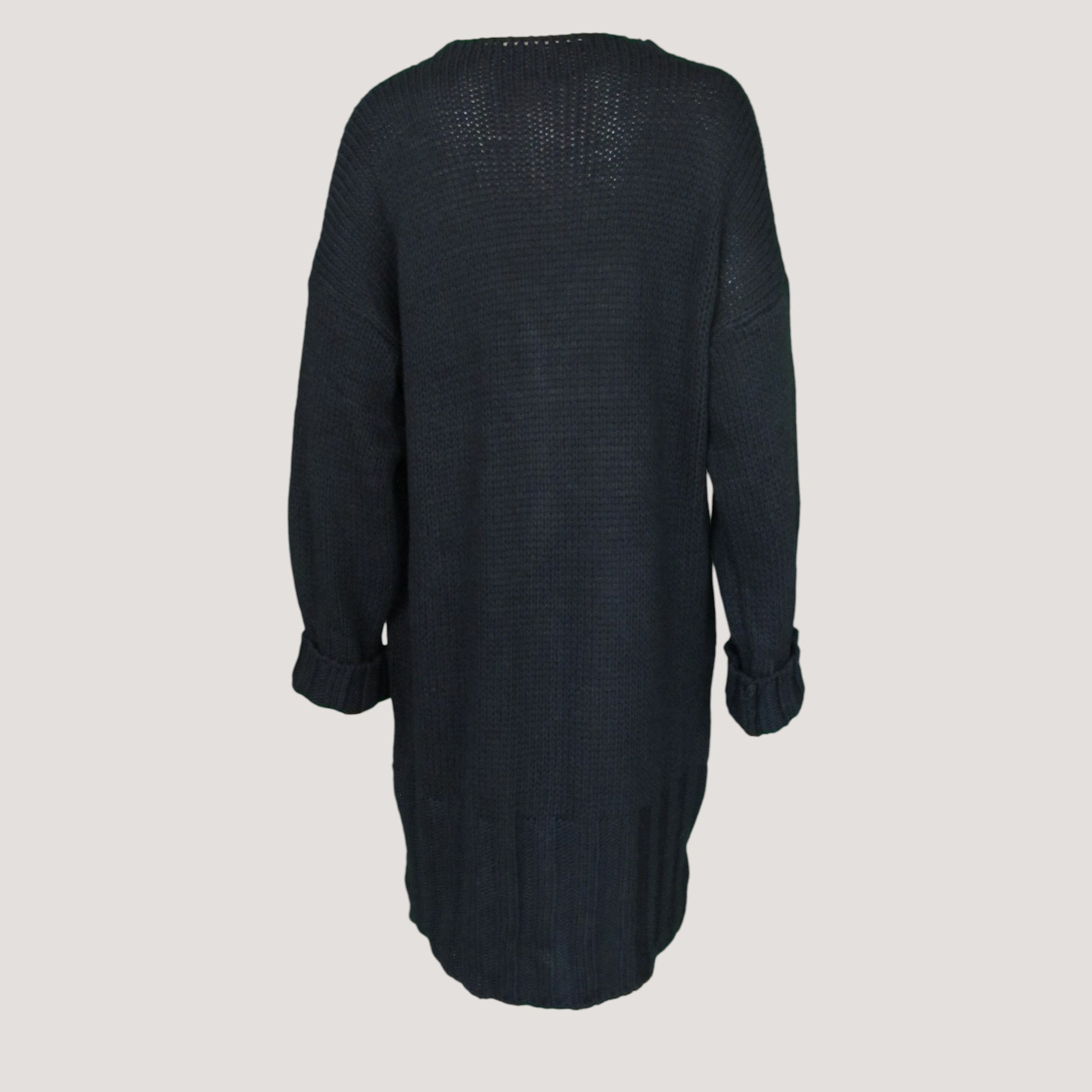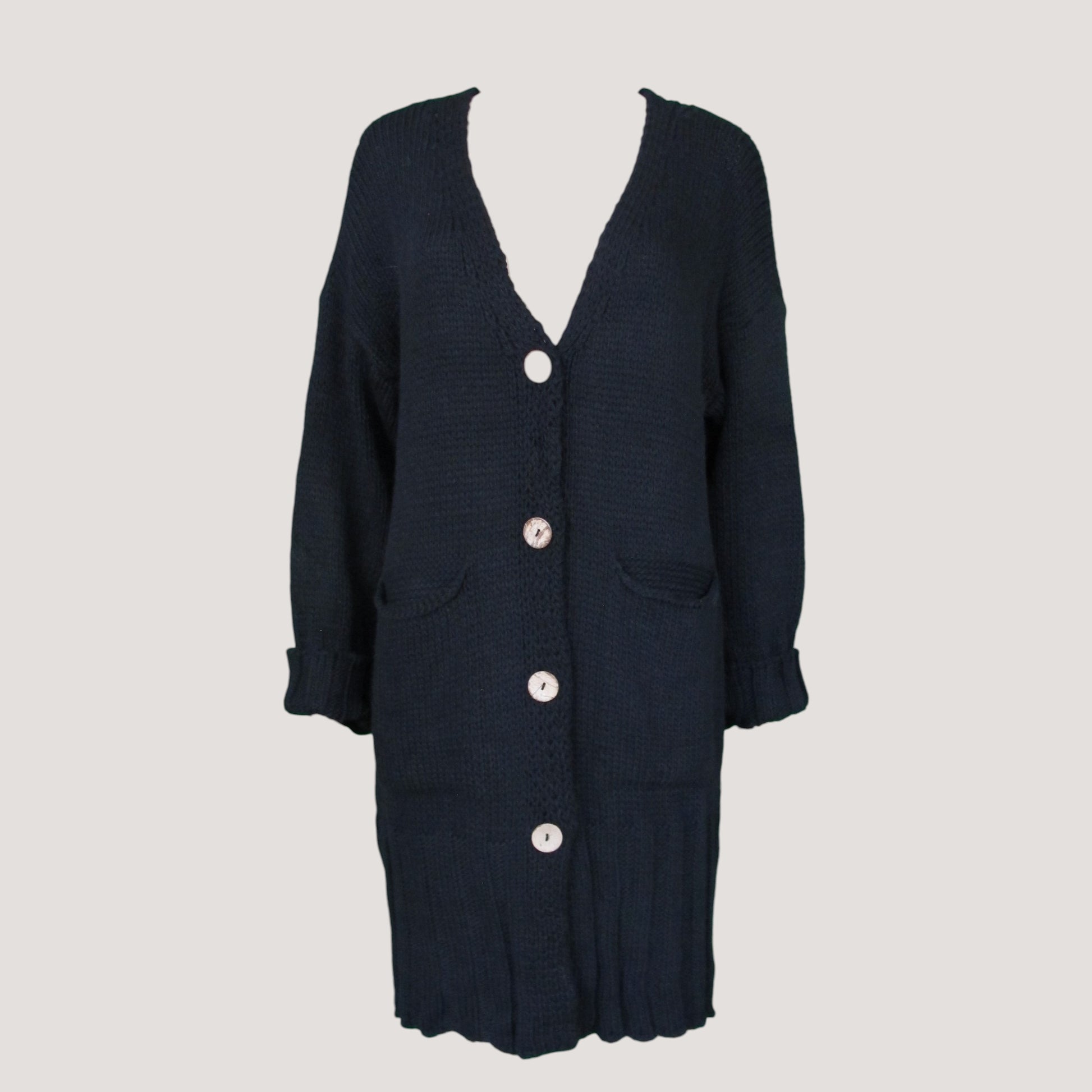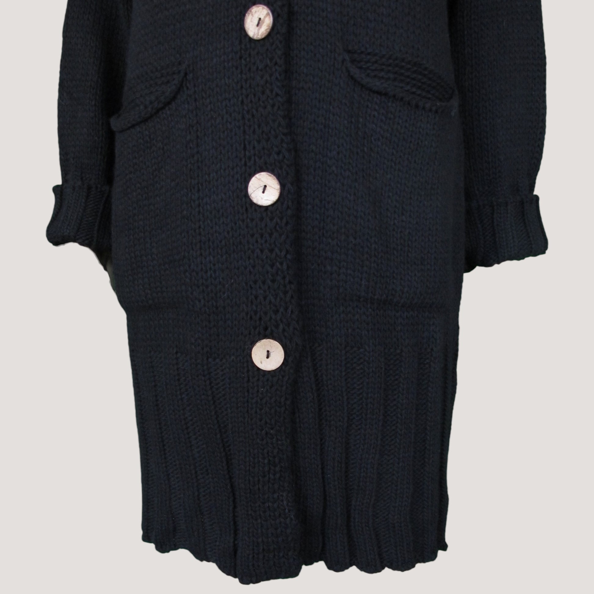 Stickad lång kofta med fyra större knappar framtill och fickor på framsidan. Mönsterstickad nertill.