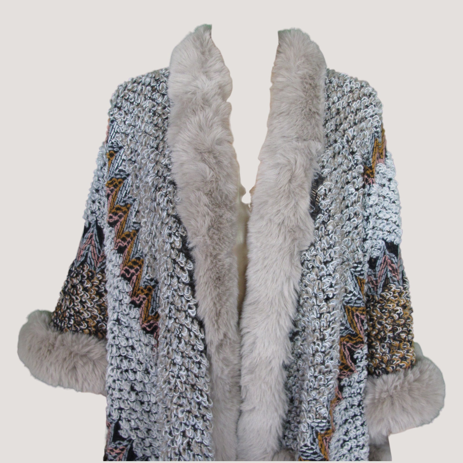 Mönstrad stickad ärmlös poncho med grå fuskpäls i kanterna.