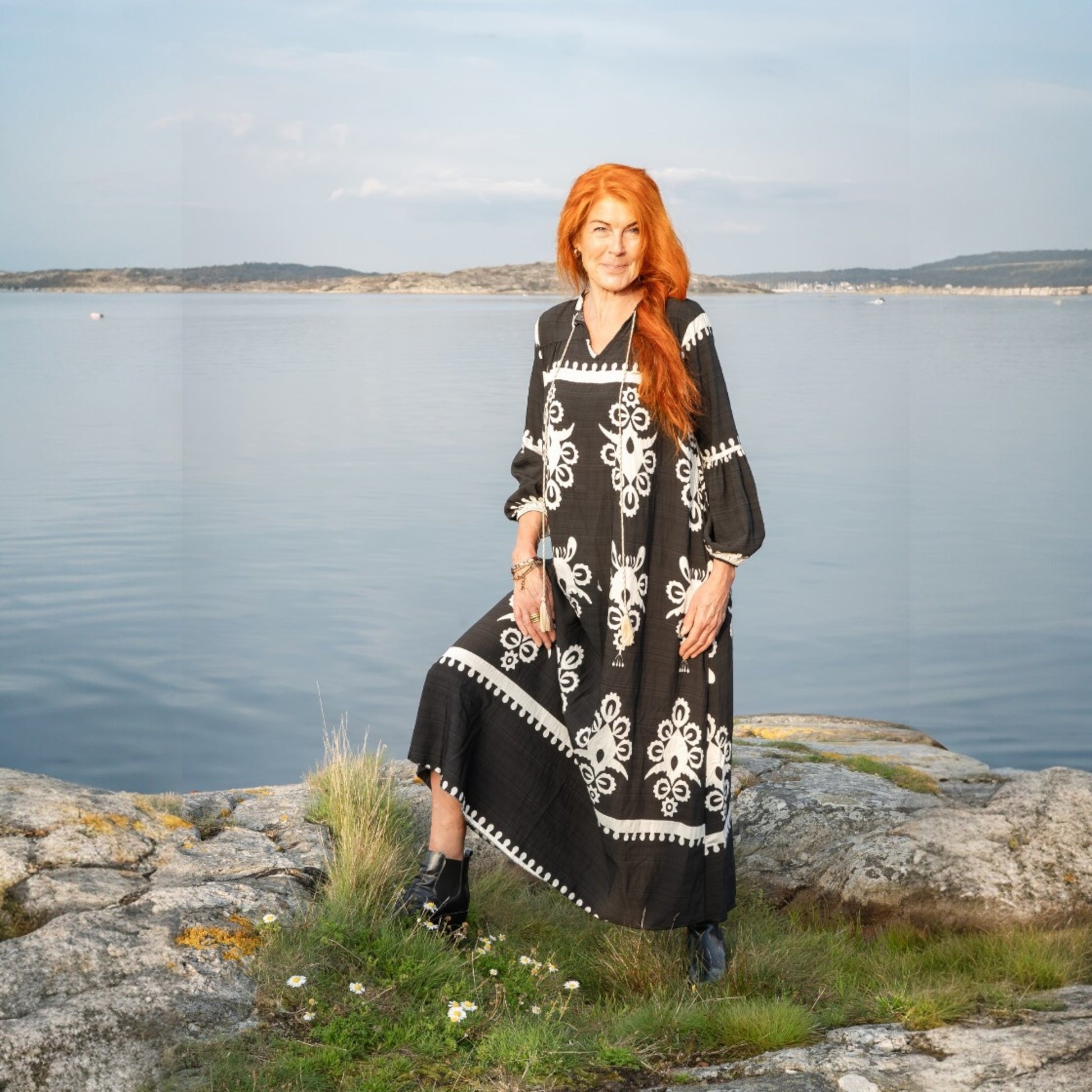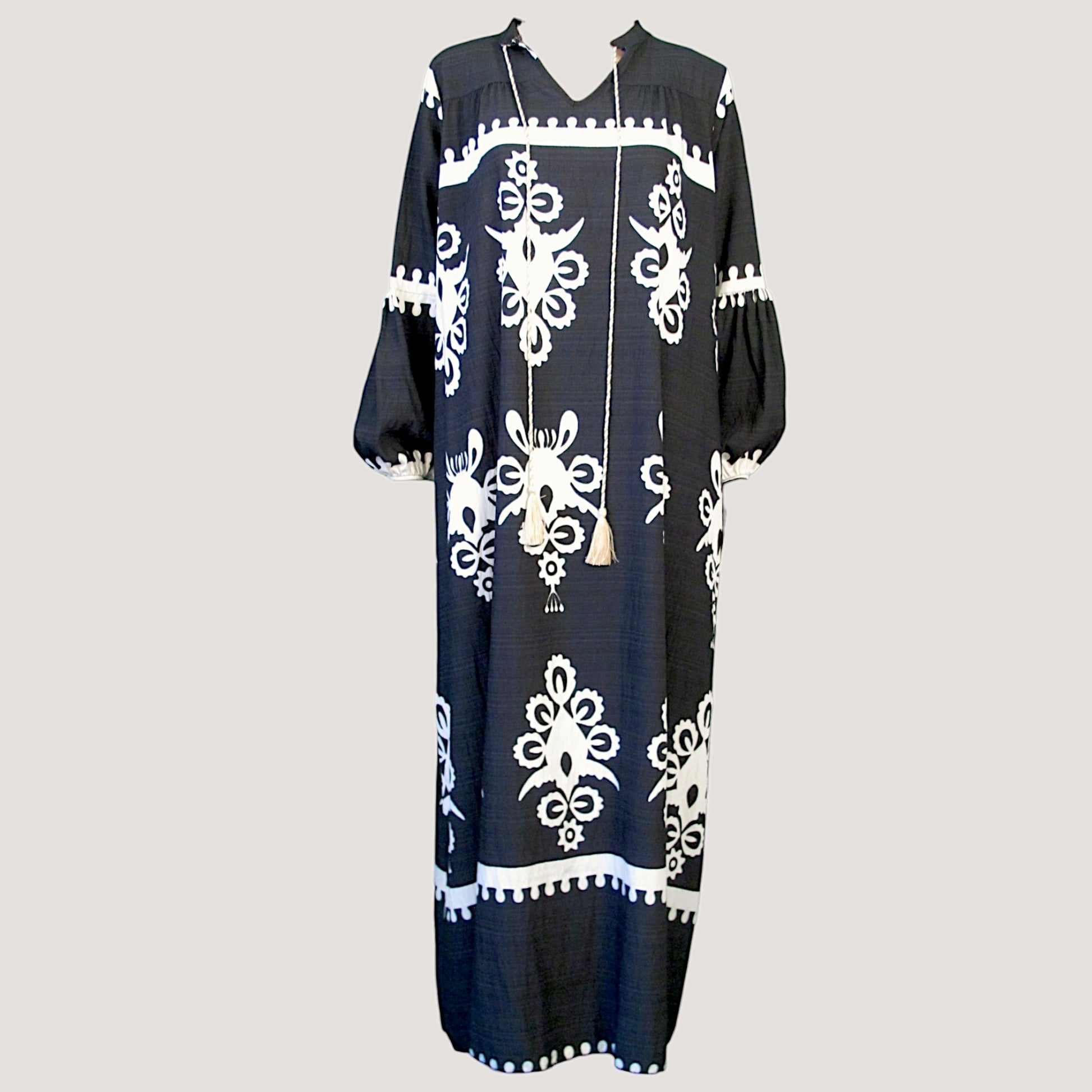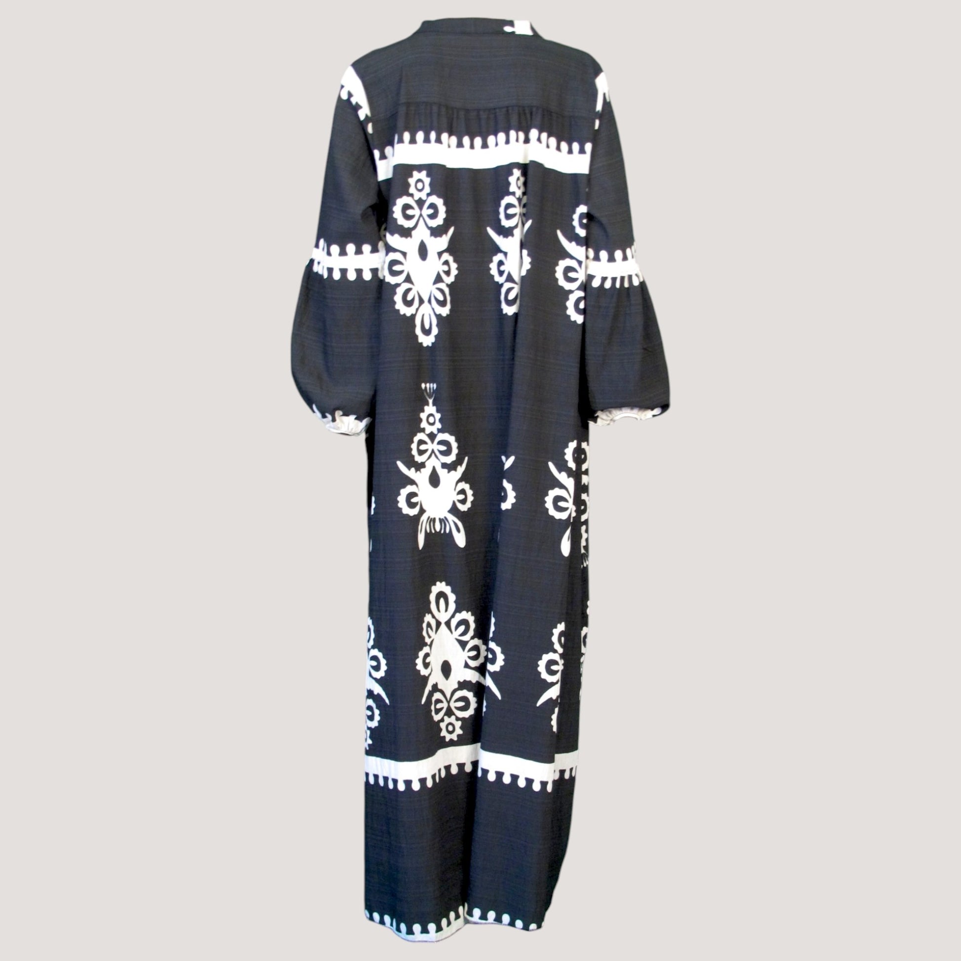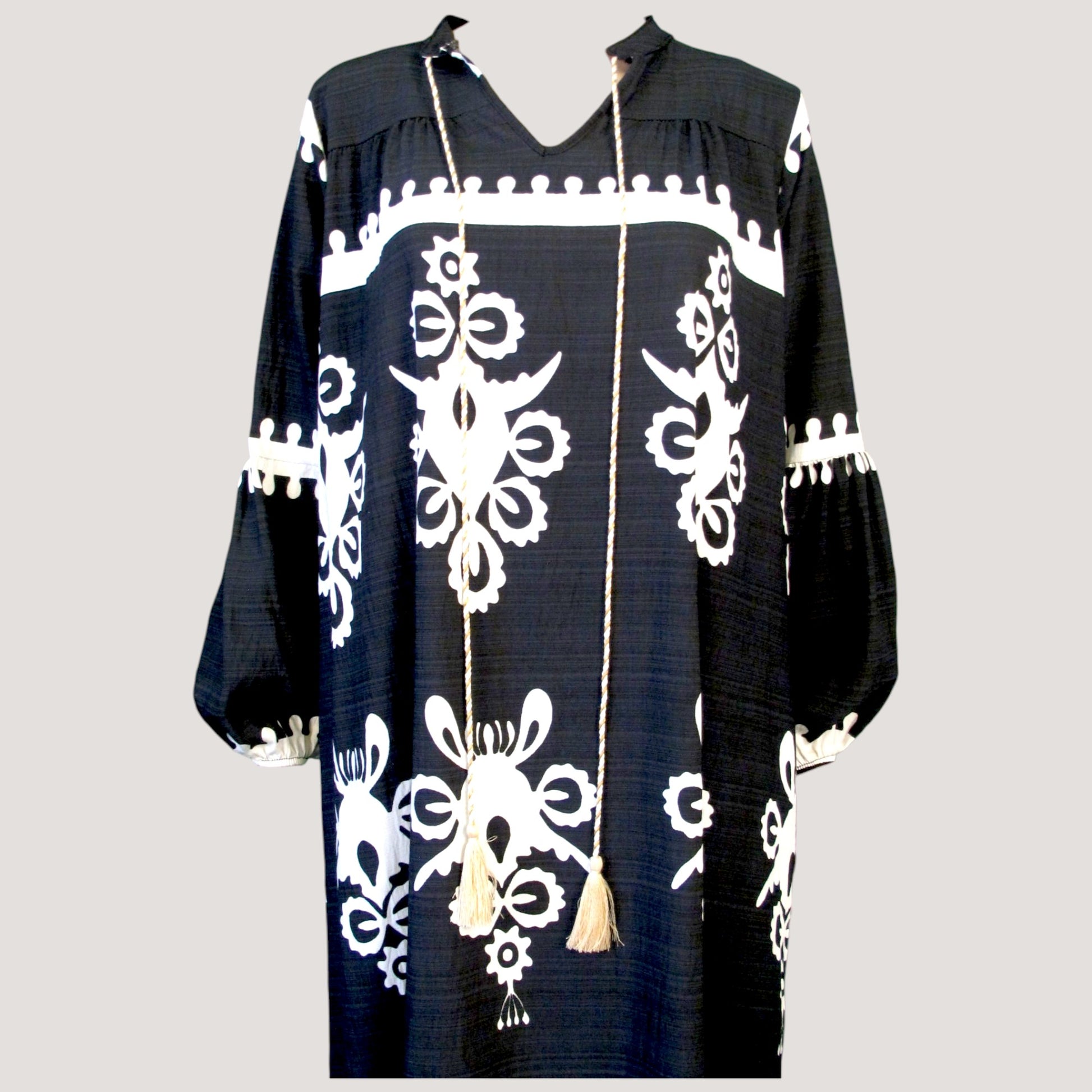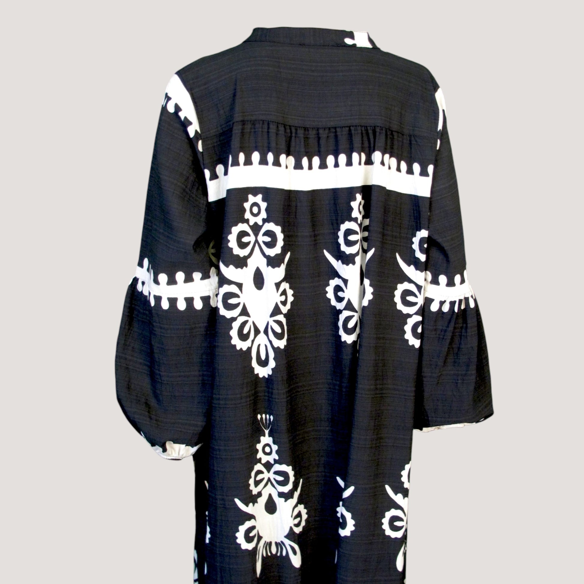 Lång bomulls klänning med vitt tryck och dekorativa snurrade snören framtill och lång ärm med resår.