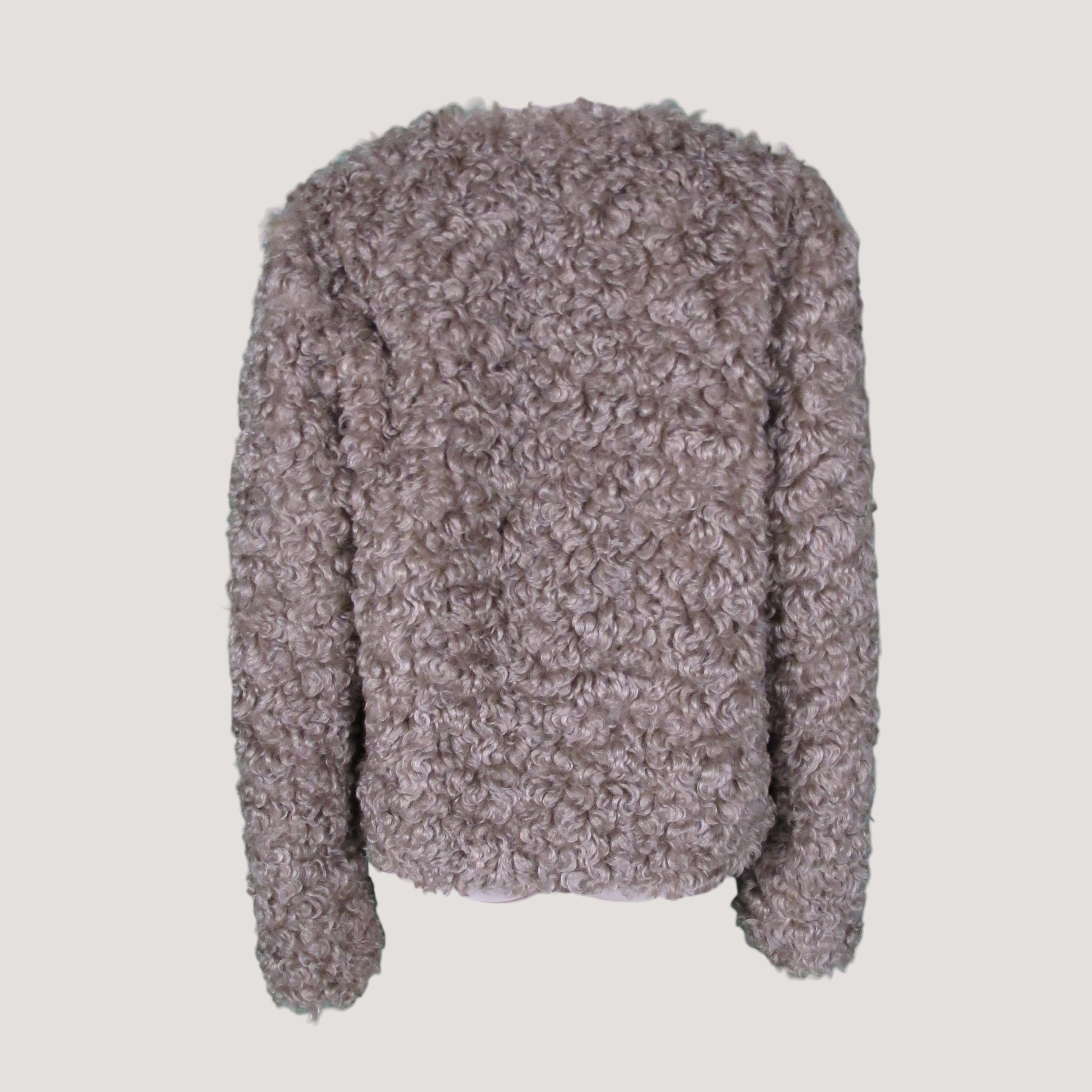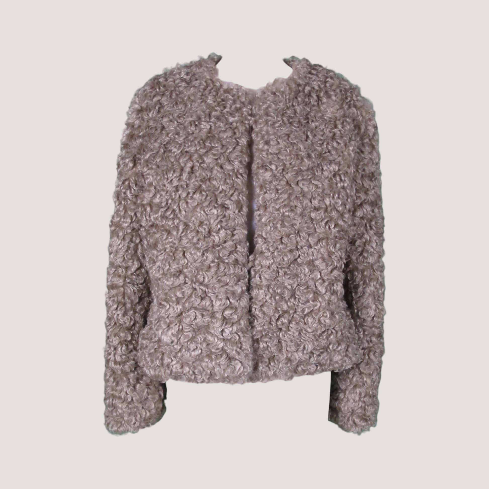Vegansk lockig kort fårulls jacka utan knappar med långa armar.
