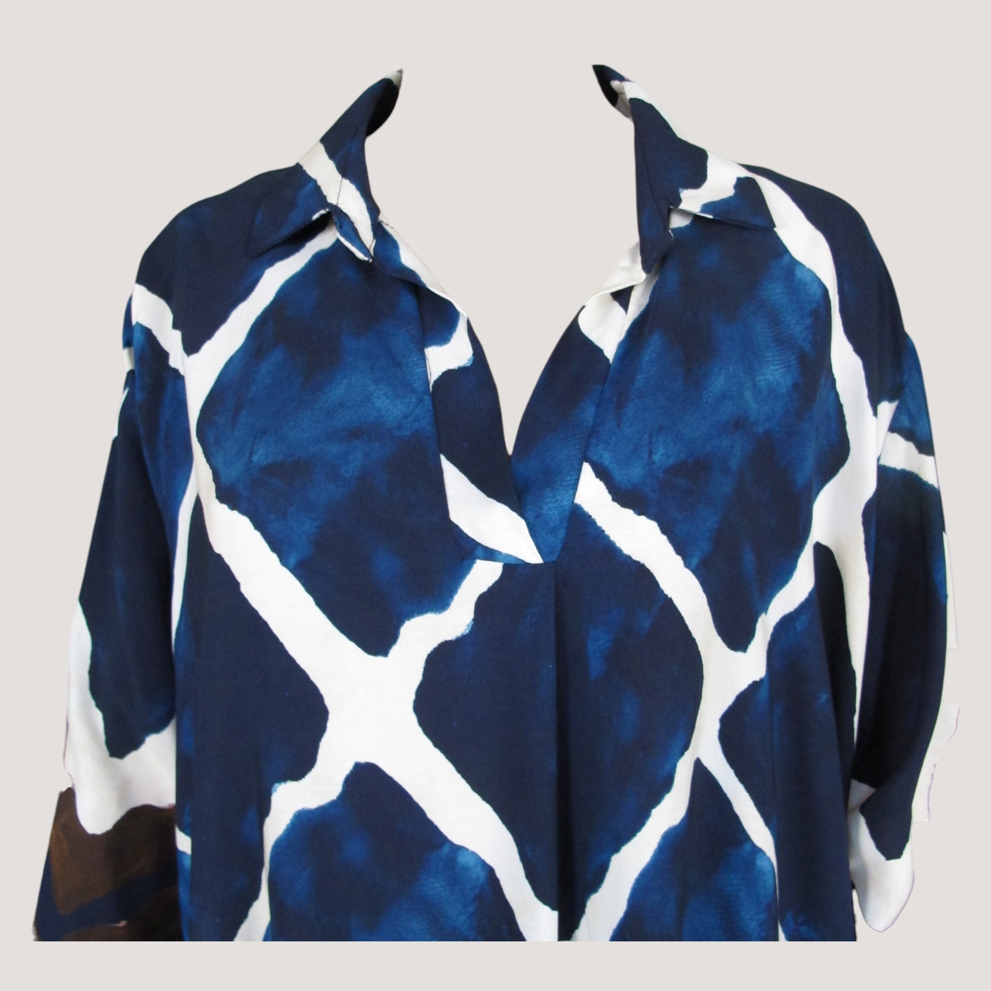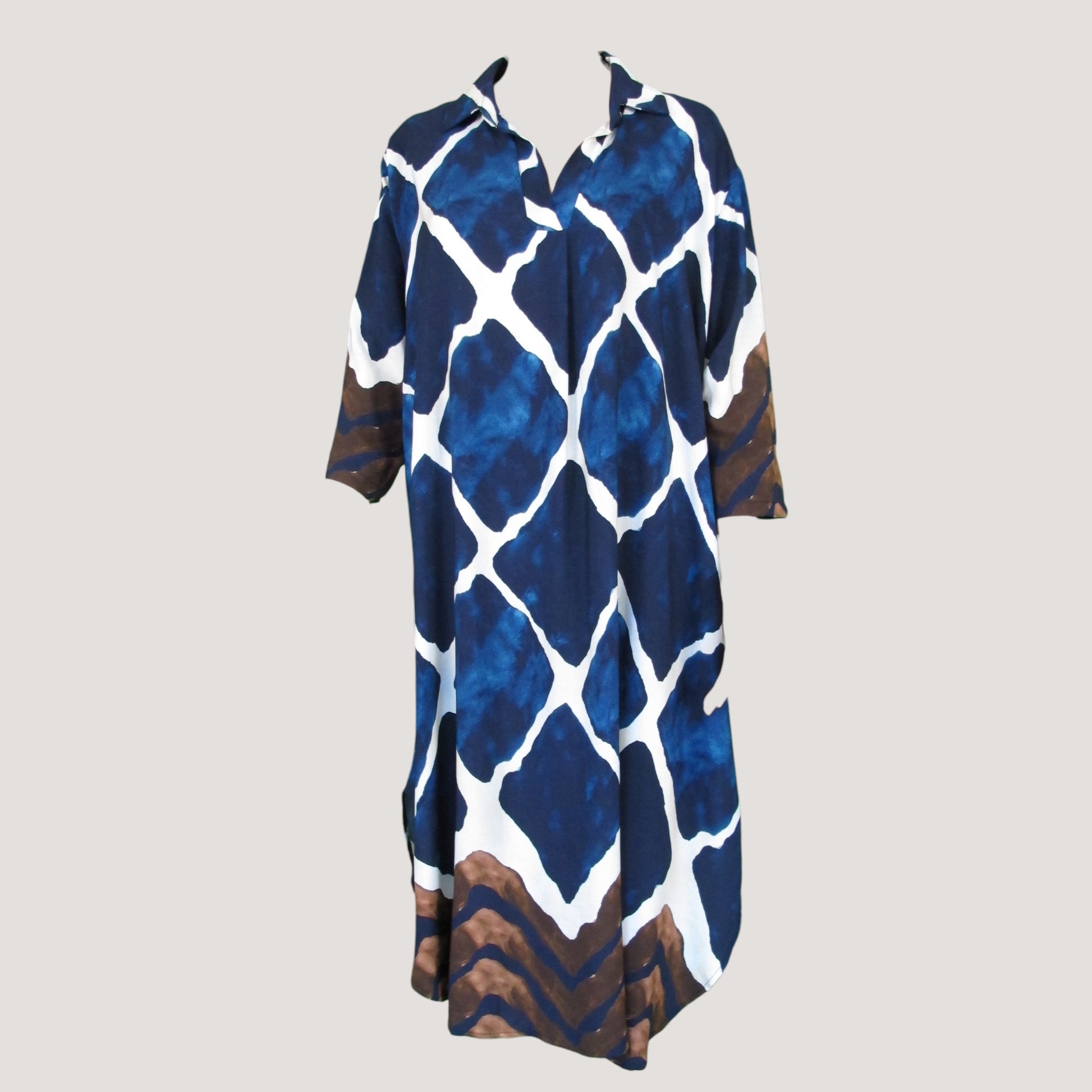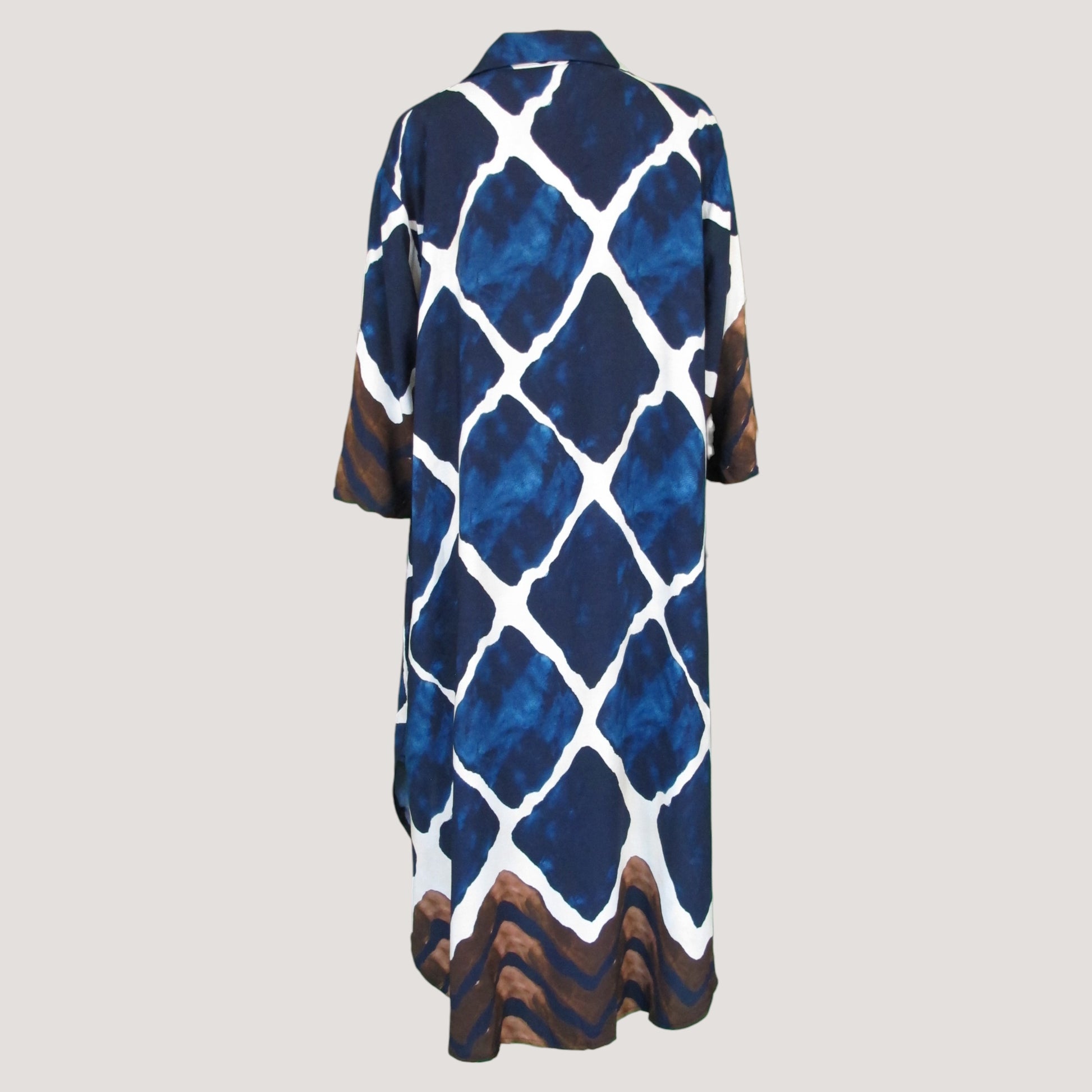 Lång mönstrad viskos klänning med v- ringad hals och en volang kant nertill.