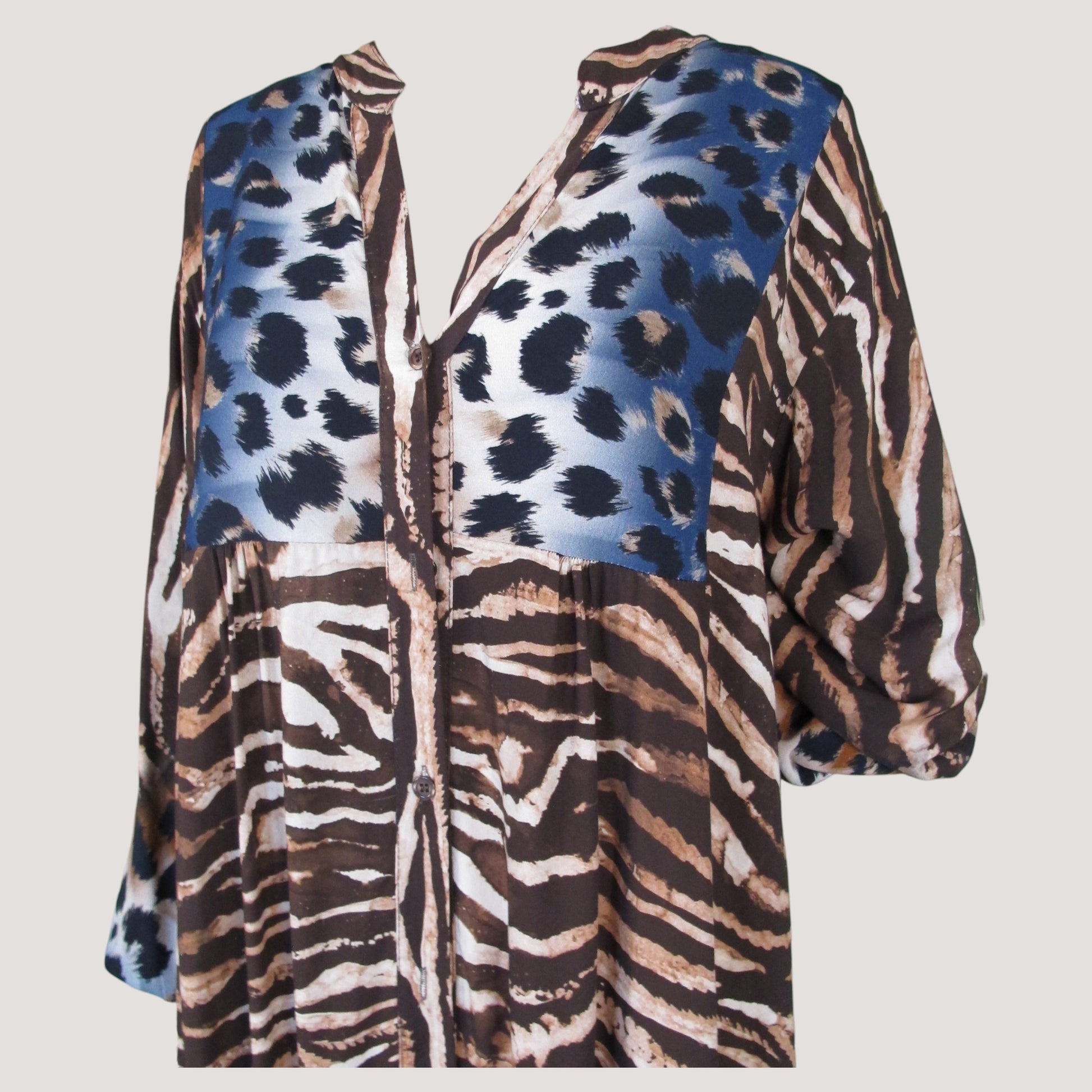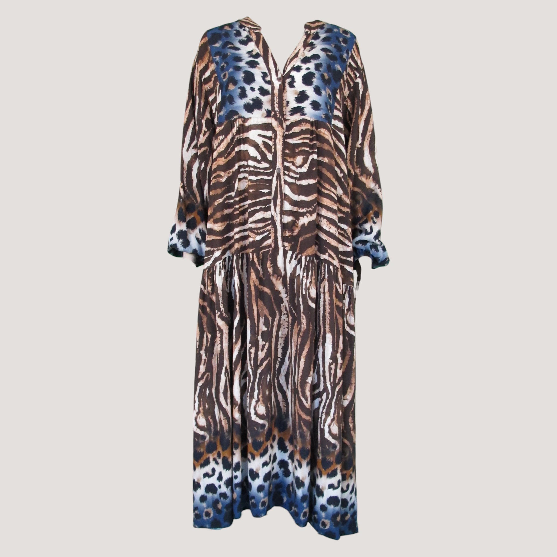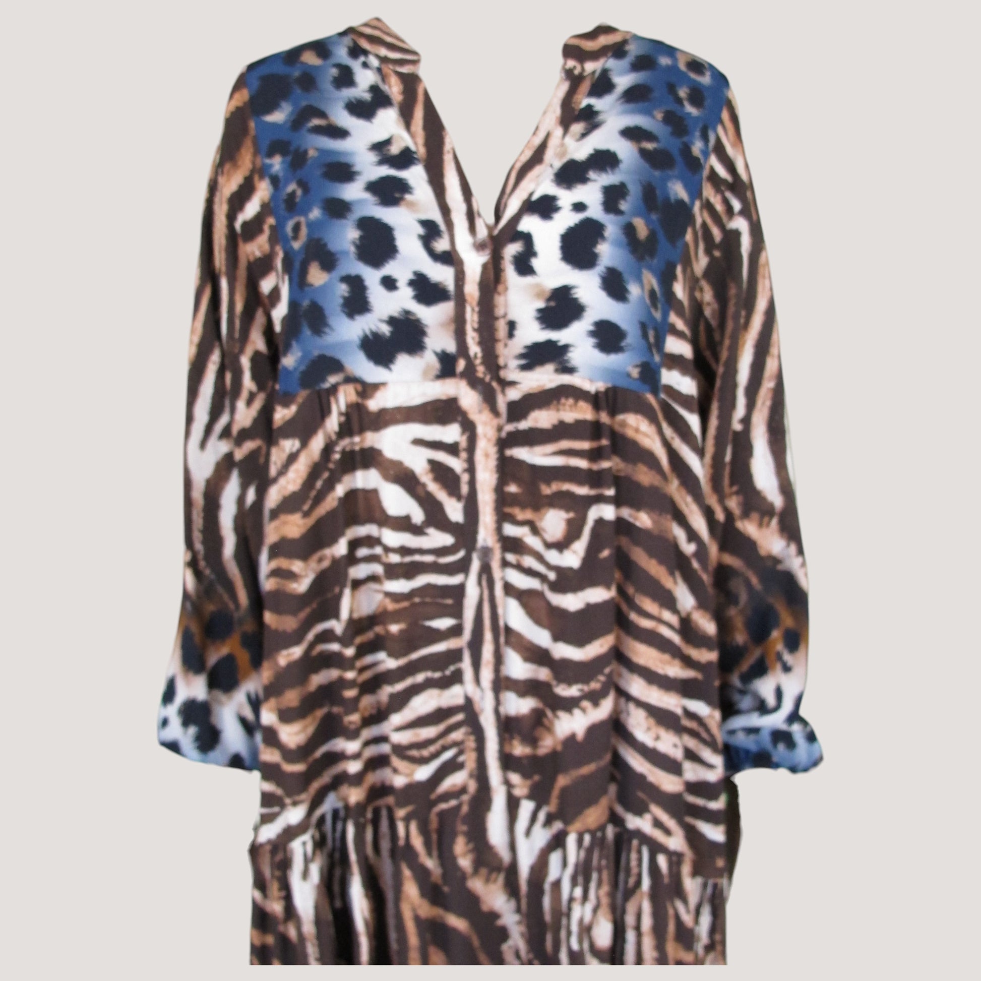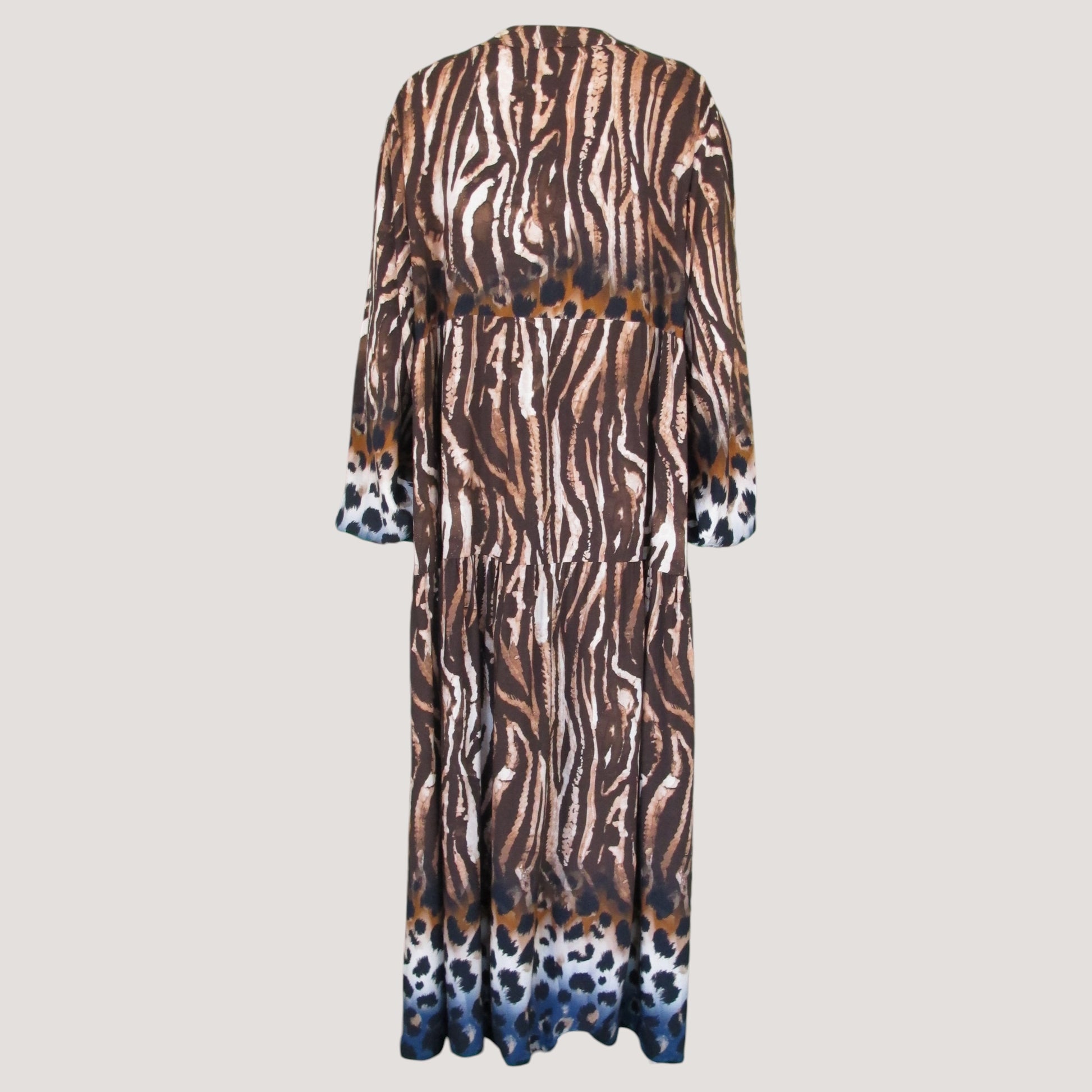 Lång mönstrad klänning med V- ringad hals och volang kant.