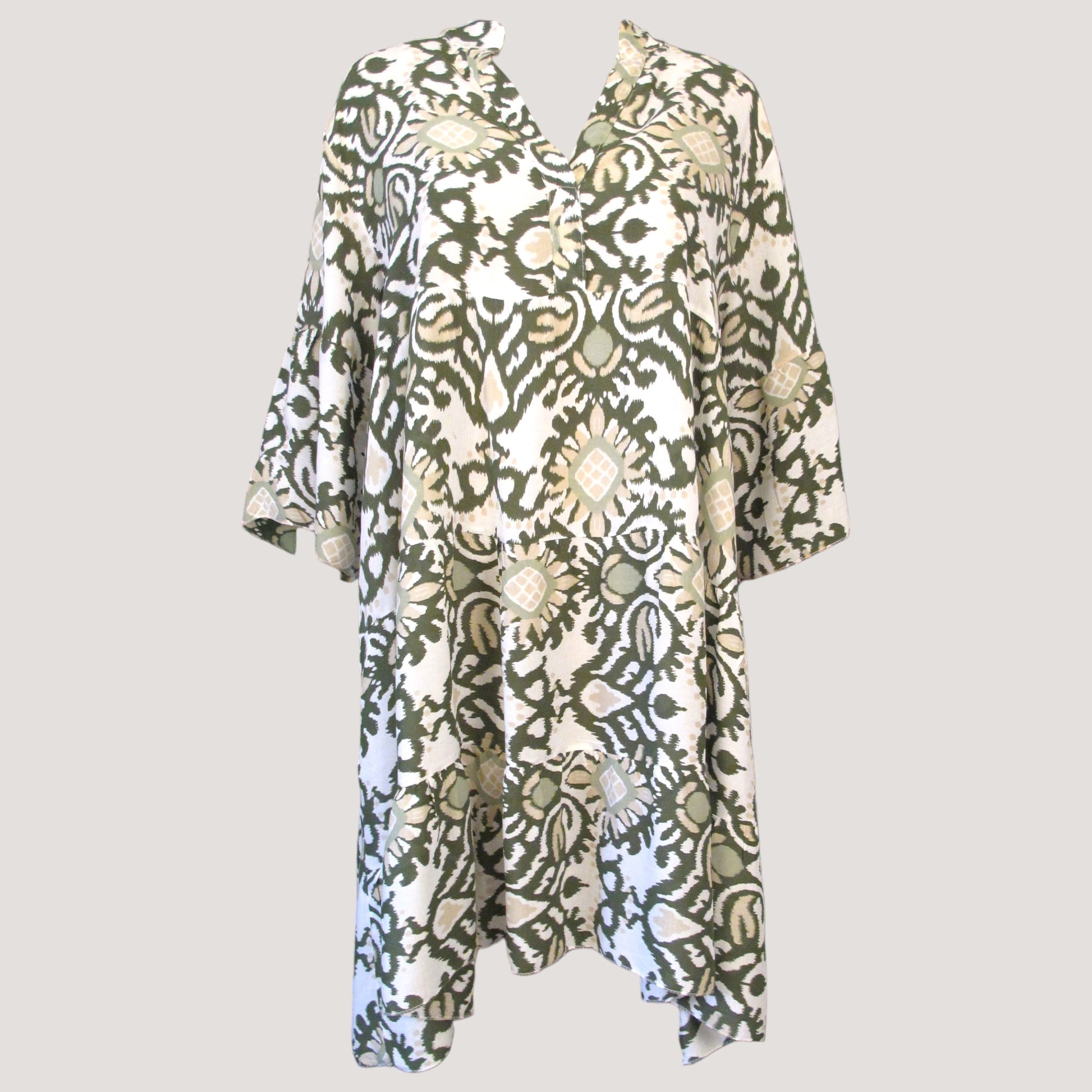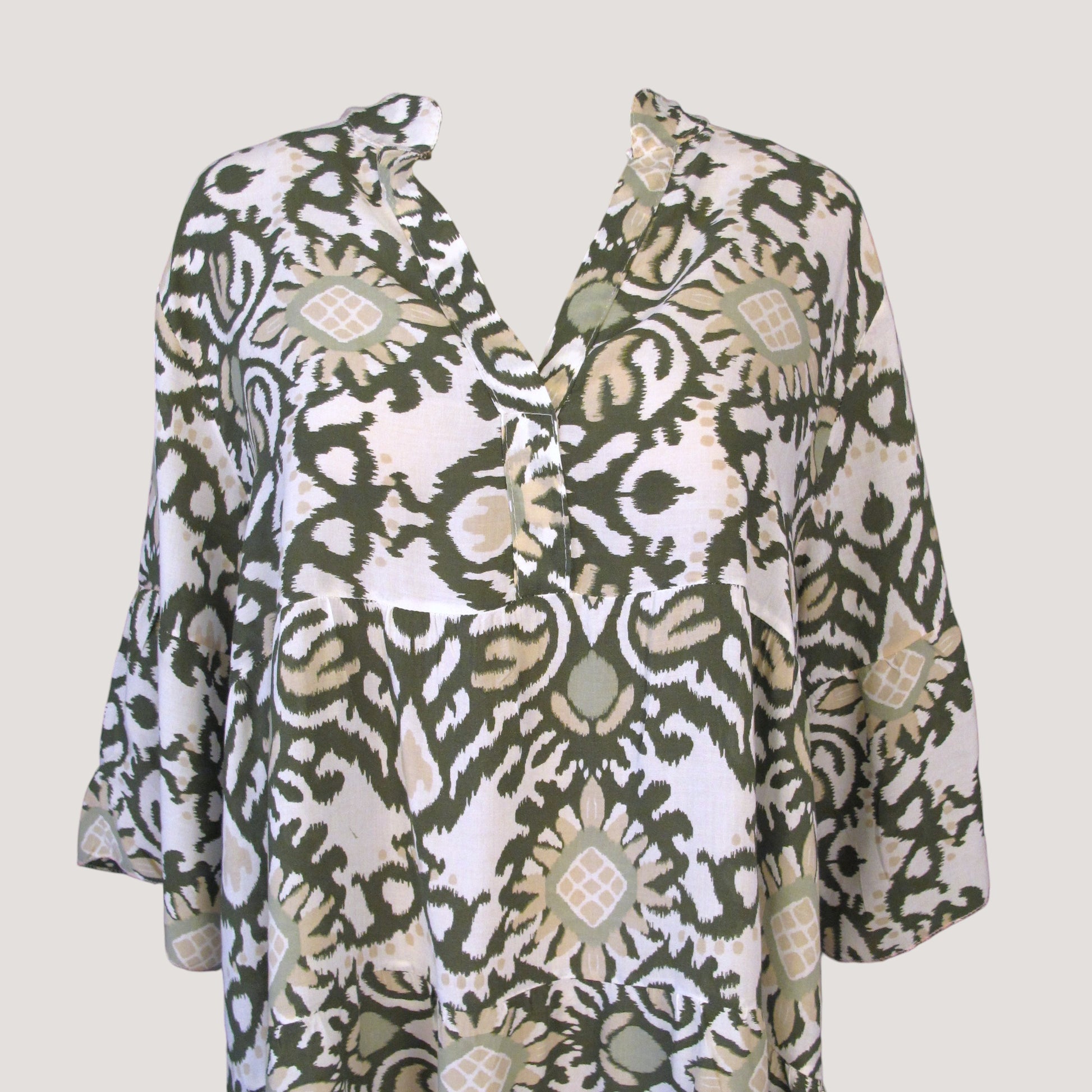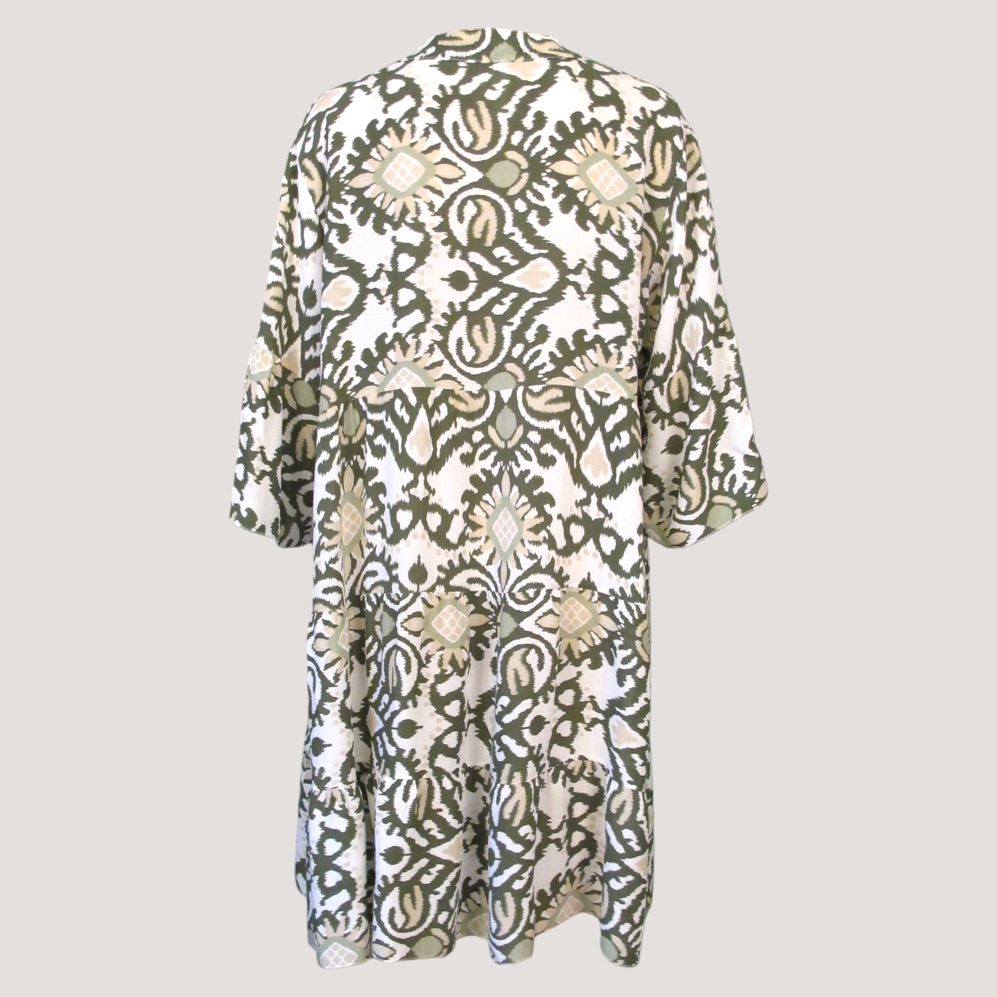Viskos klänning med V-ringad hals och knappar upp- framtill. Klänningen har en trekvarts arm med liten volang.