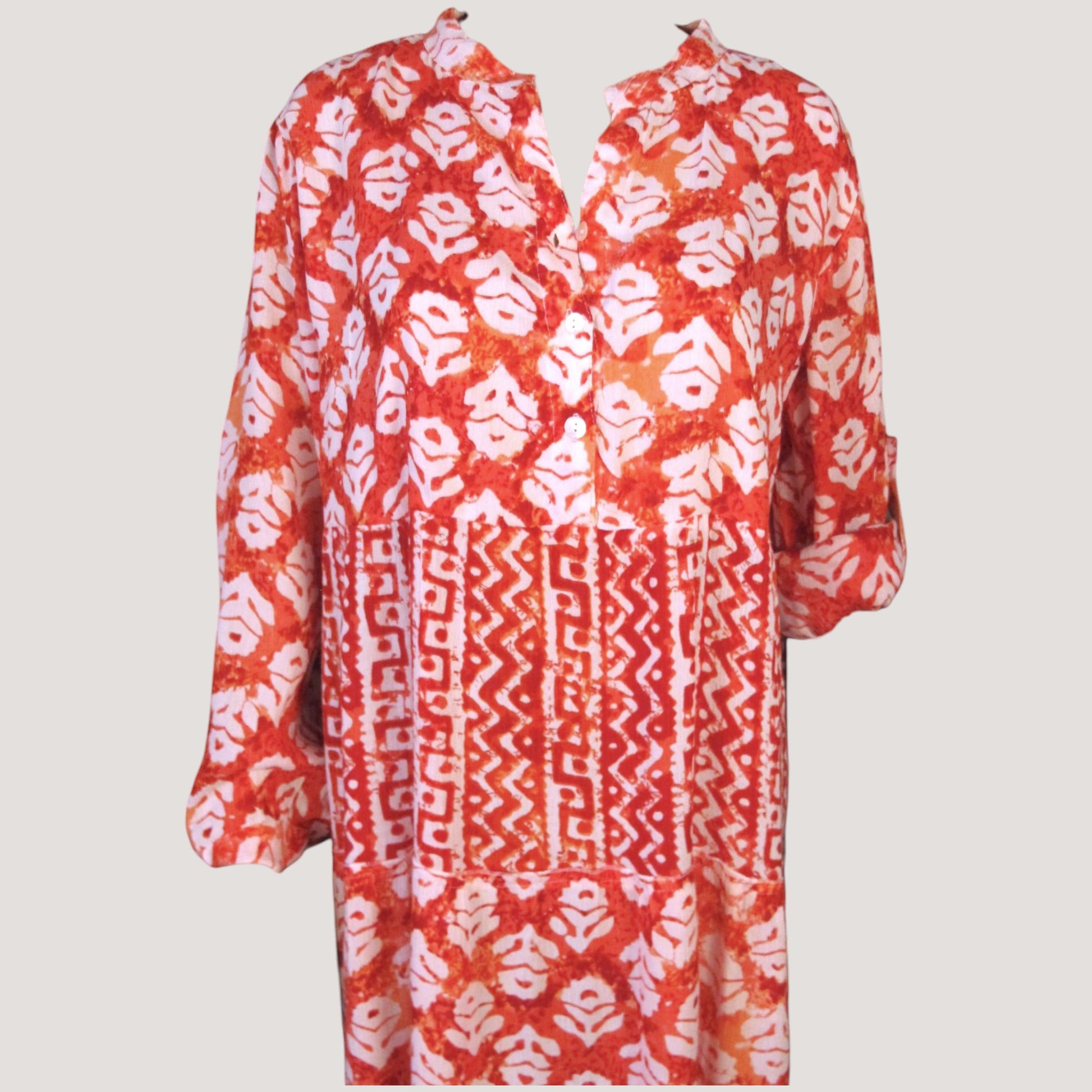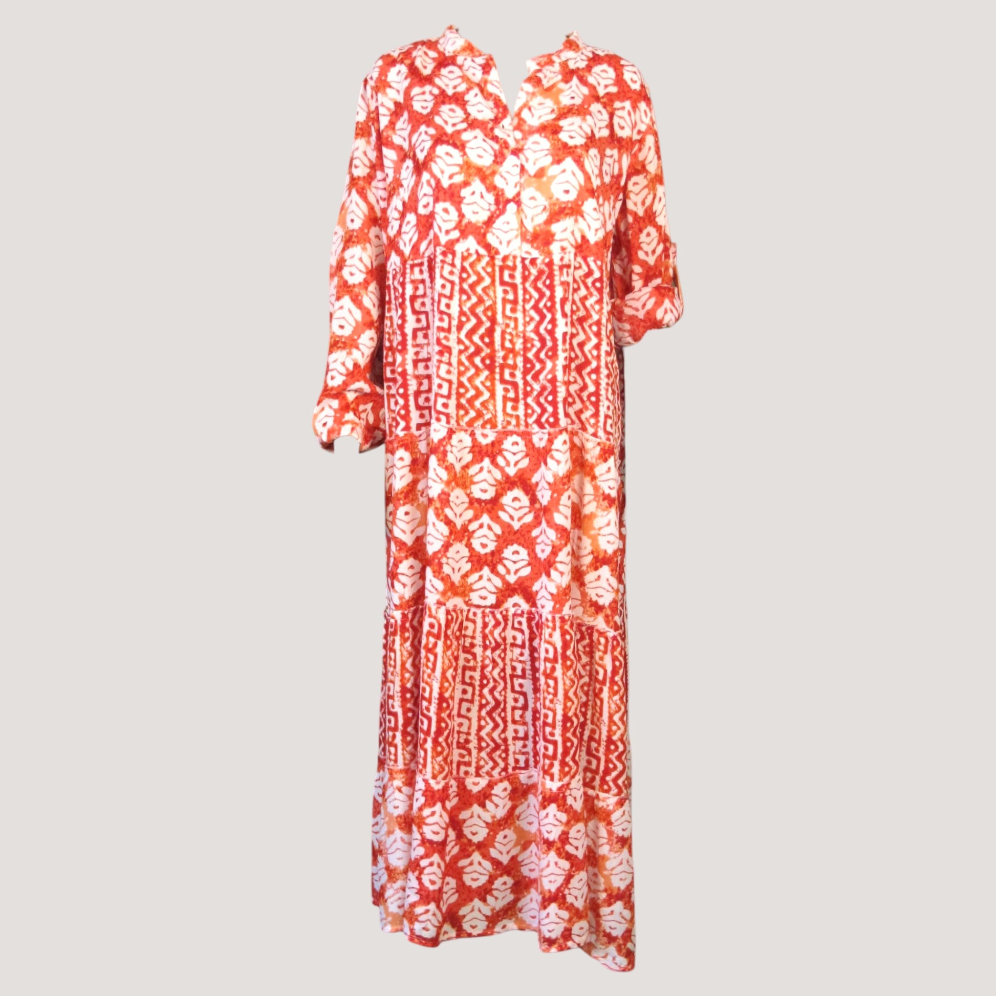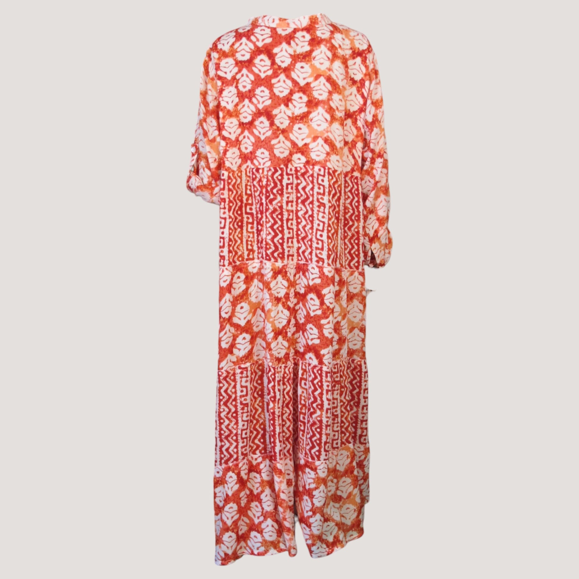 Mönstrad viskos klänning med knappar upptill och en fin krage. Hälla på armen med knapp för uppvikning.