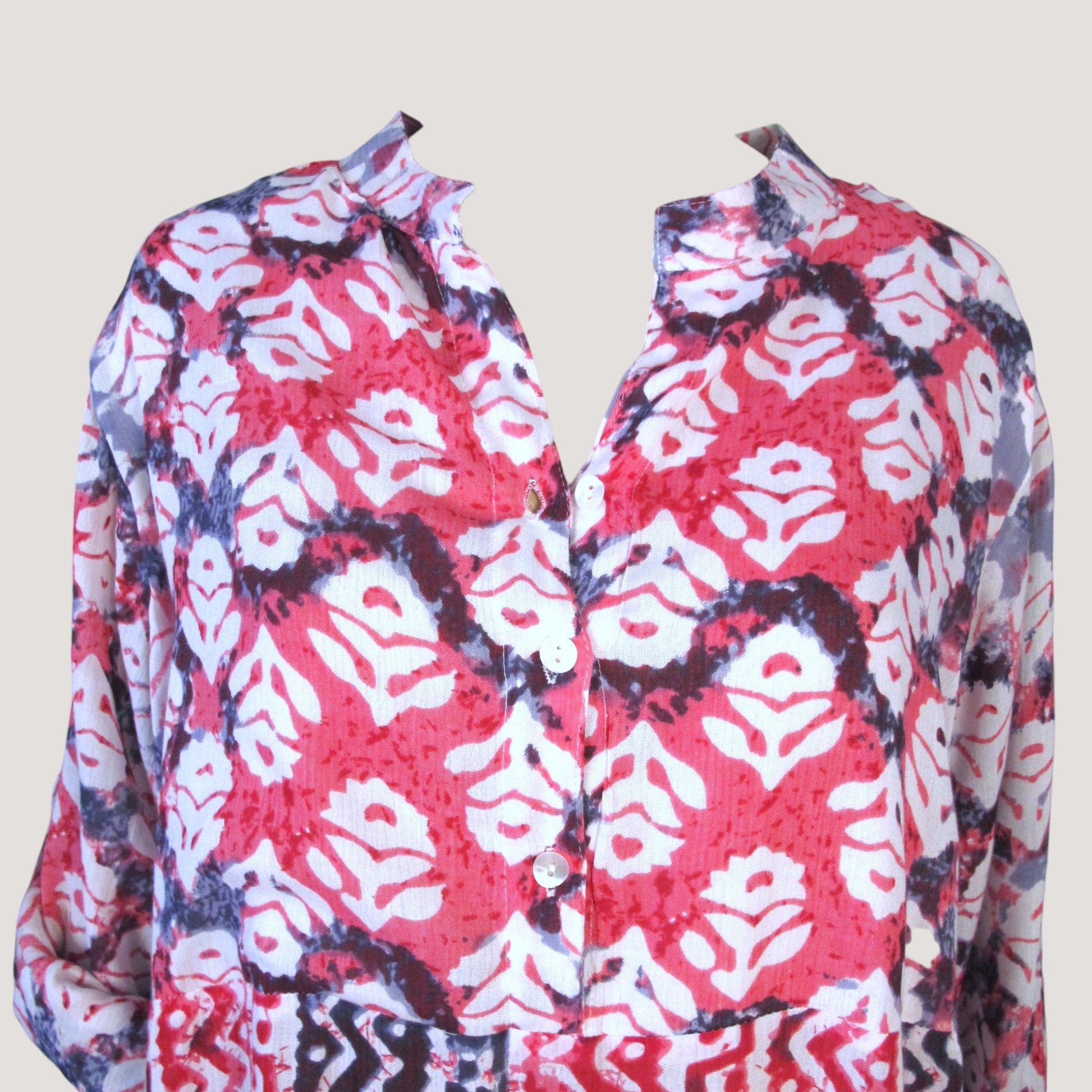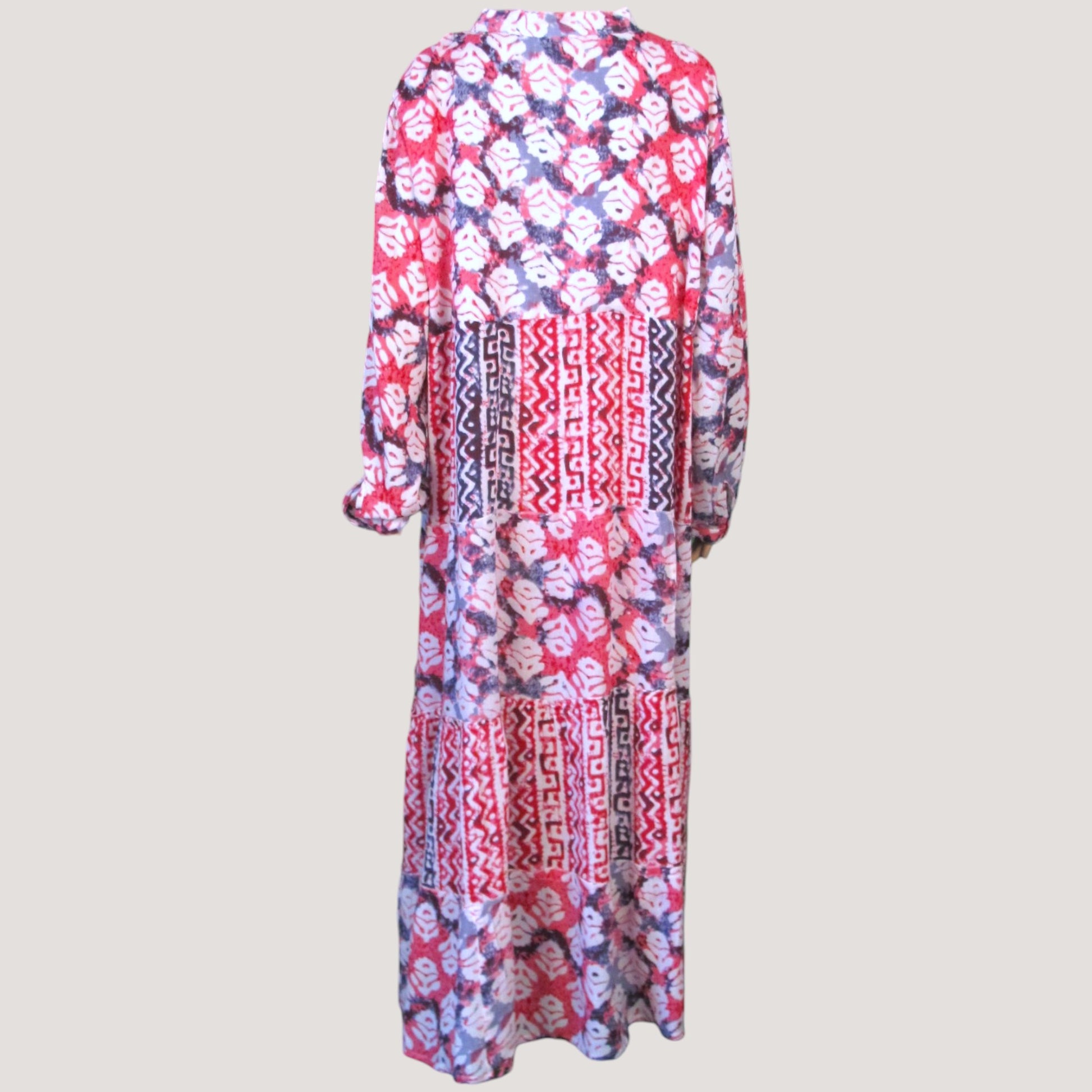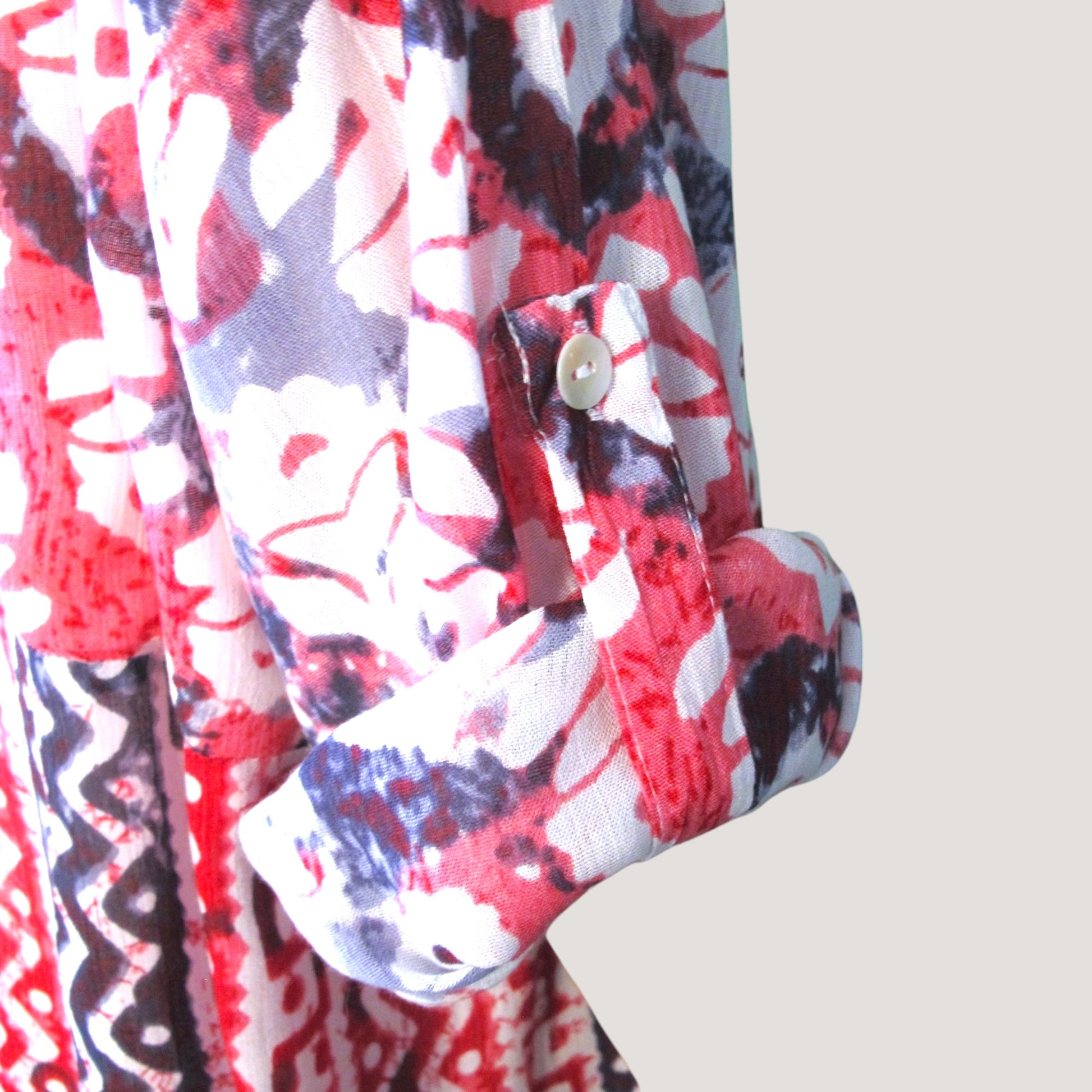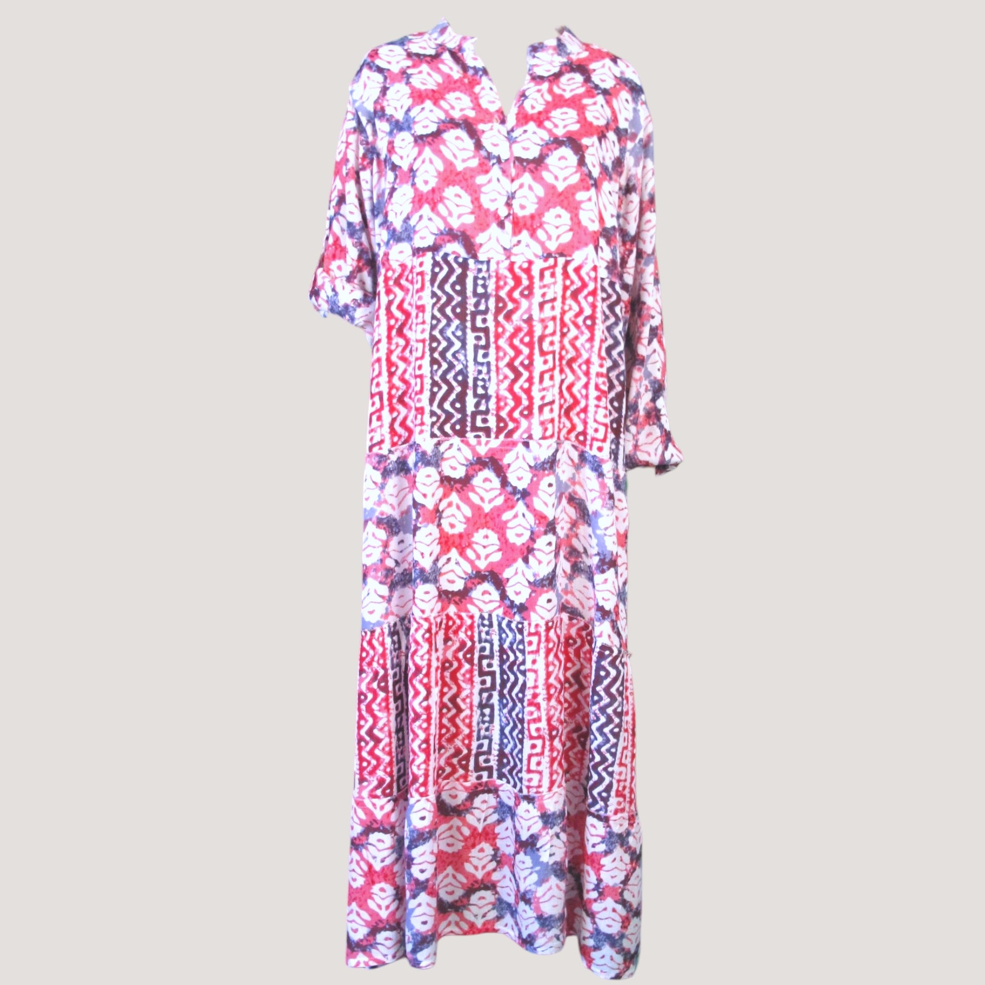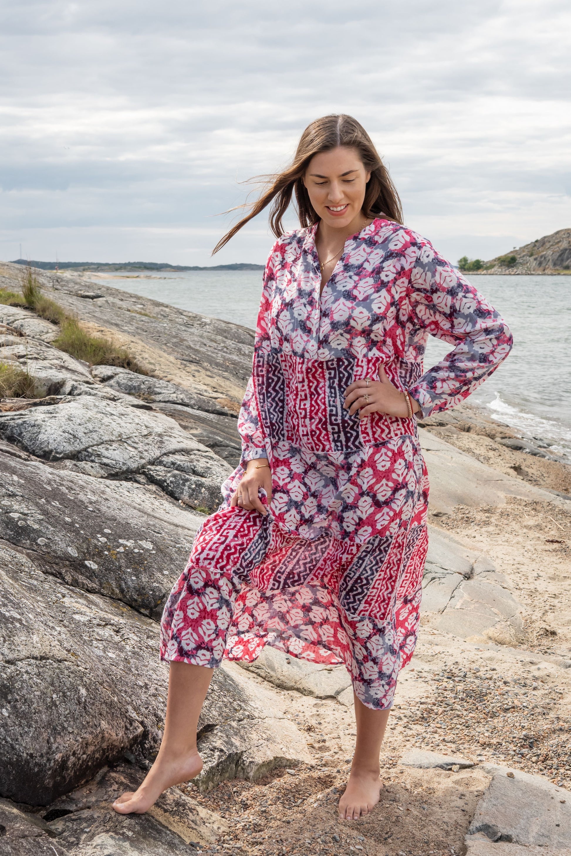 Mönstrad viskos klänning med knappar upptill och en fin krage. Hälla på armen med knapp för uppvikning.