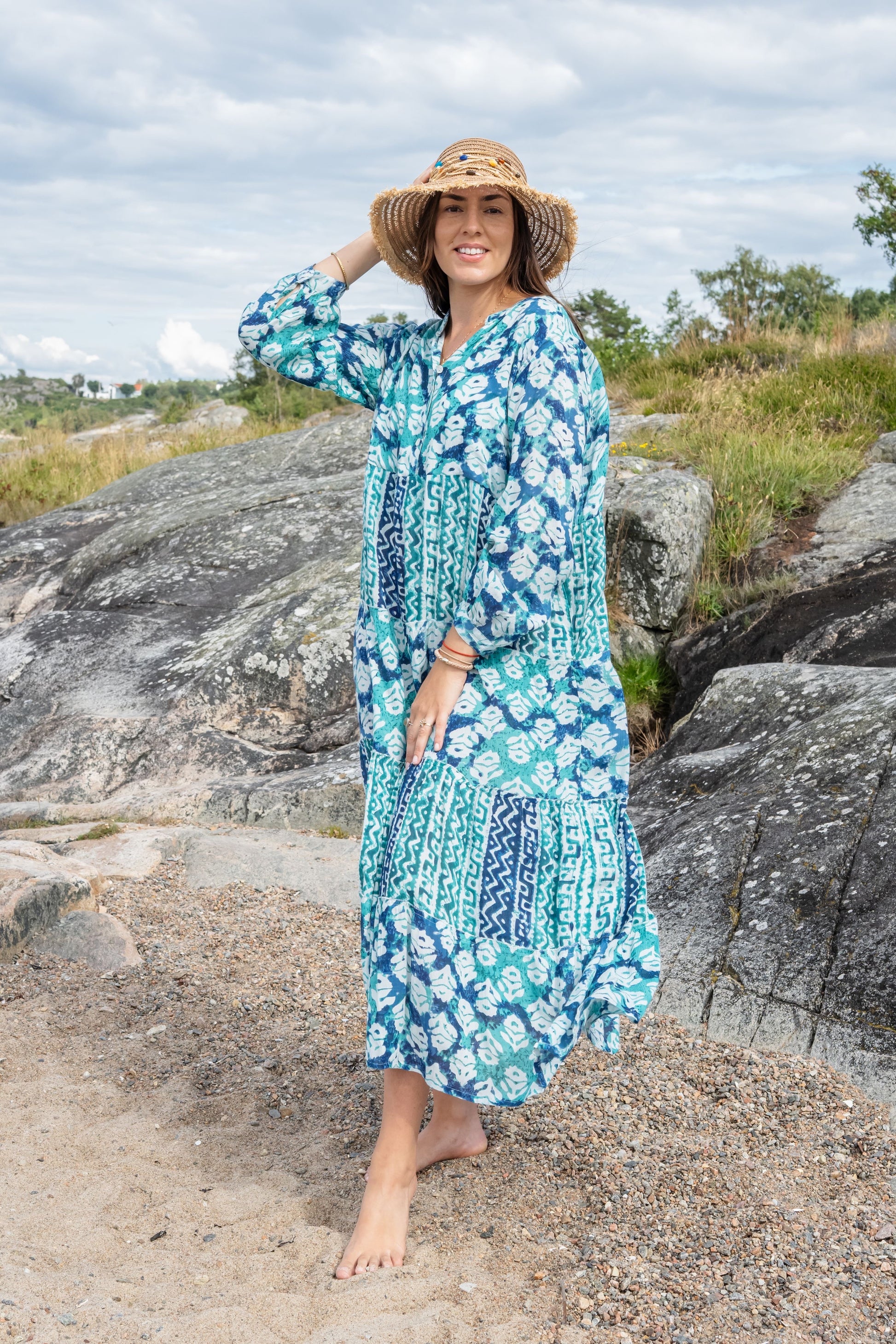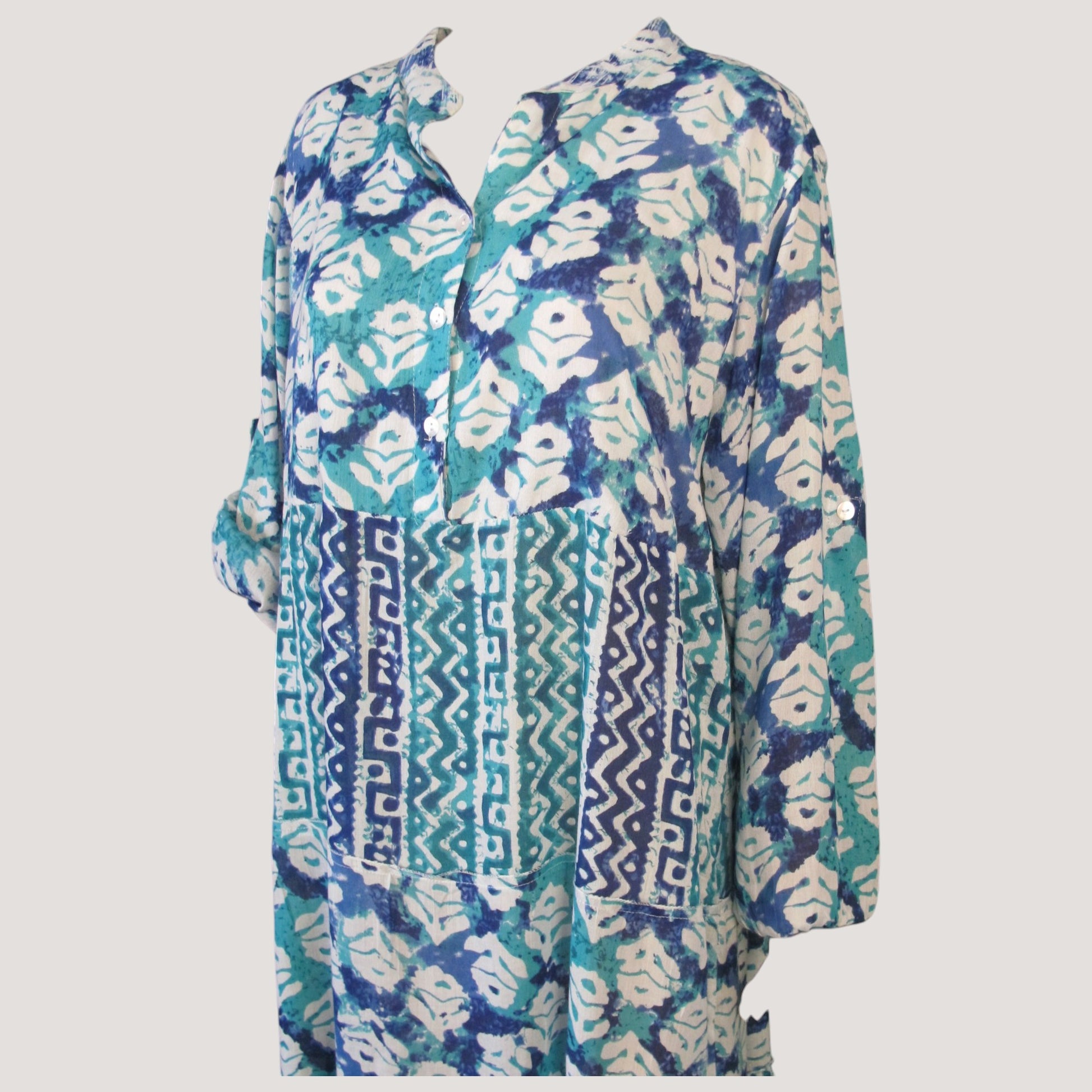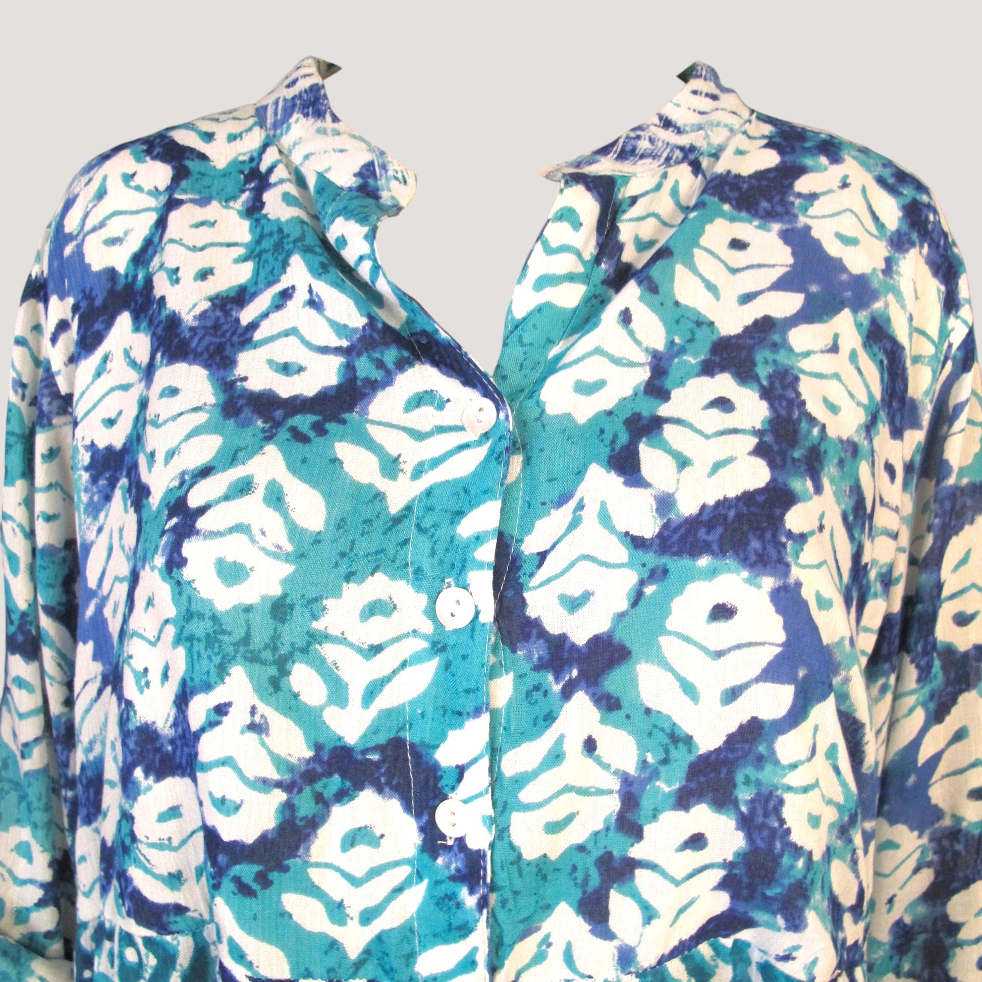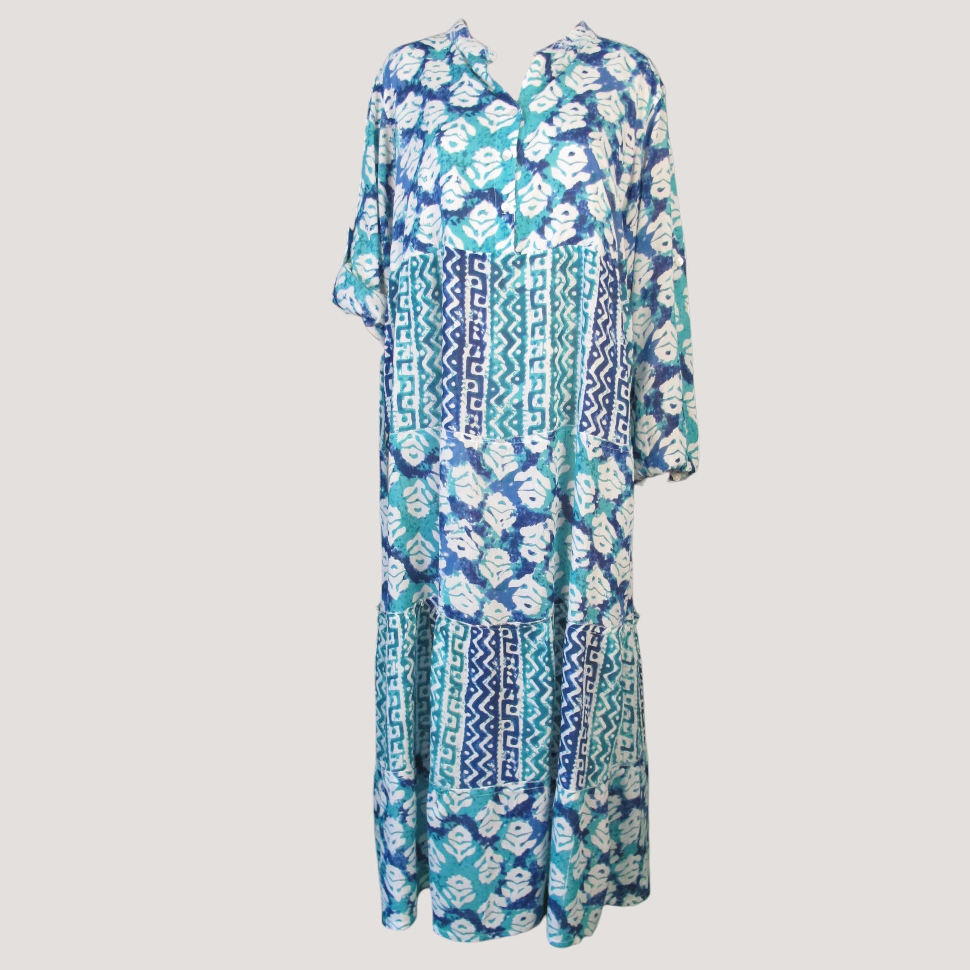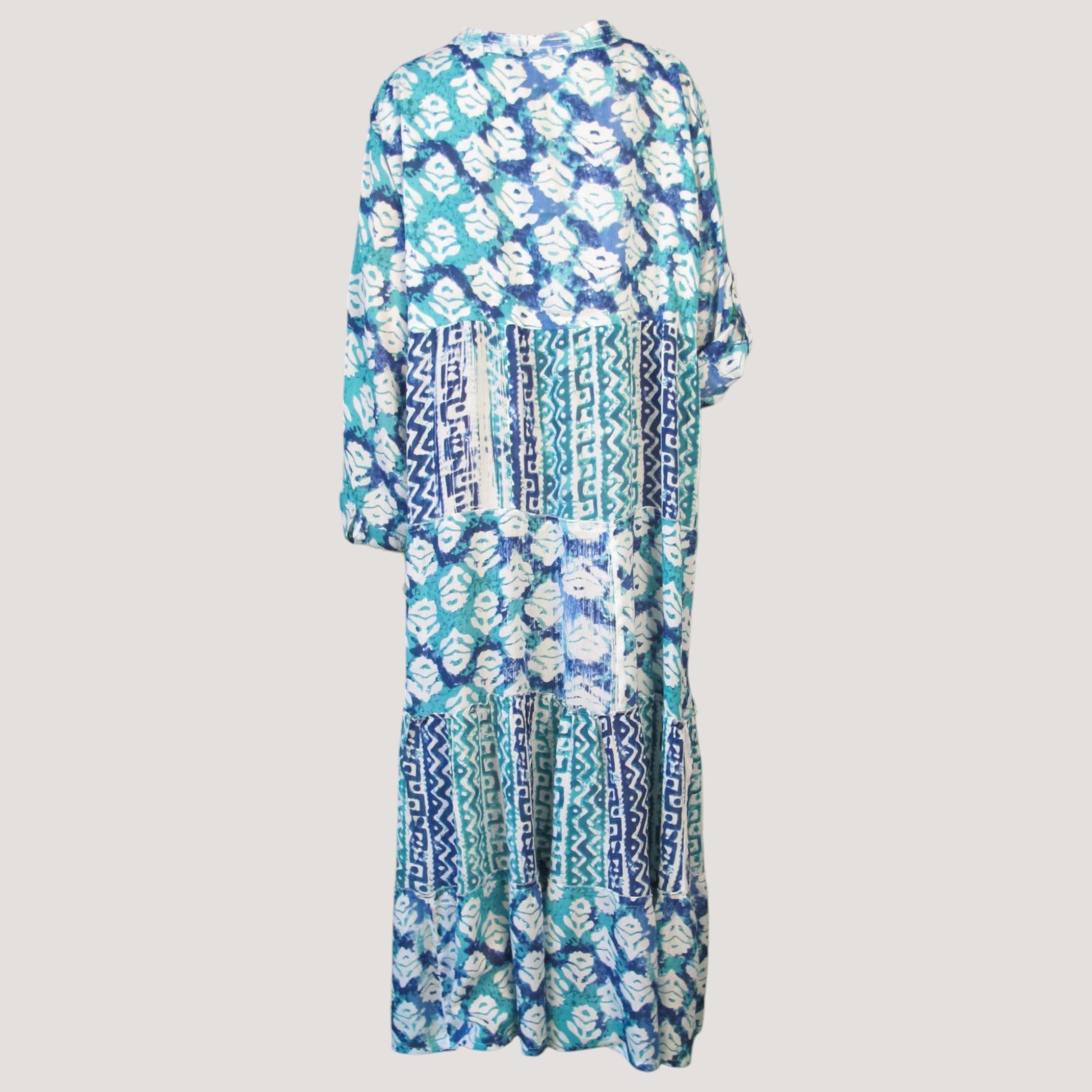 Mönstrad viskos klänning med knappar upptill och en fin krage. Hälla på armen med knapp för uppvikning.