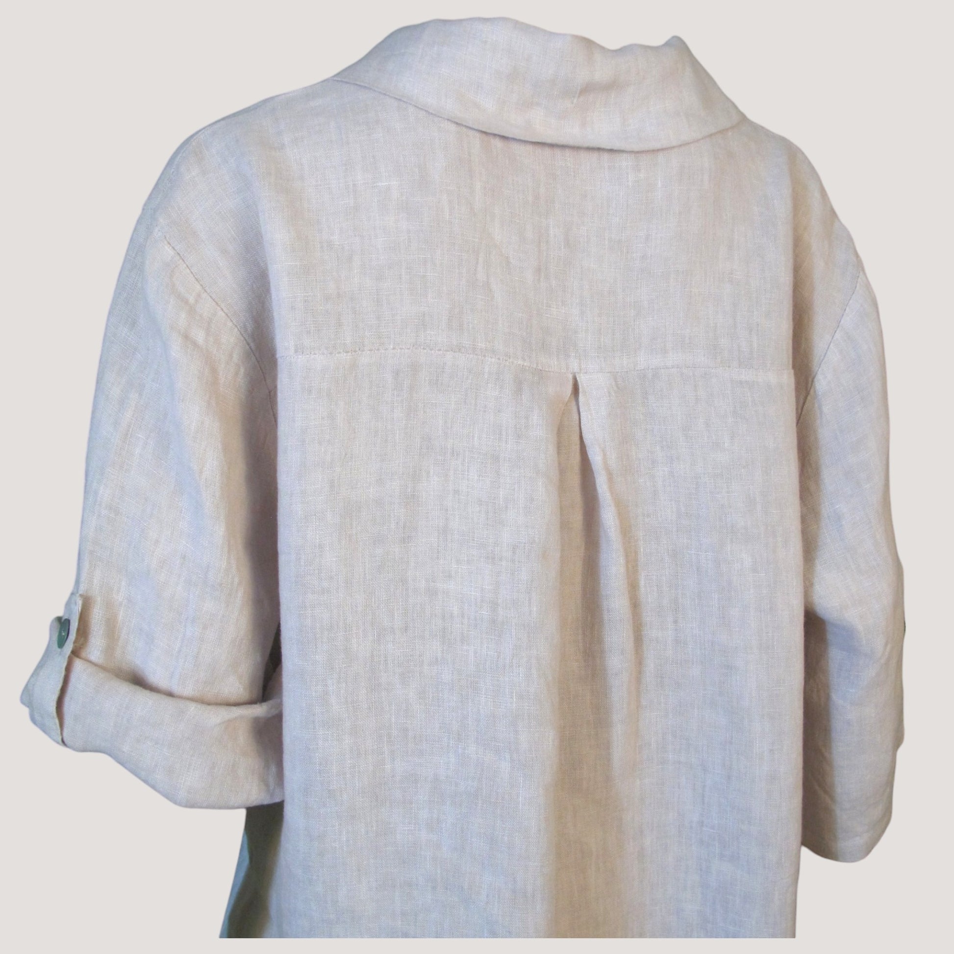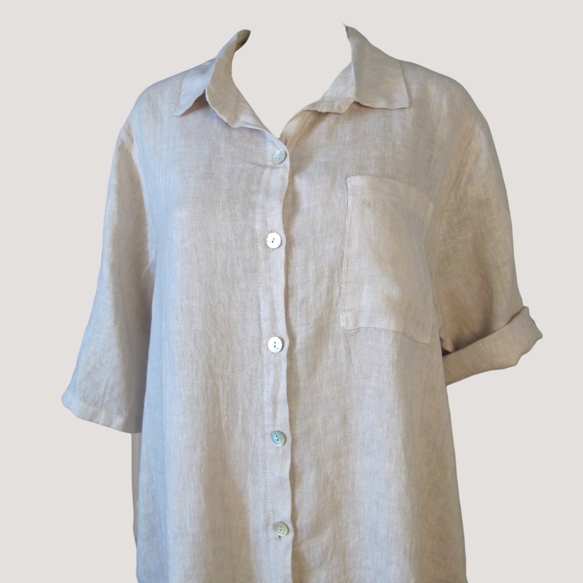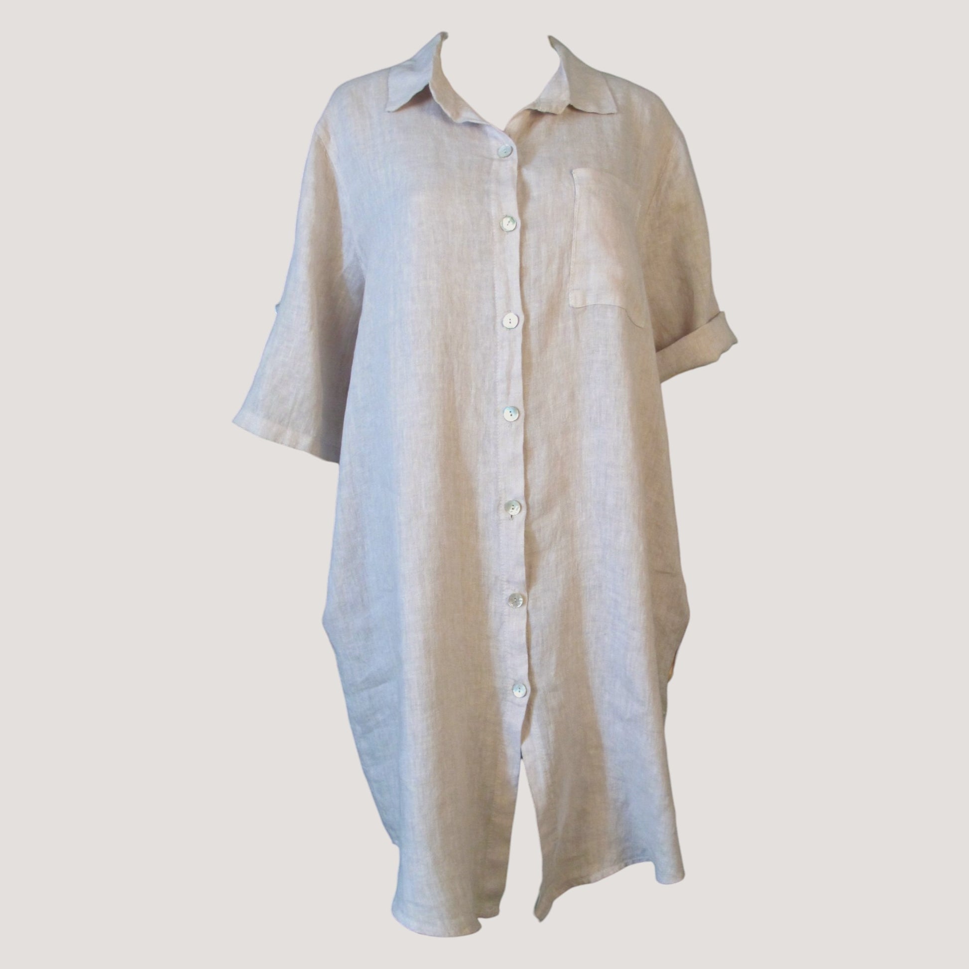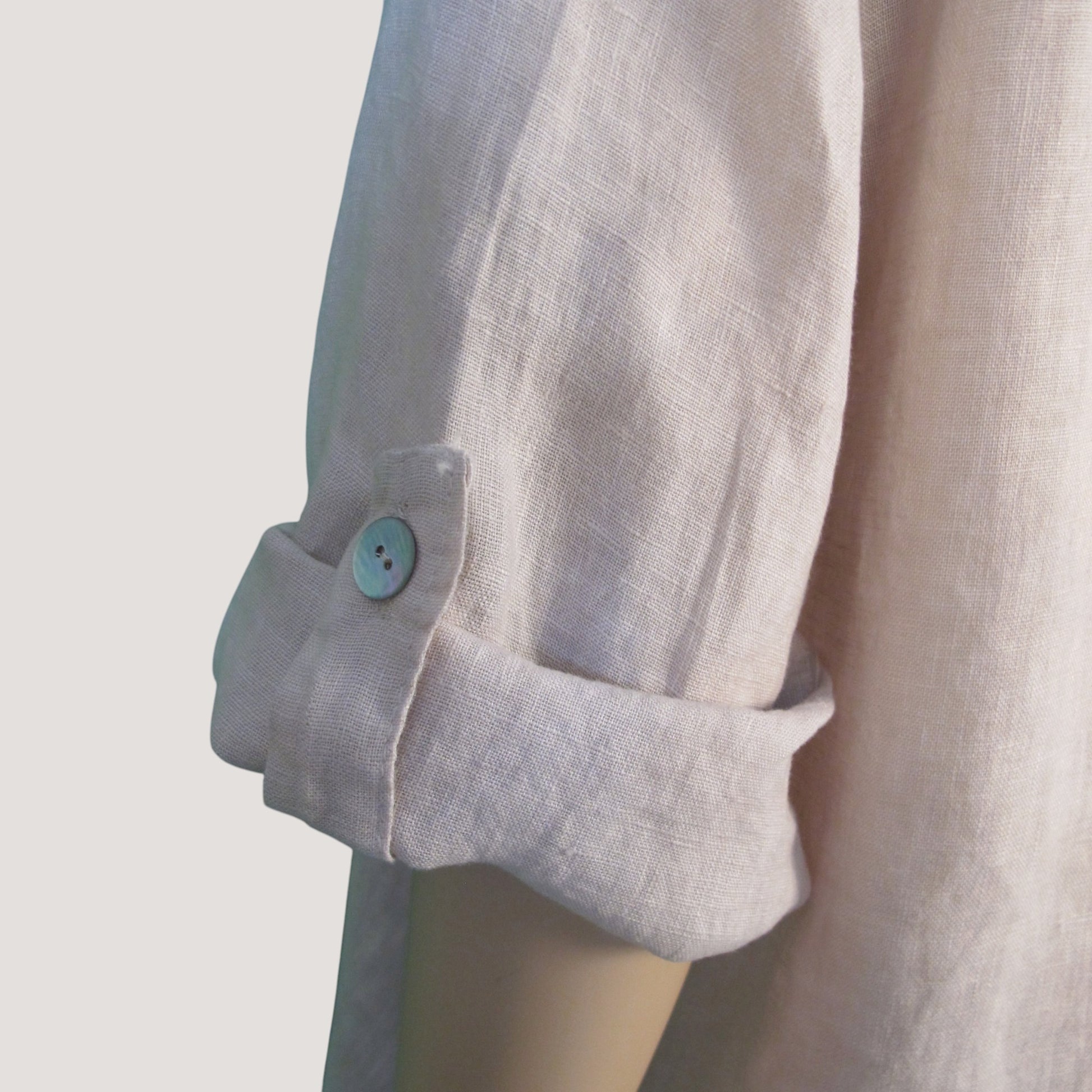 Linne skjorta/ klänning med knappar hela vägen på framsidan. Bröstficka och fickor på båda sidor, arm kan antingen has nere eller vikas upp med hjälp av fålla.