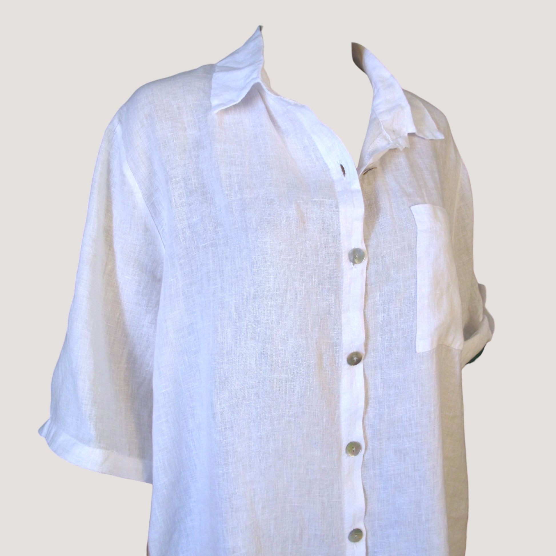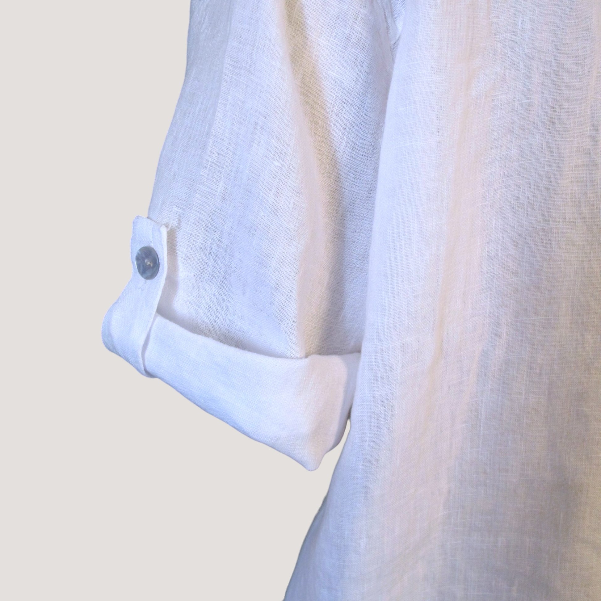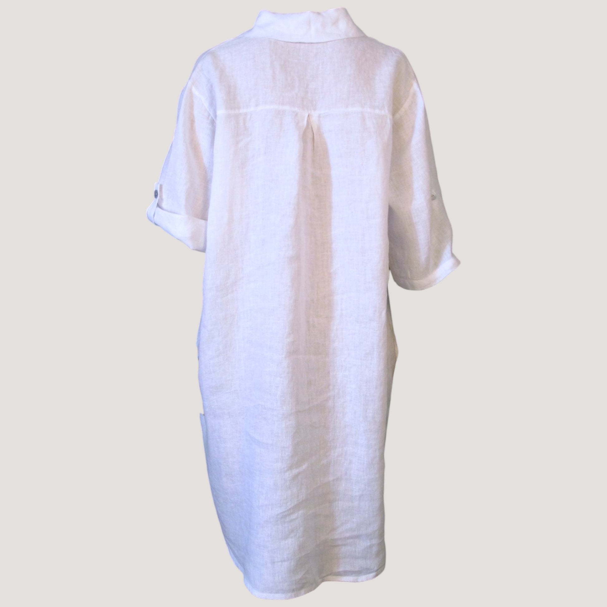 Linne skjorta/ klänning med knappar hela vägen på framsidan. Bröstficka och fickor på båda sidor, Arm kan antingen has nere eller vikas upp med hjälp av fålla.