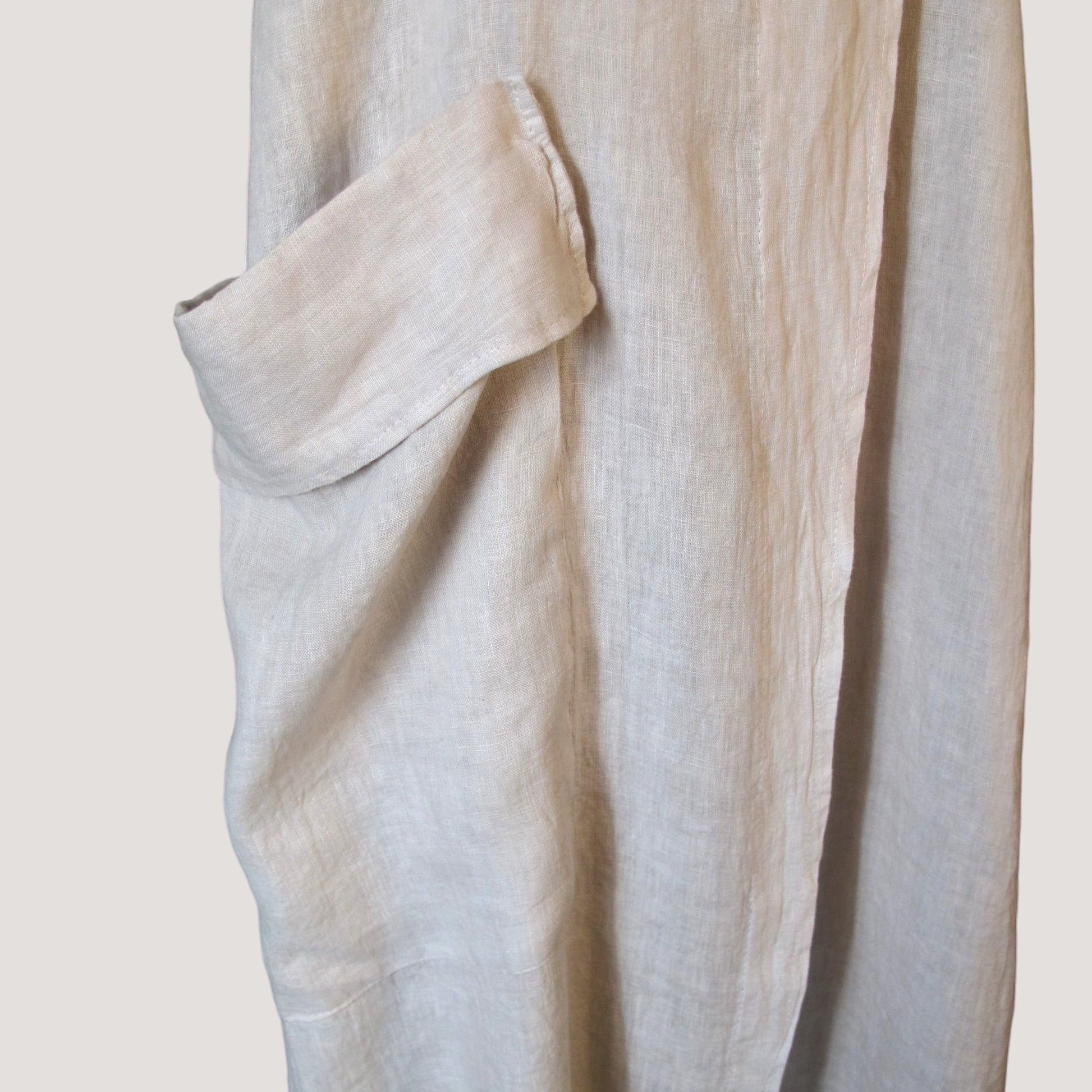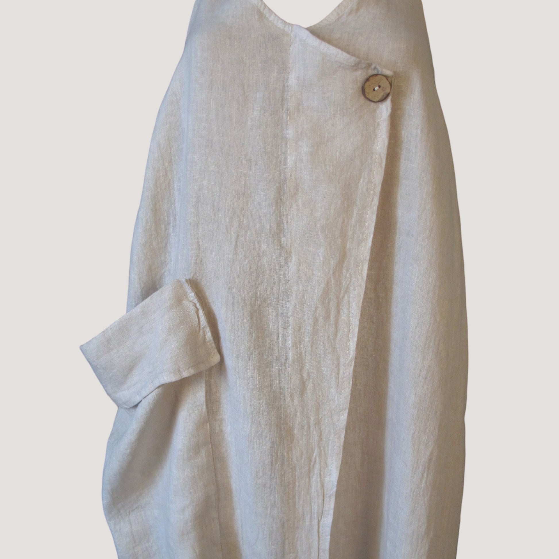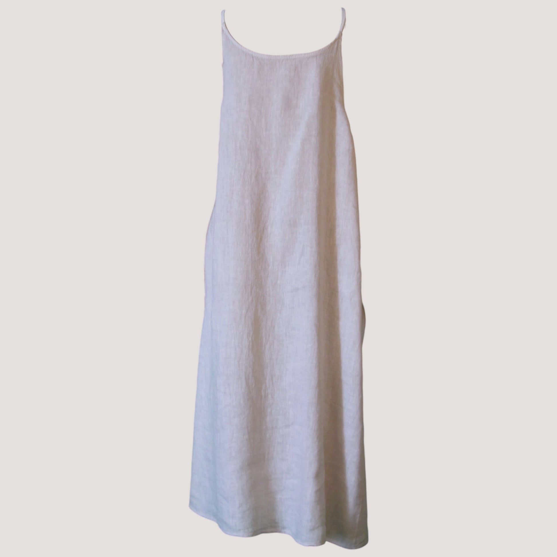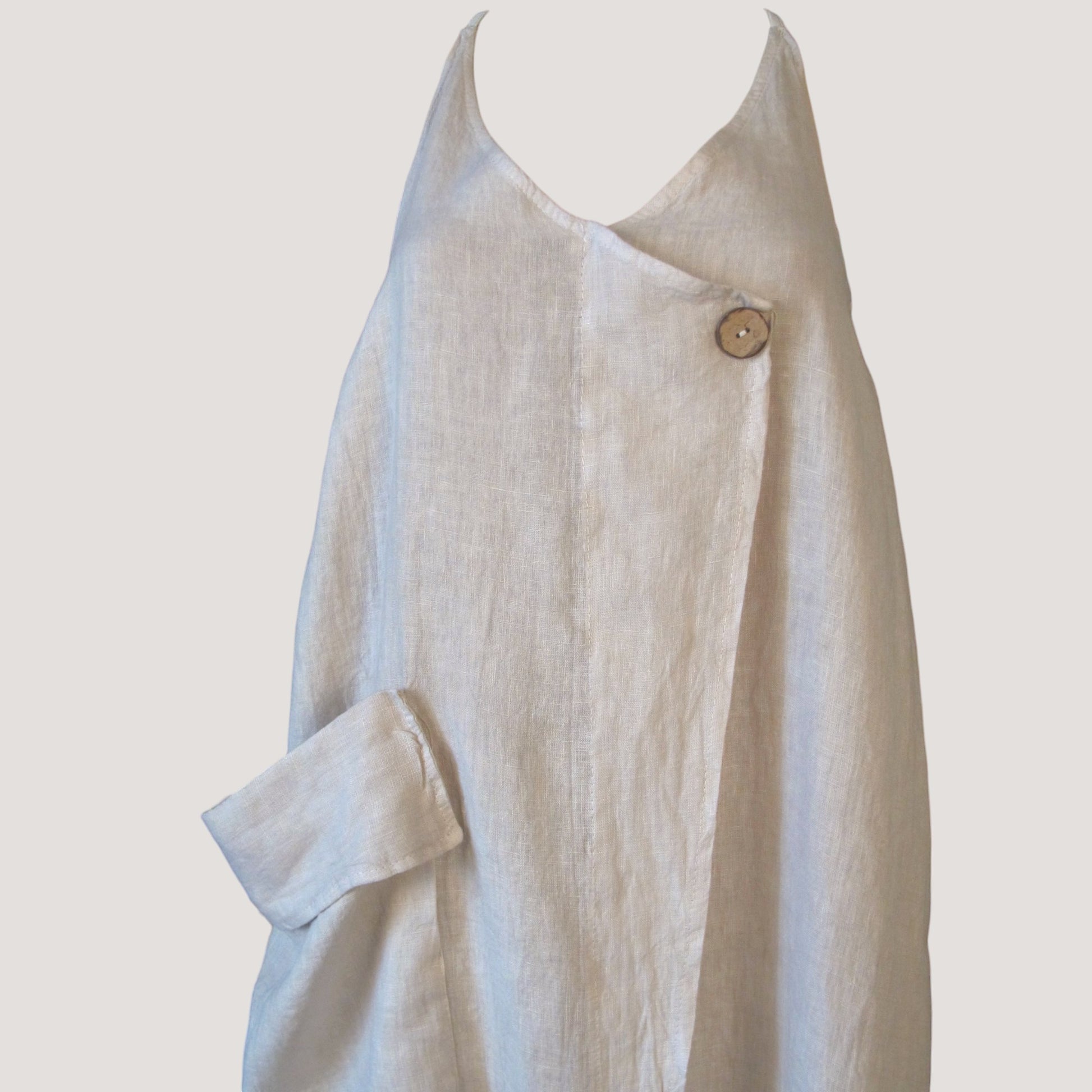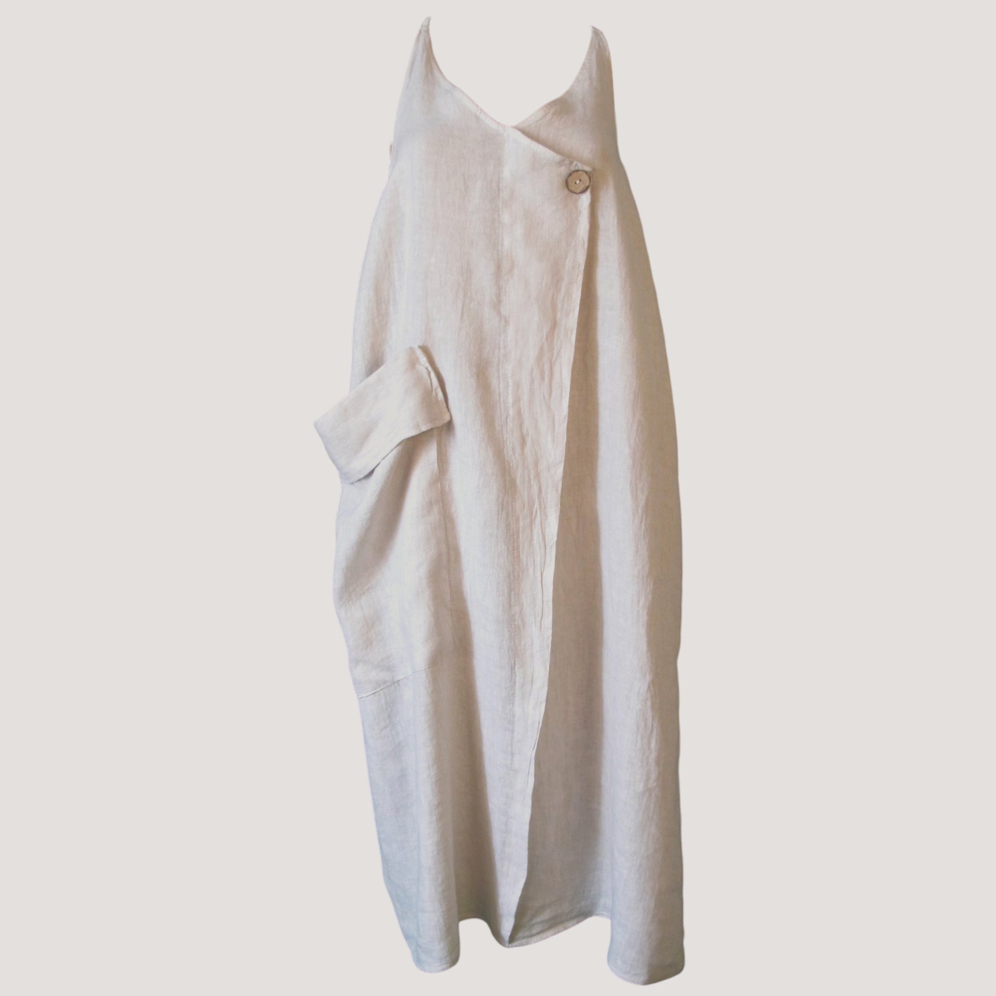 Lång sned skuren linne klänning med fina detaljer så som stor ficka på framsidan, trä knapp upptill och tunna reglerbara band.