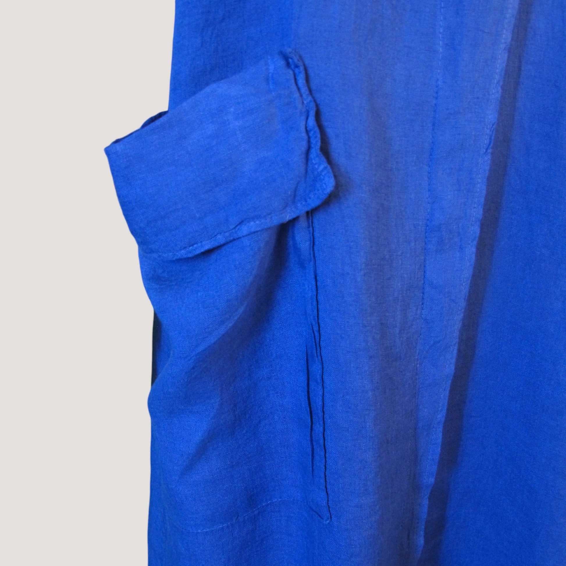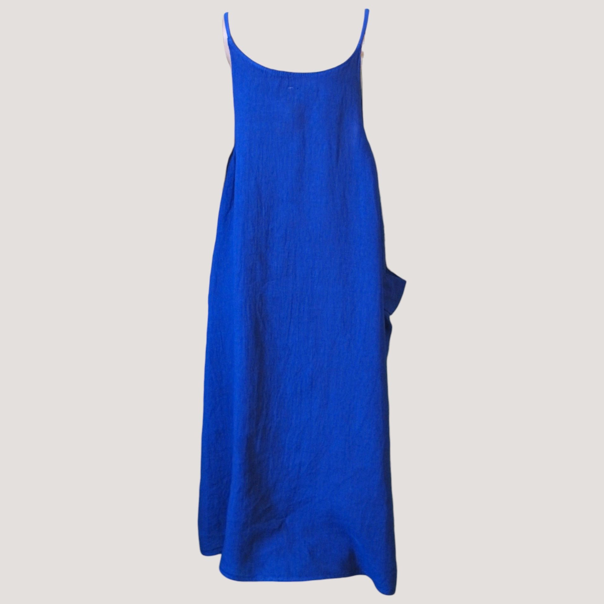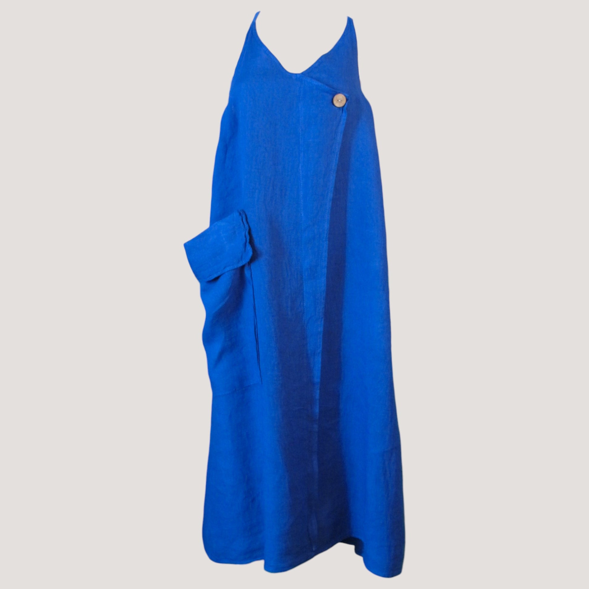 Lång sned skuren linne klänning med fina detaljer så som stor ficka på framsidan, trä knapp upptill och tunna reglerbara band.
