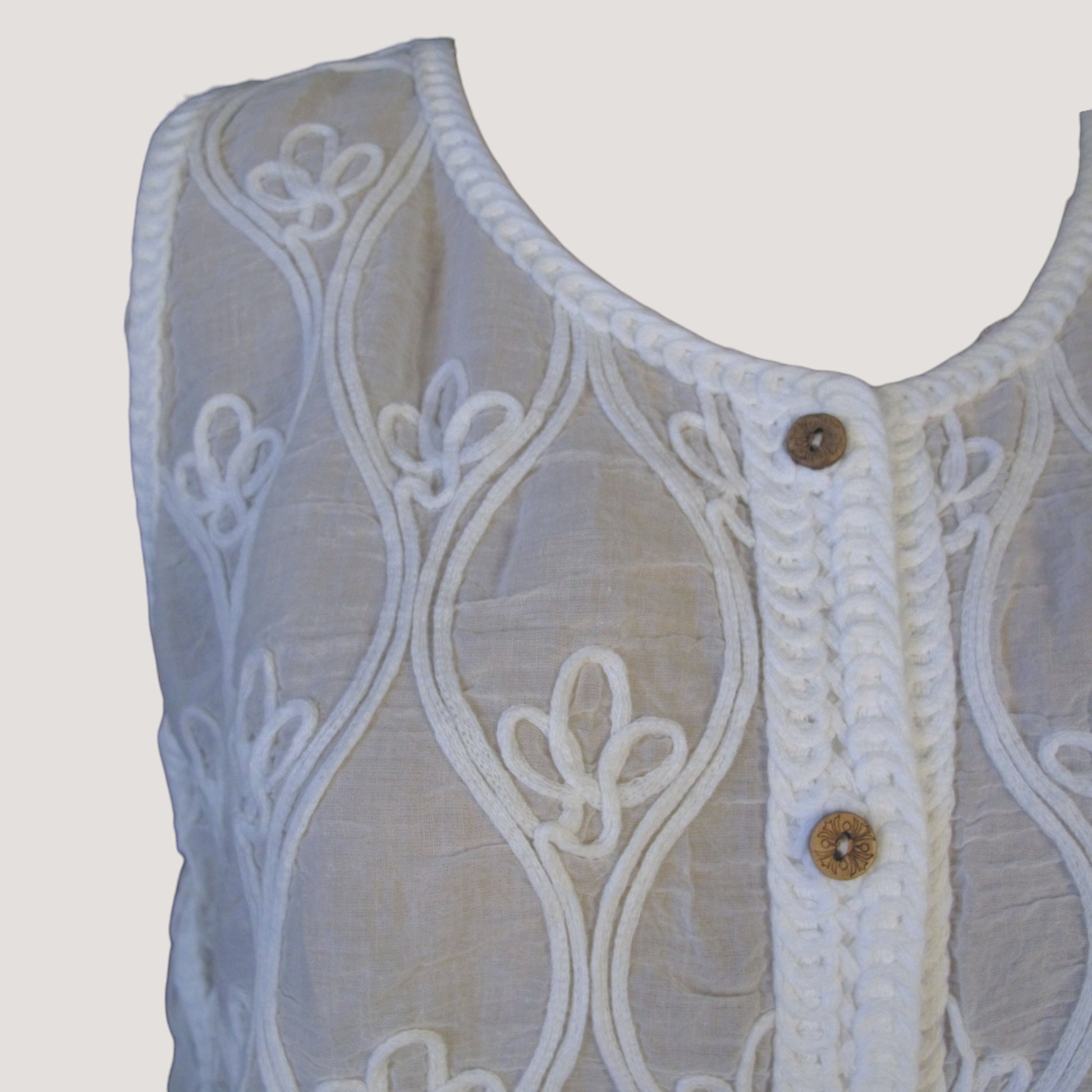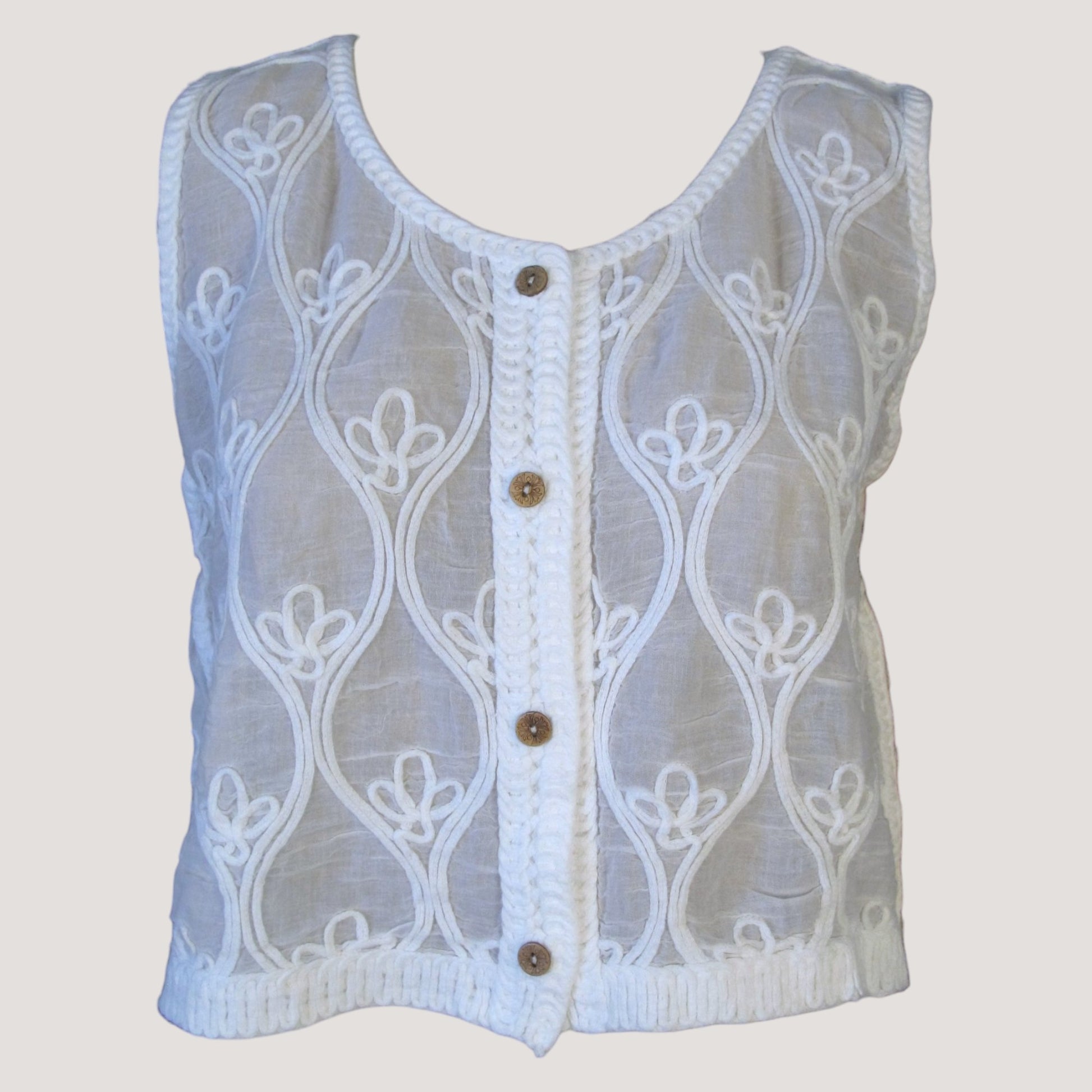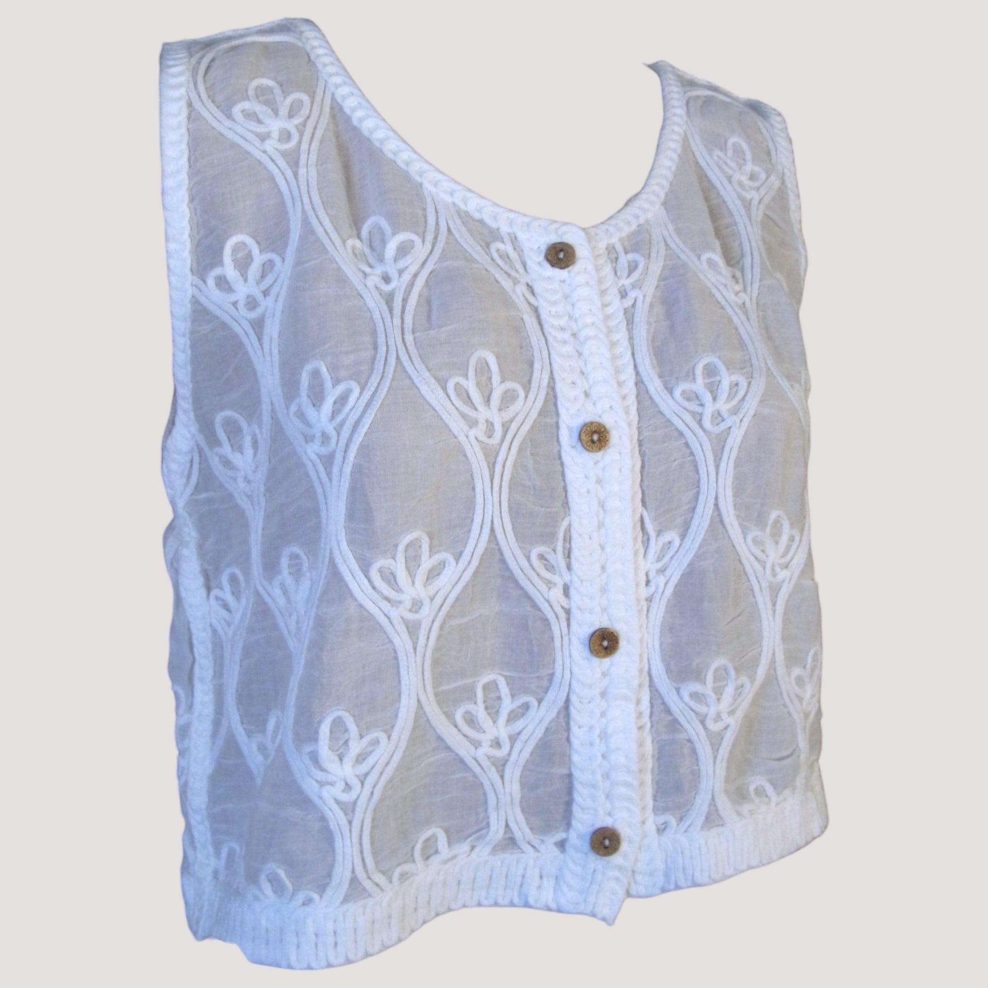 Vit mönster broderad väst i bomull med trä knappar framtill.