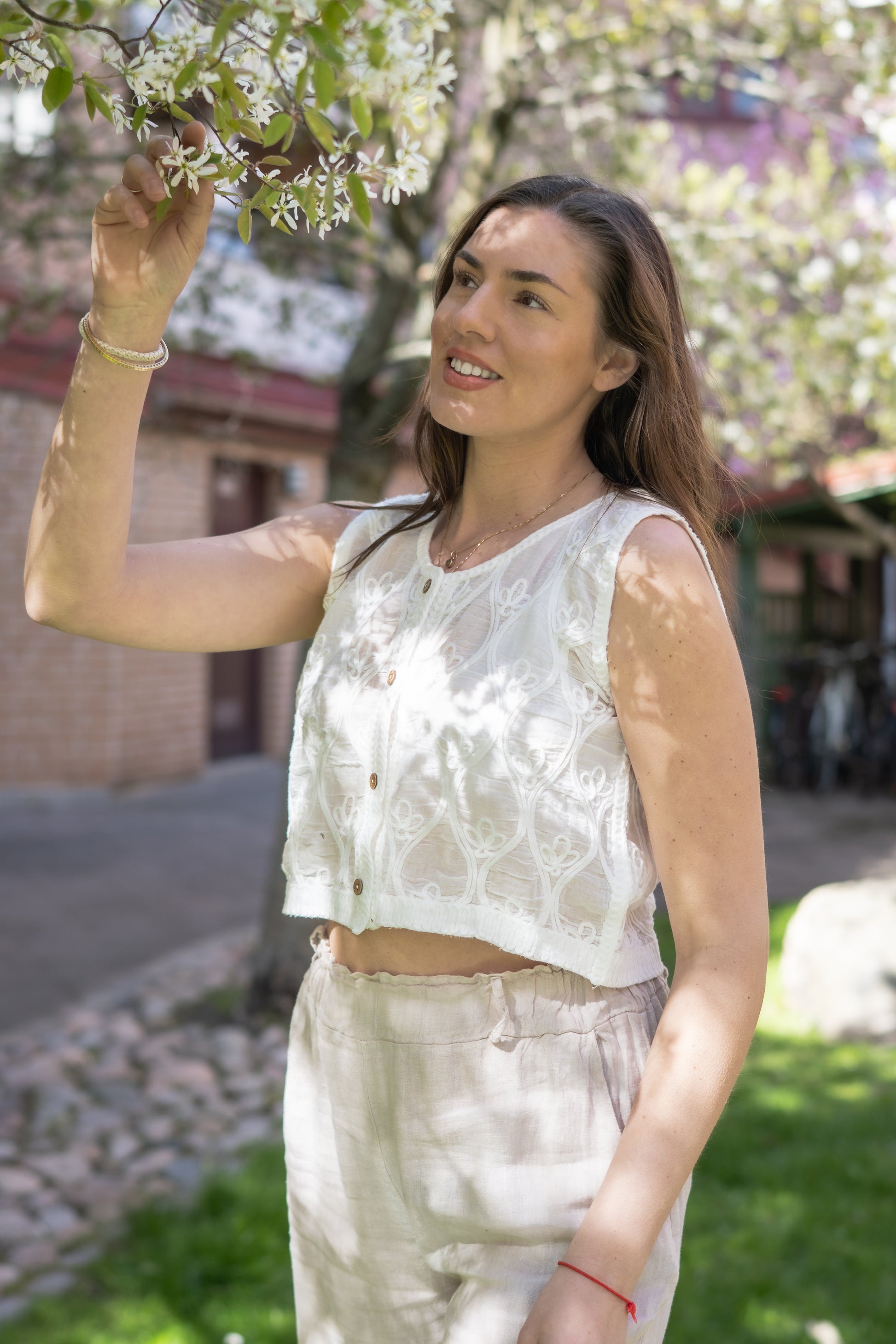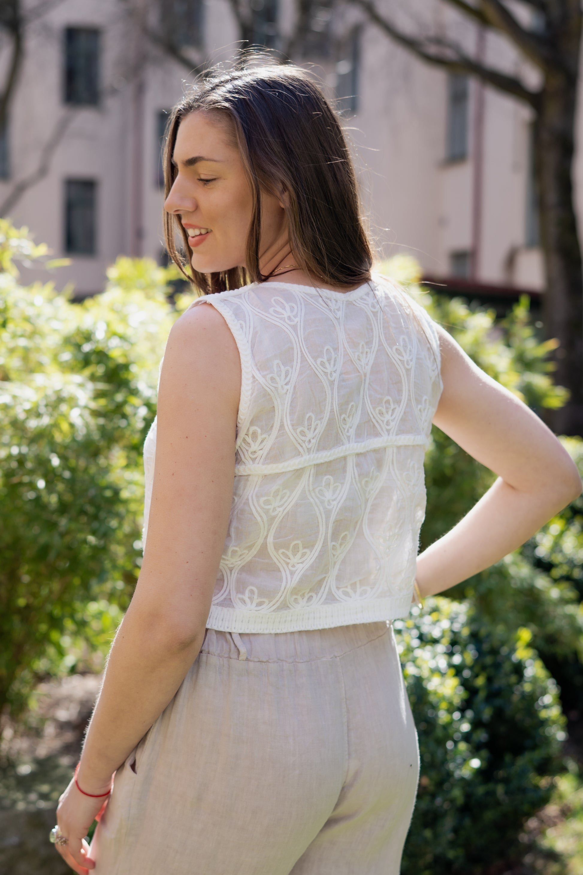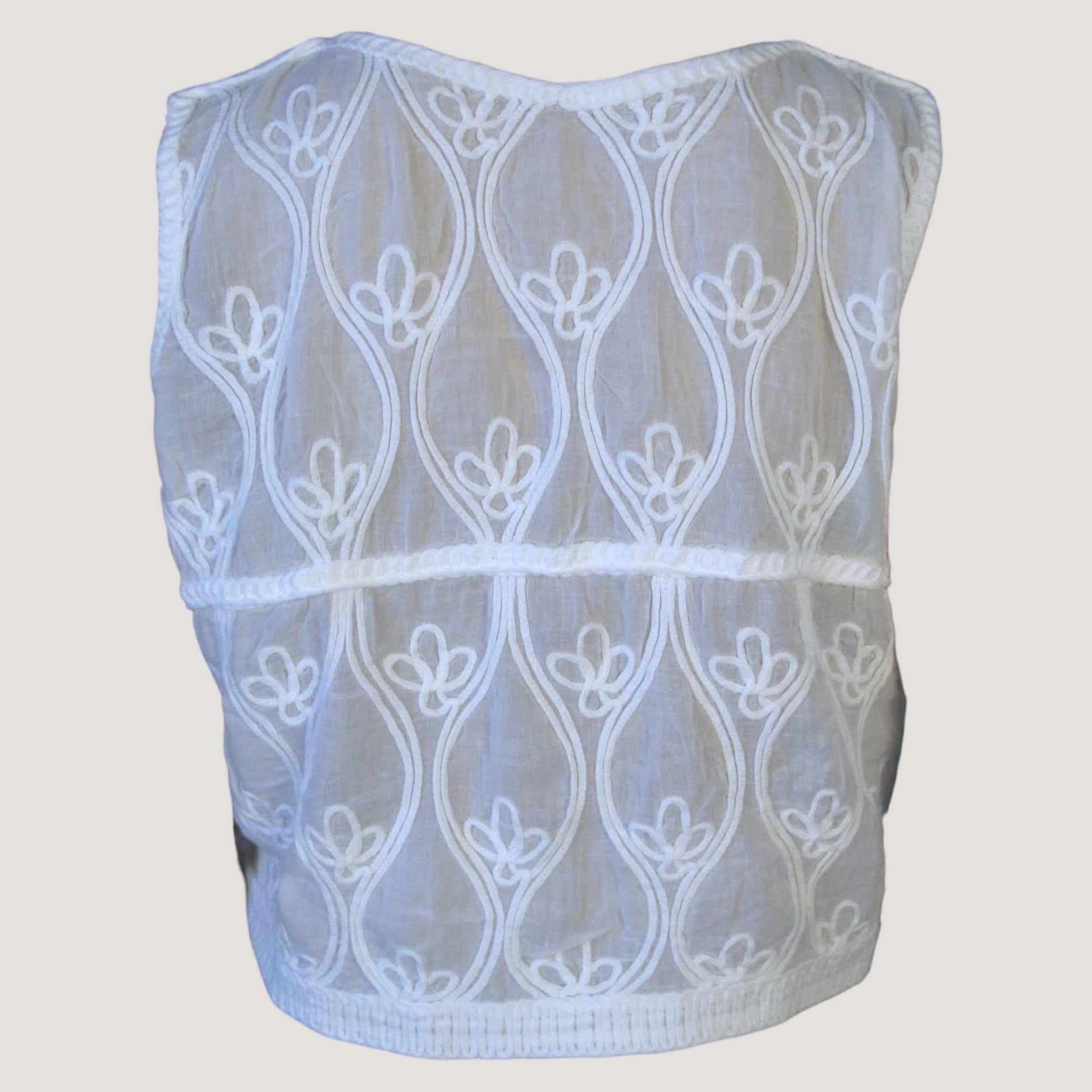 Vit mönster broderad väst i bomull med trä knappar framtill.