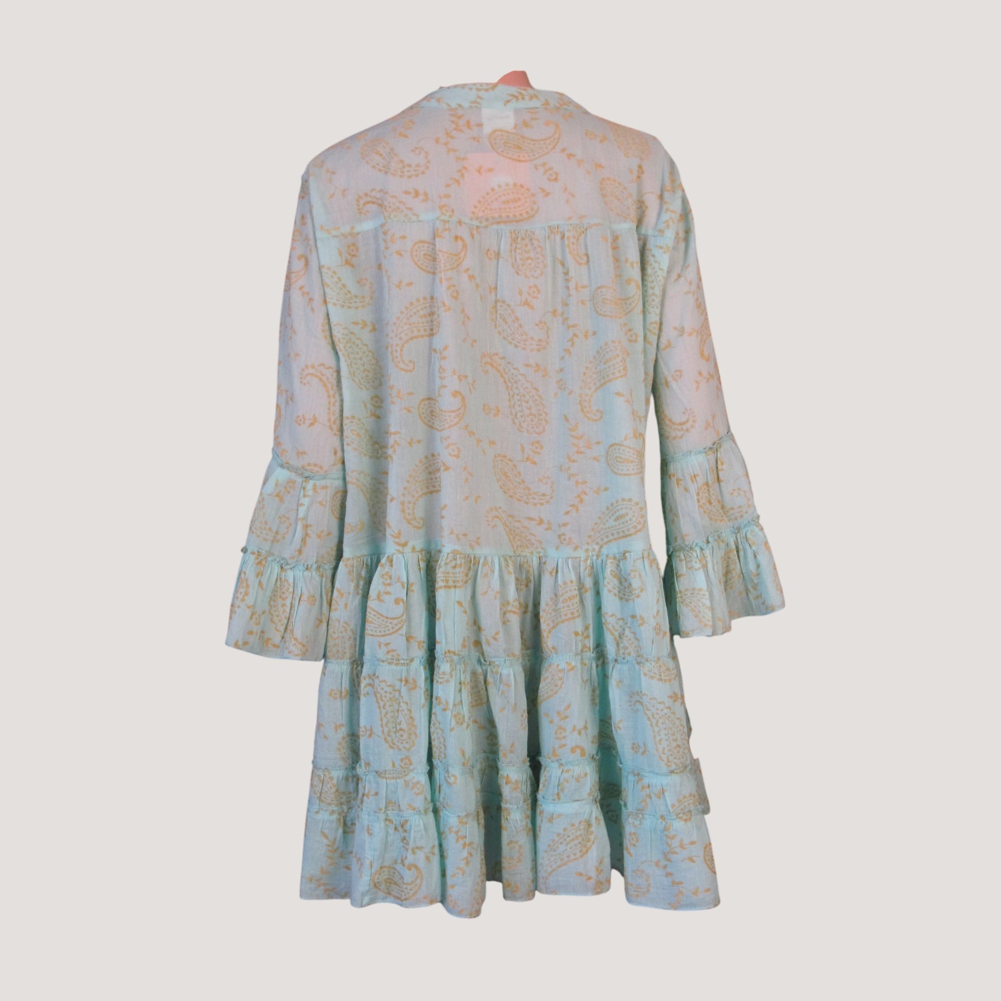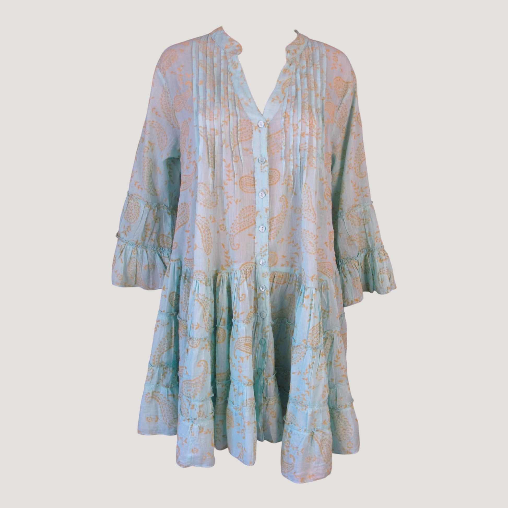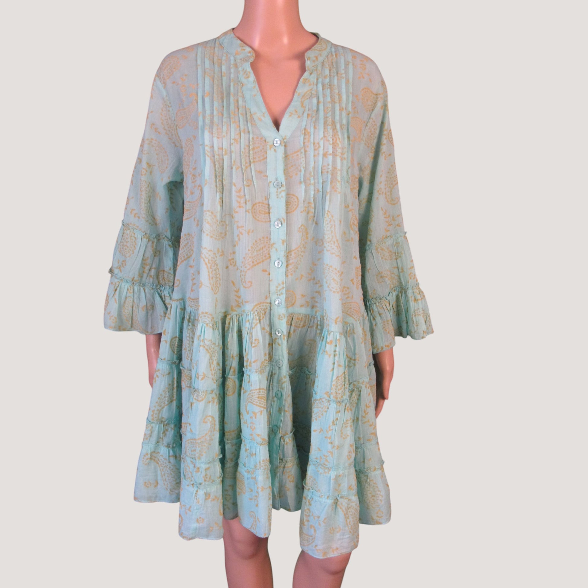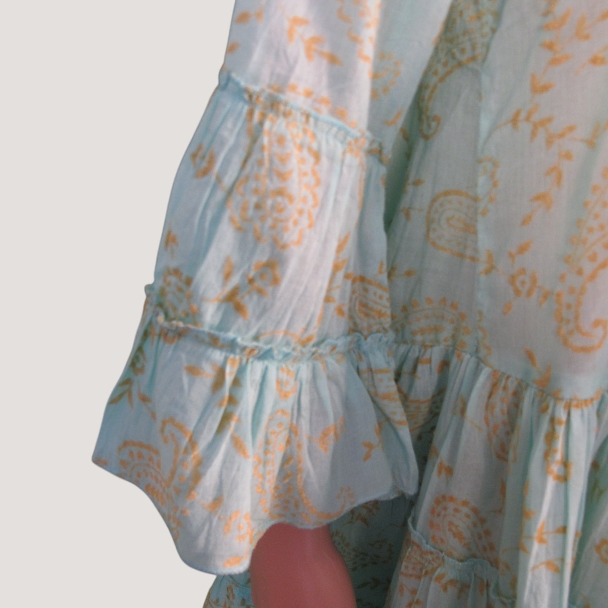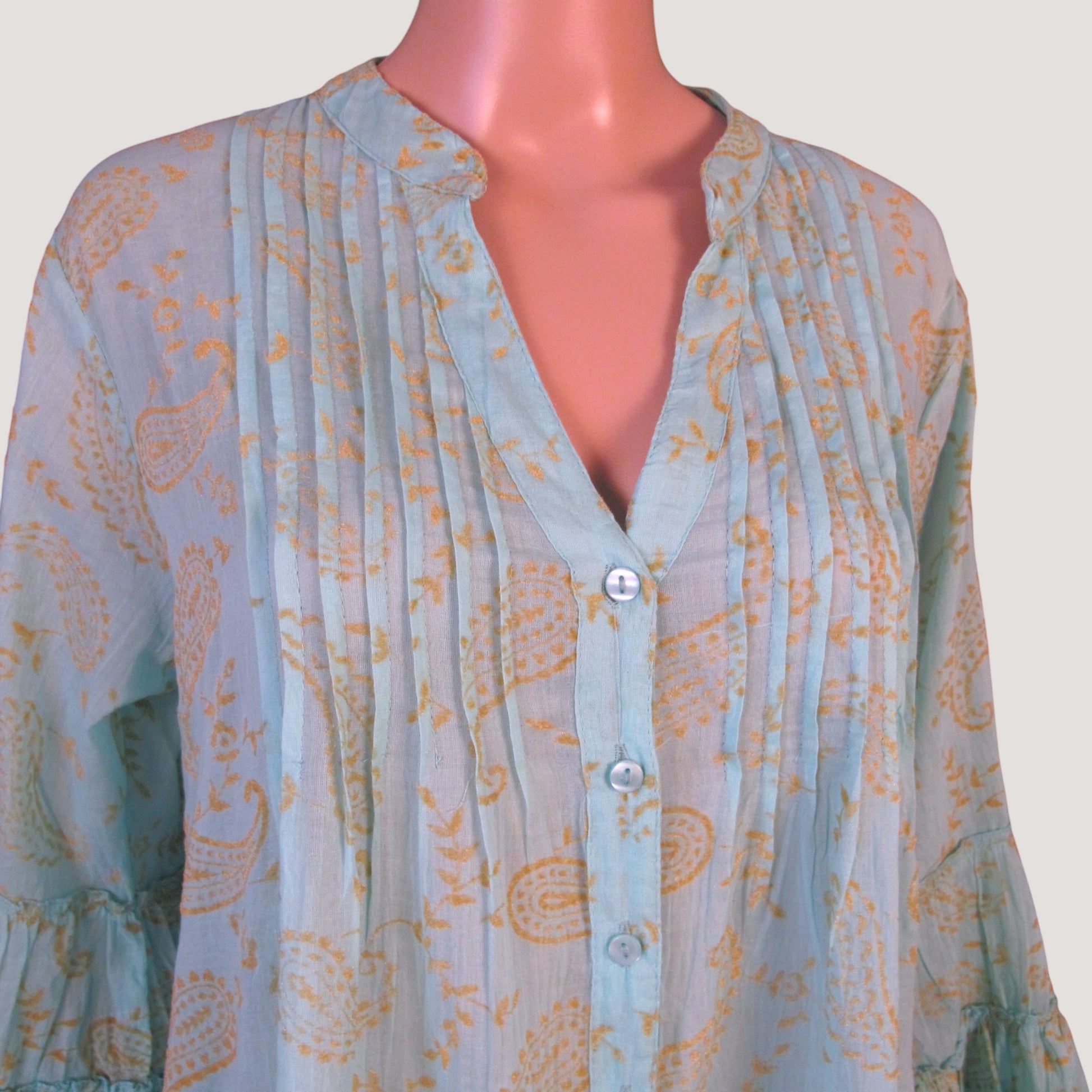 Bomulls tunika volang armar och paisley guldtryck. Sydda veck press framtill och knappar hela vägen.