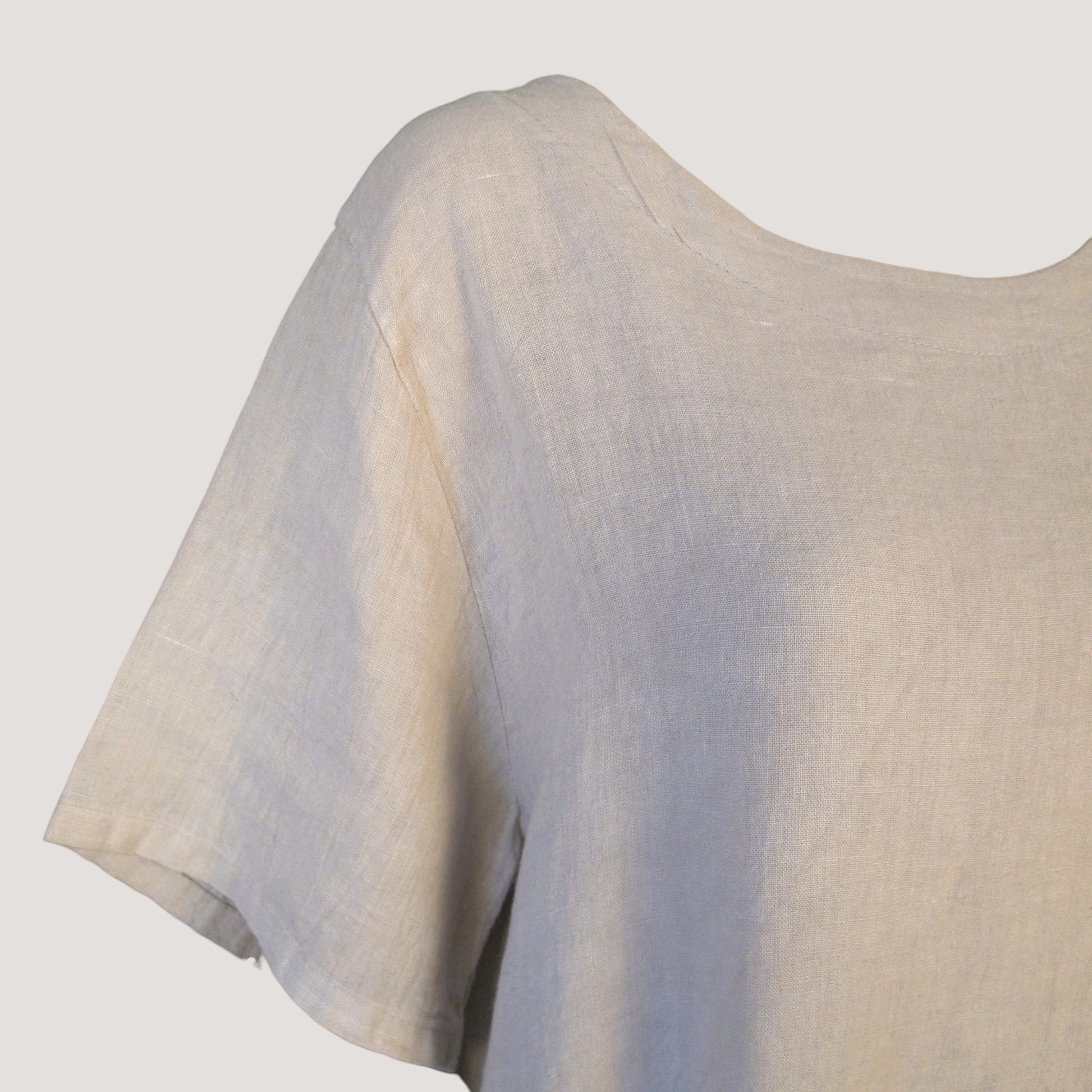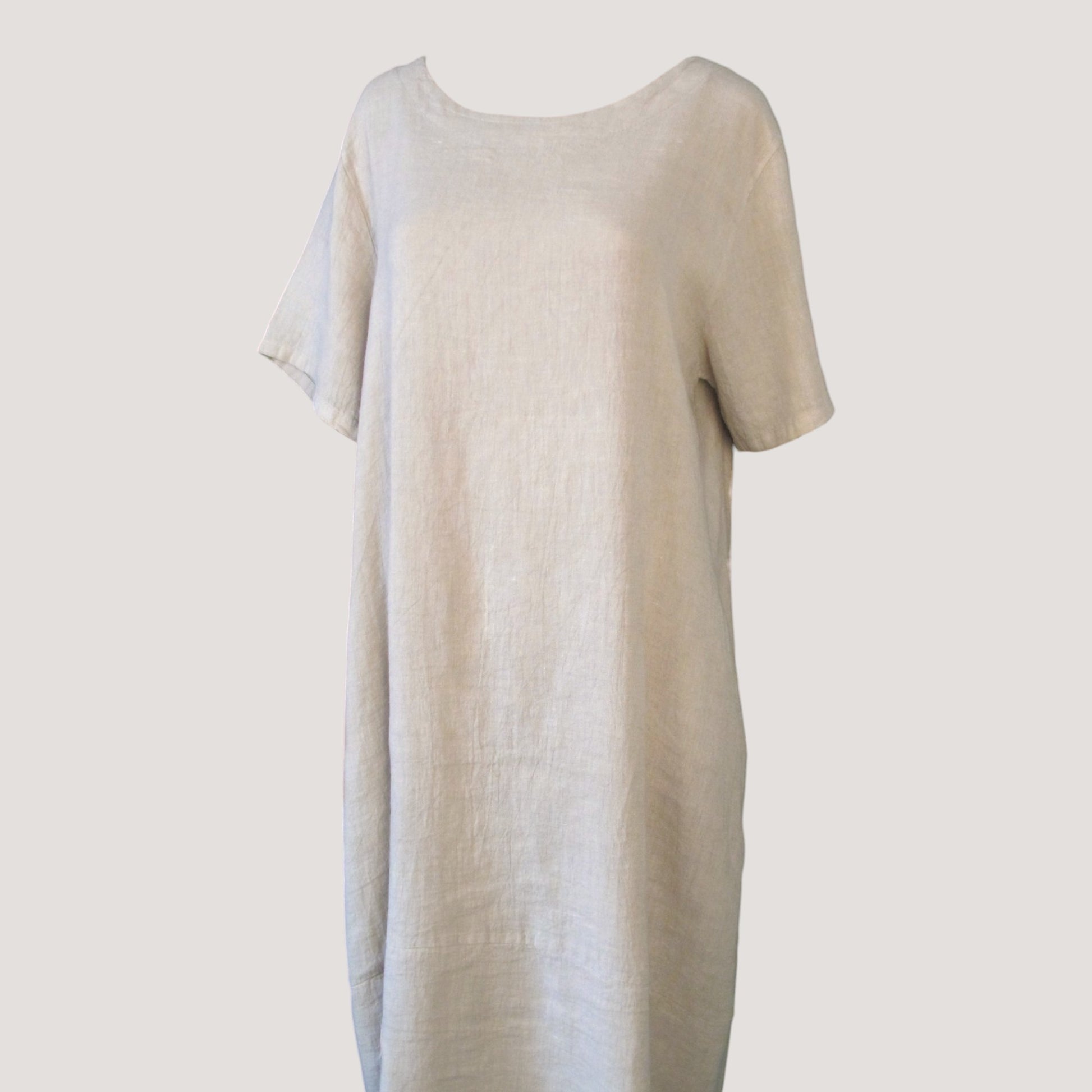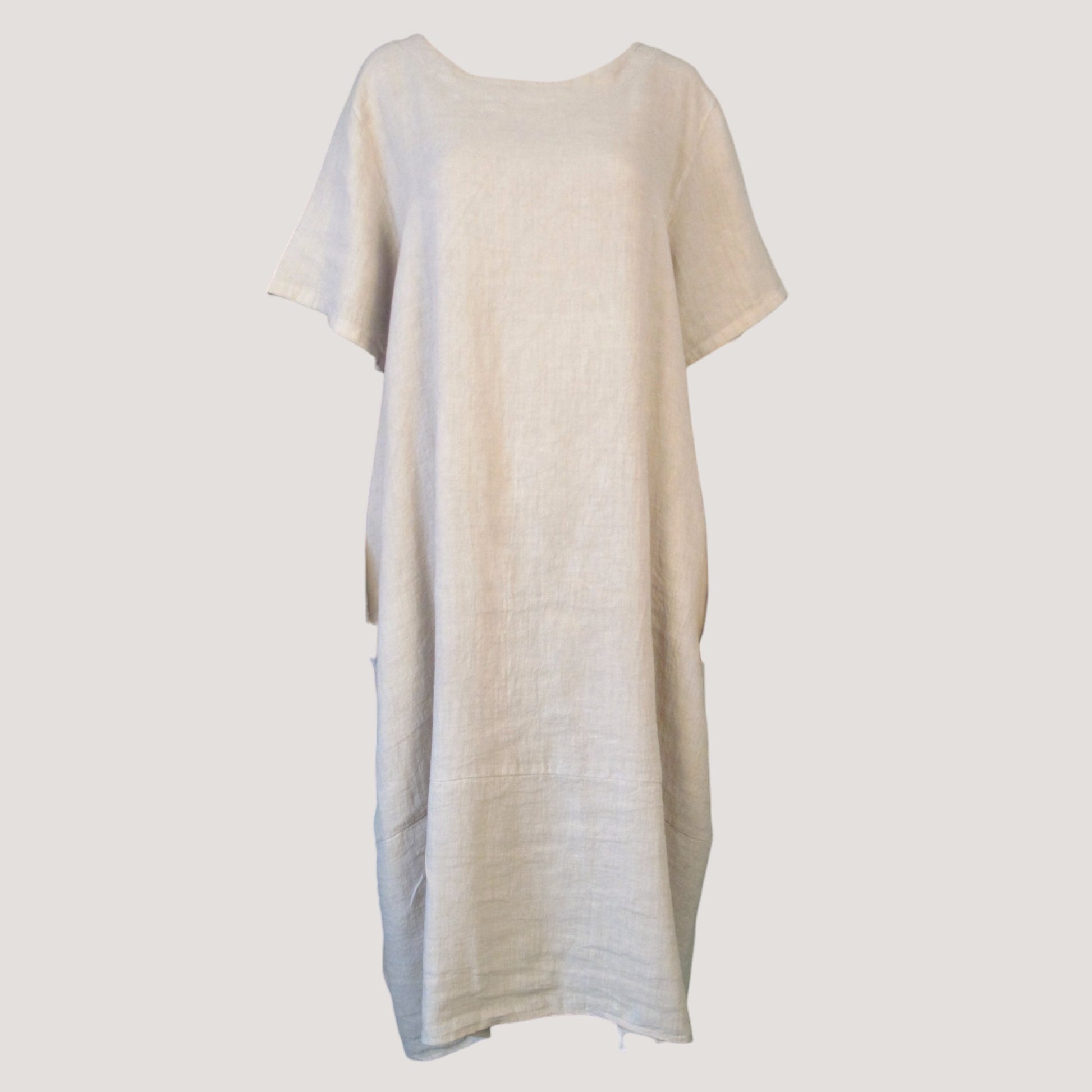 Linne klänning med rundad hals, fickor på sidan och kort ärm.