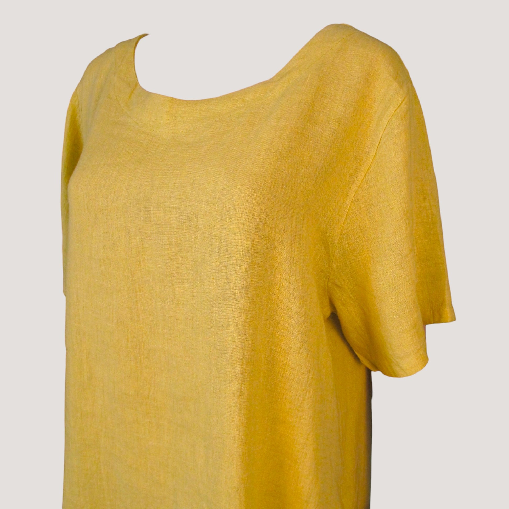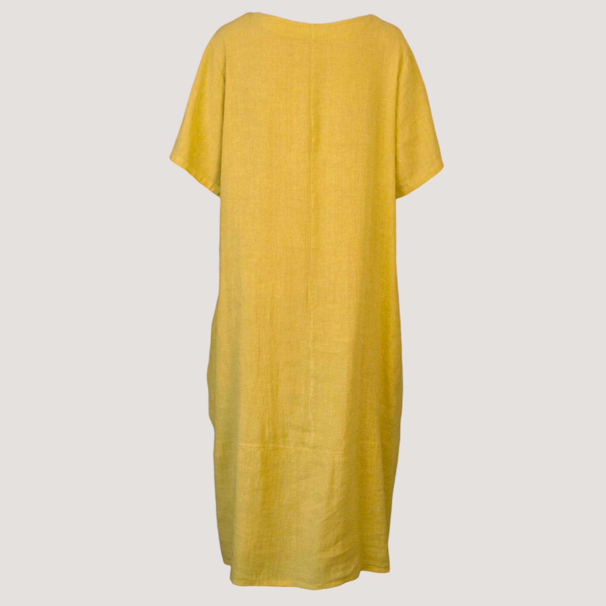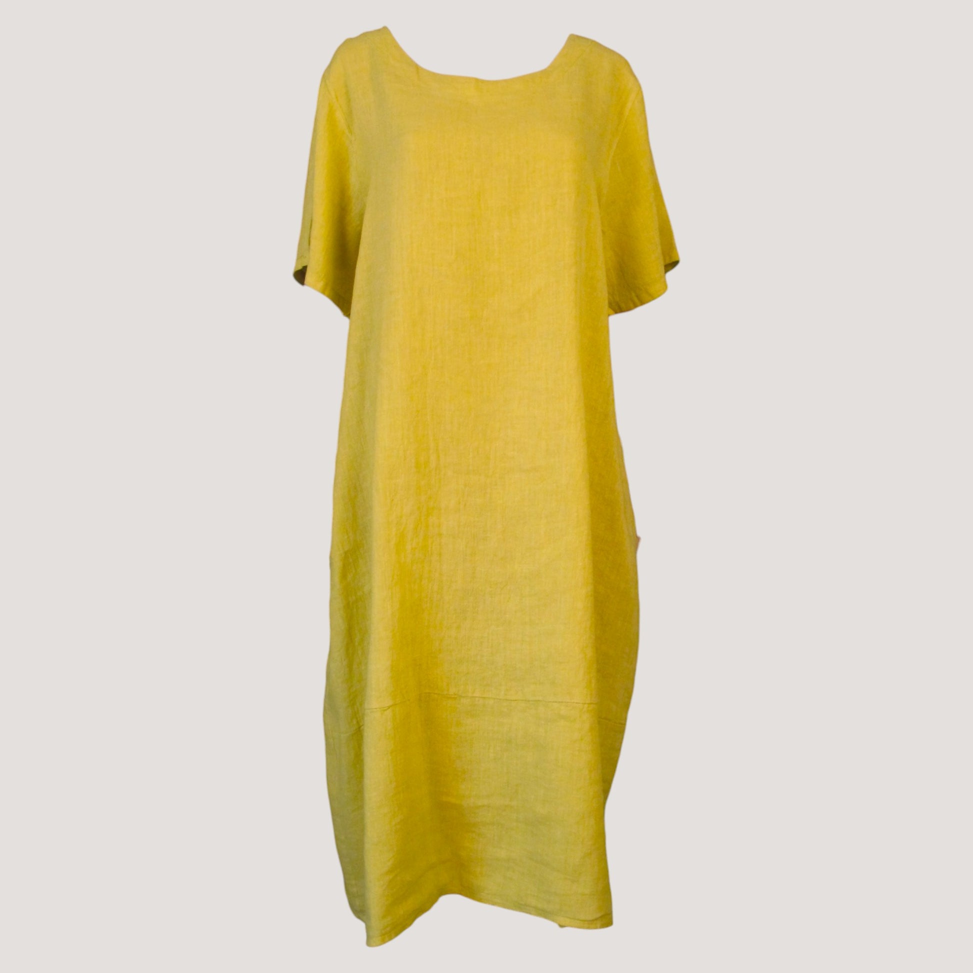Linne klänning med rundad hals, fickor på sidan och kort ärm.