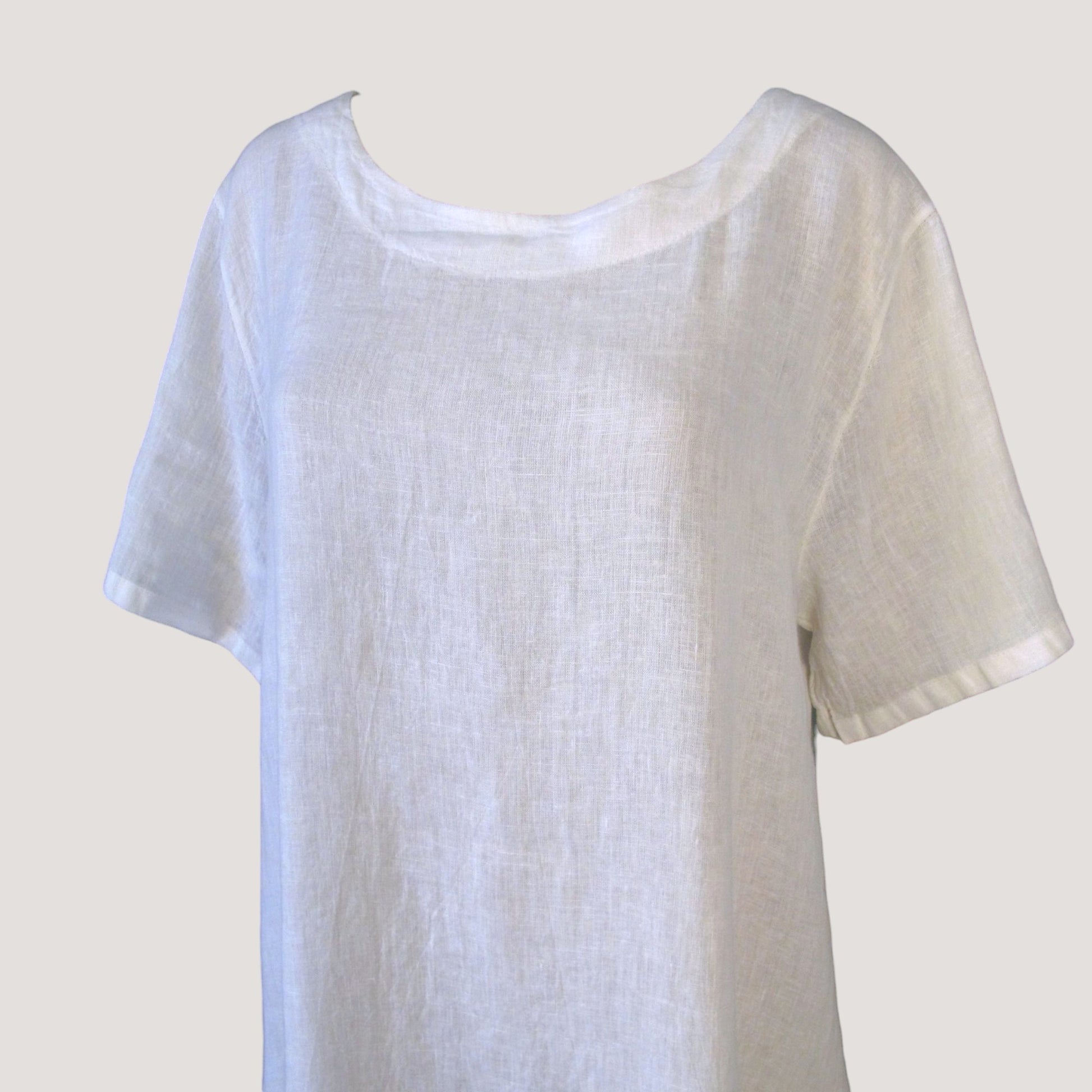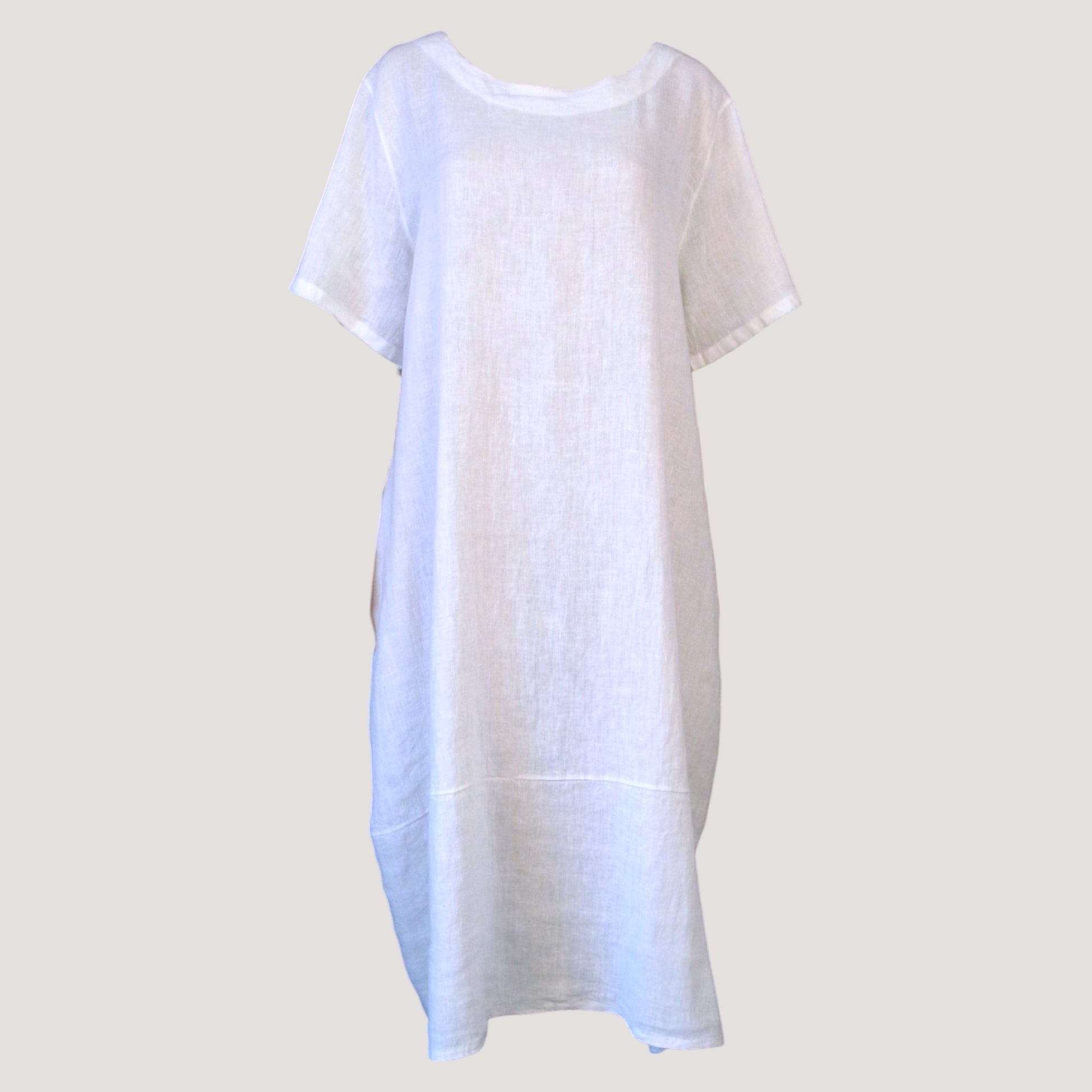 Linne klänning med rundad hals, fickor på sidan och kort ärm.