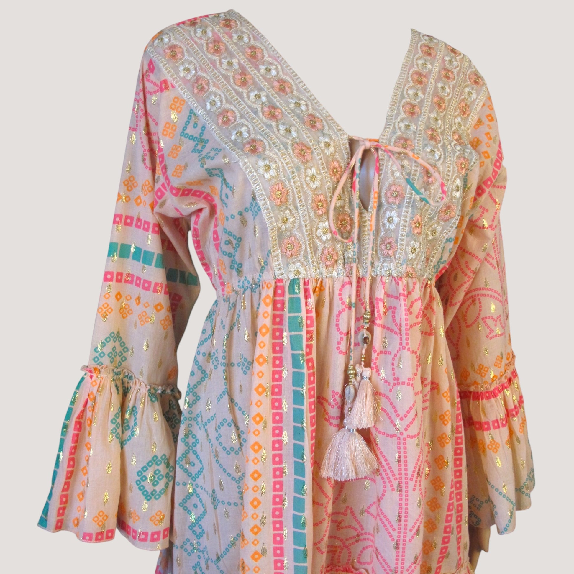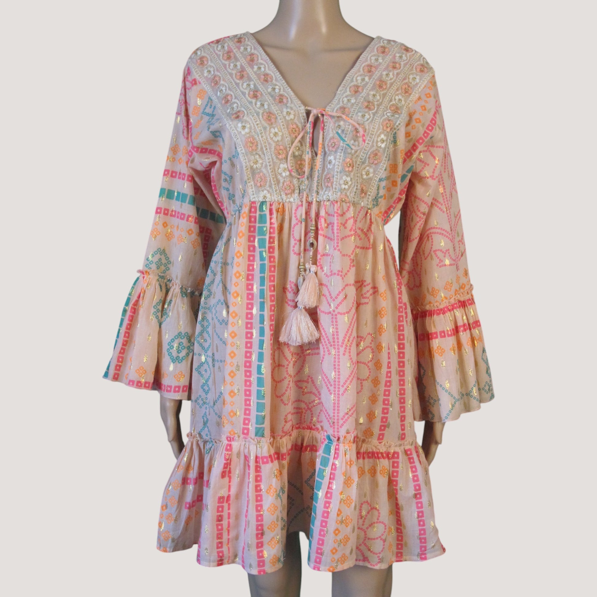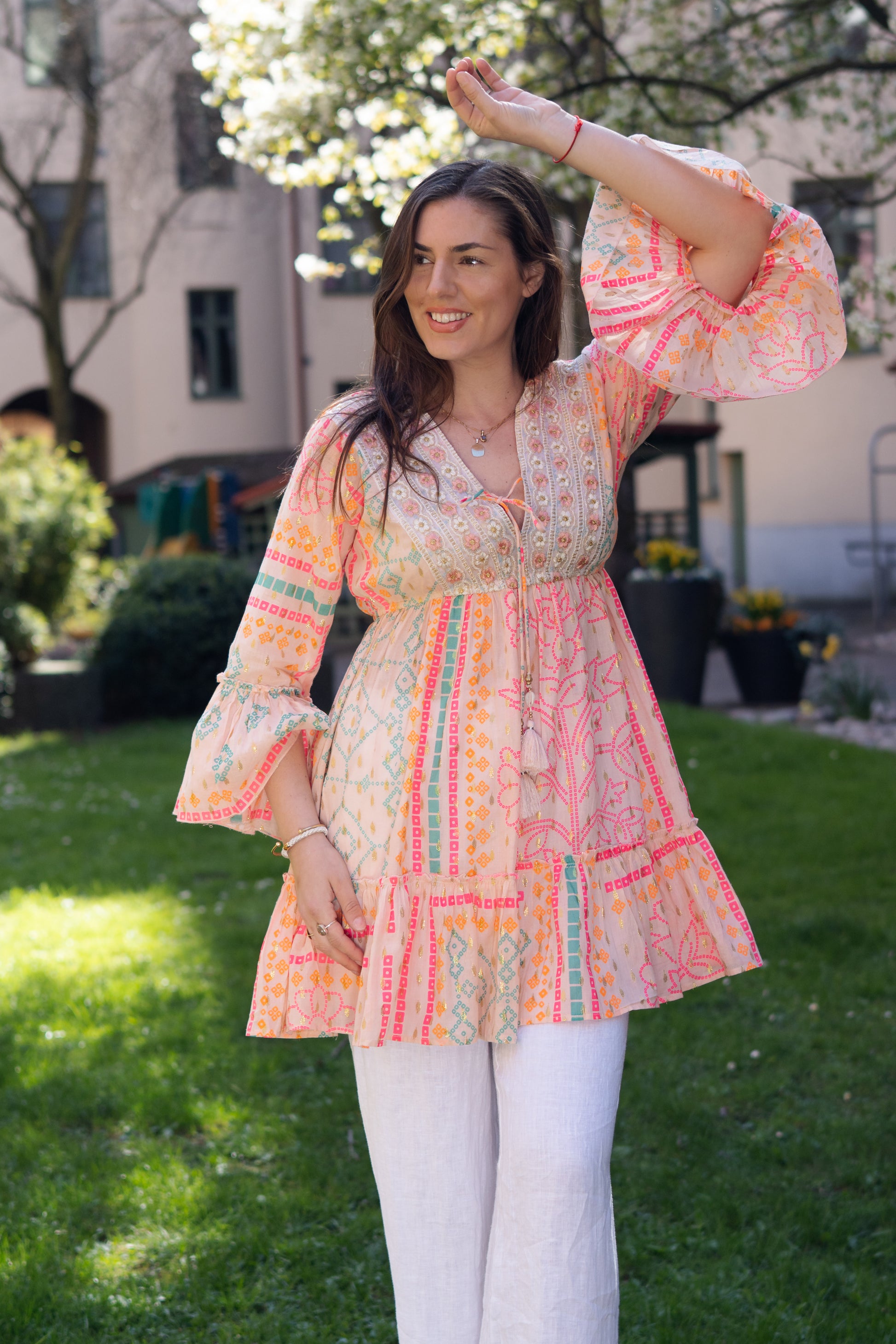 Fin mönstrad tunika / klänning med tofsar framtill. Volang nertill och vid arm slut.