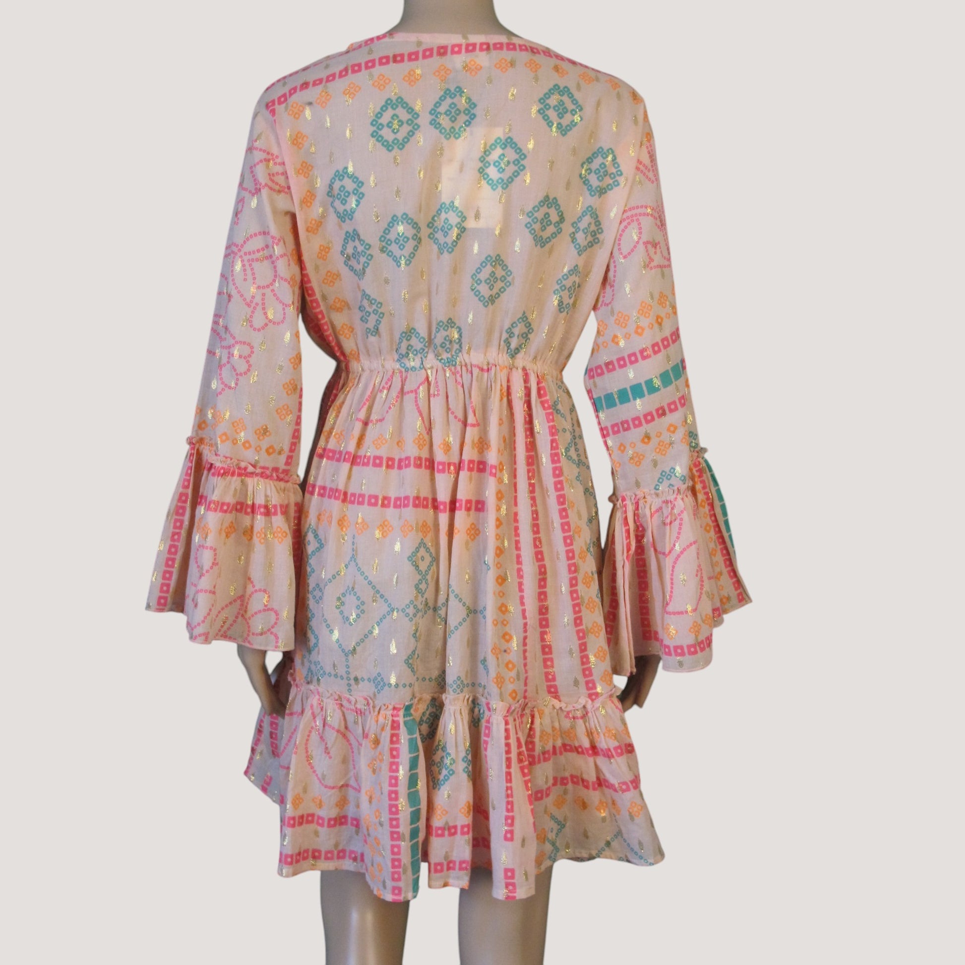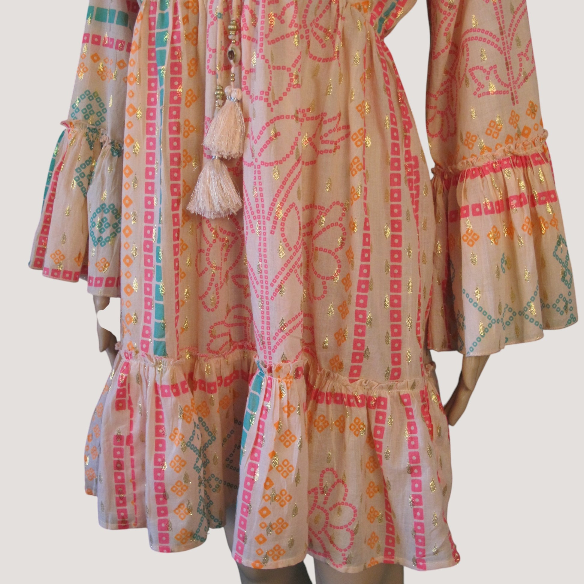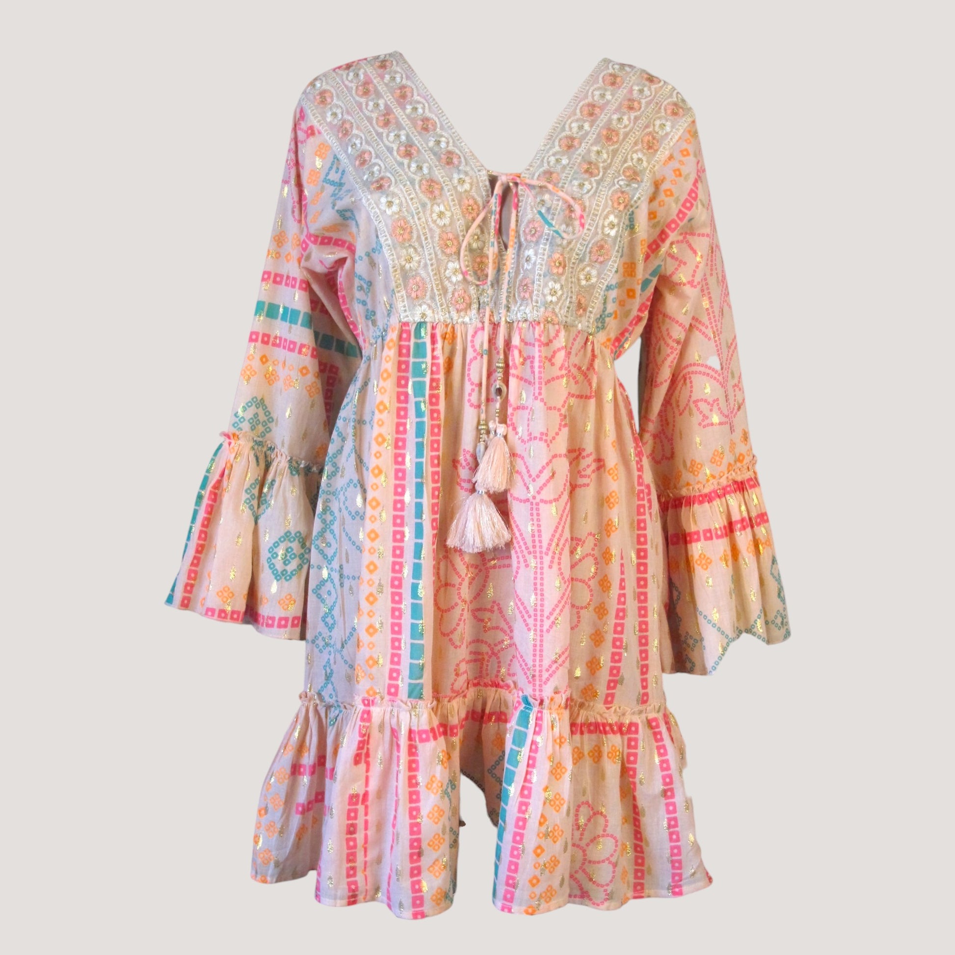 Fin mönstrad tunika / klänning med tofsar framtill. Volang nertill och vid arm slut.