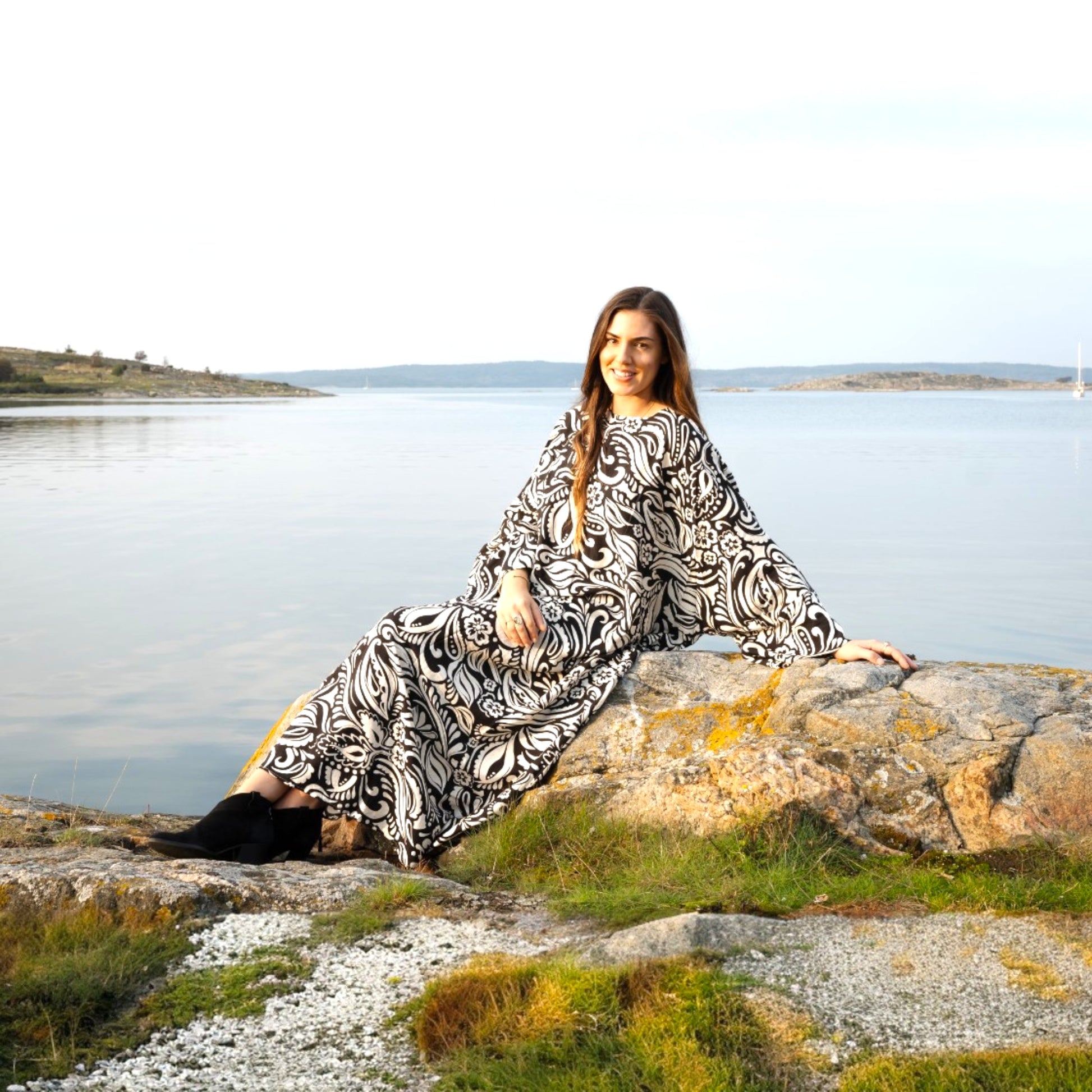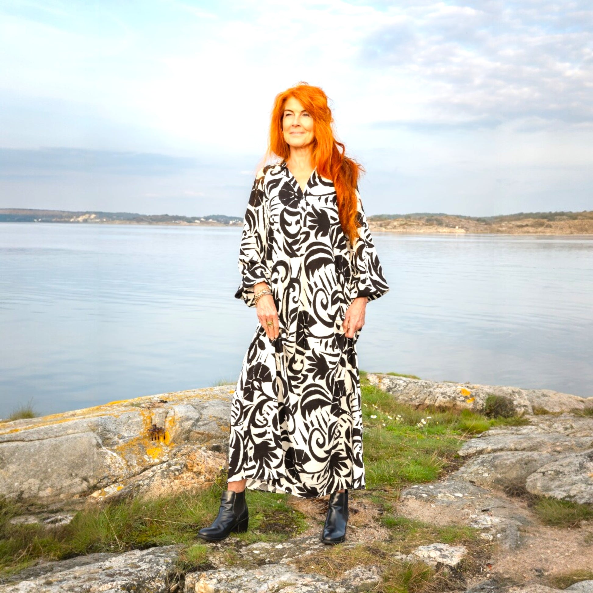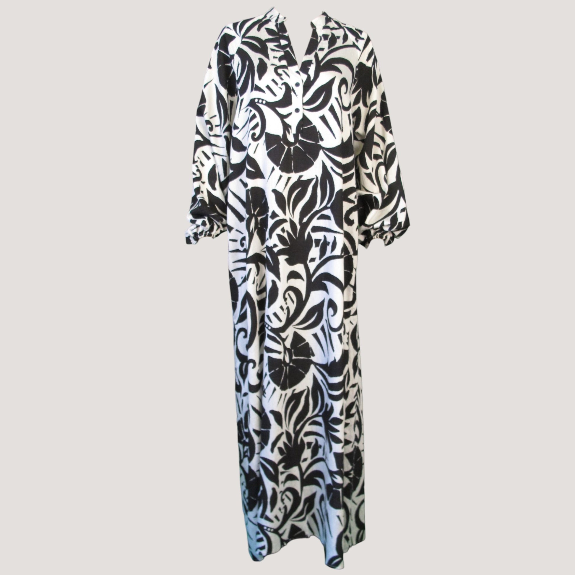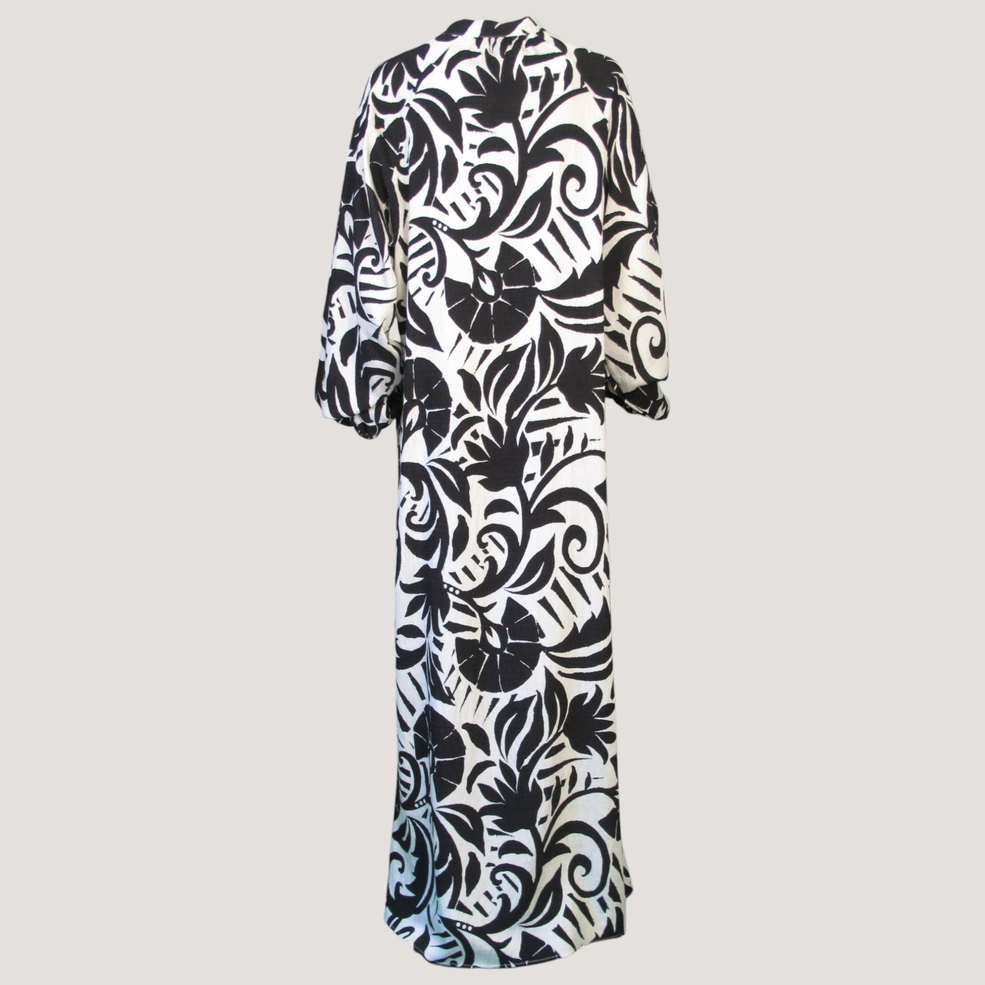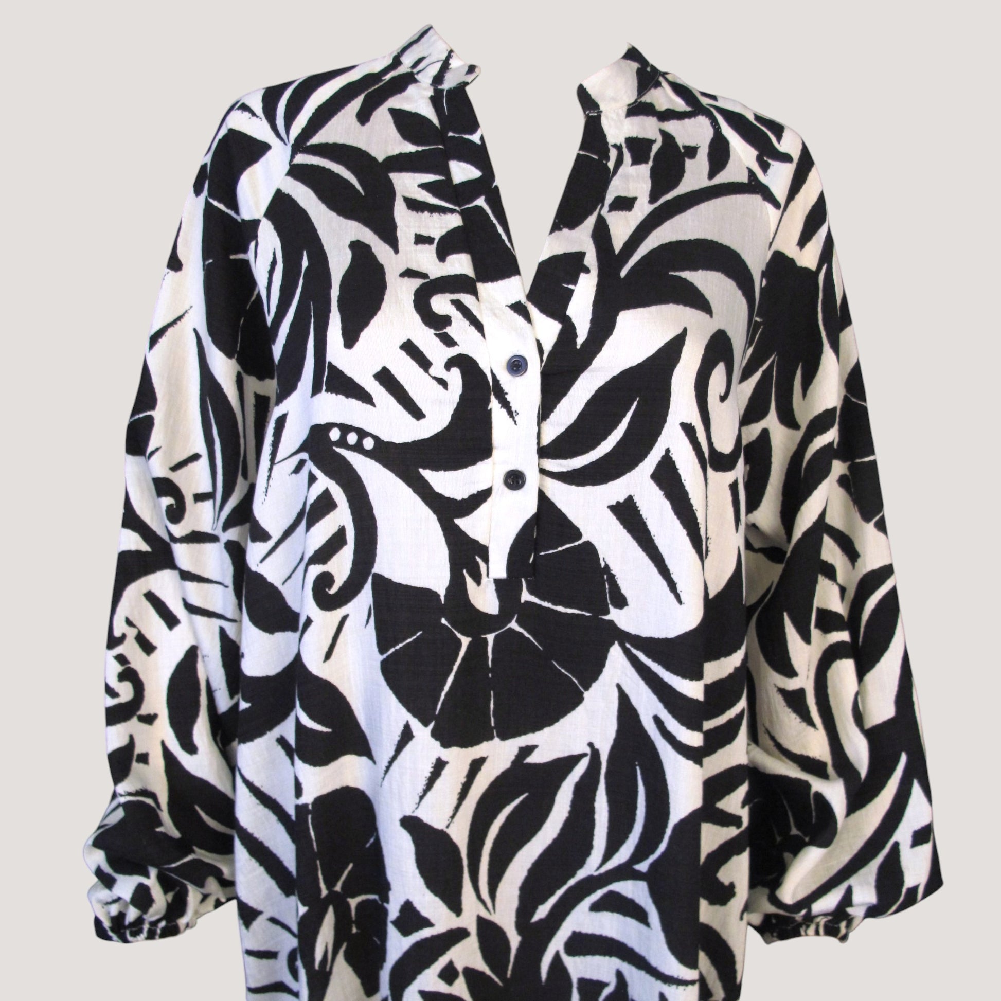 Mönstrad bomulls klänning med knappar upptill på framsidan. V- ringad med stål krage.