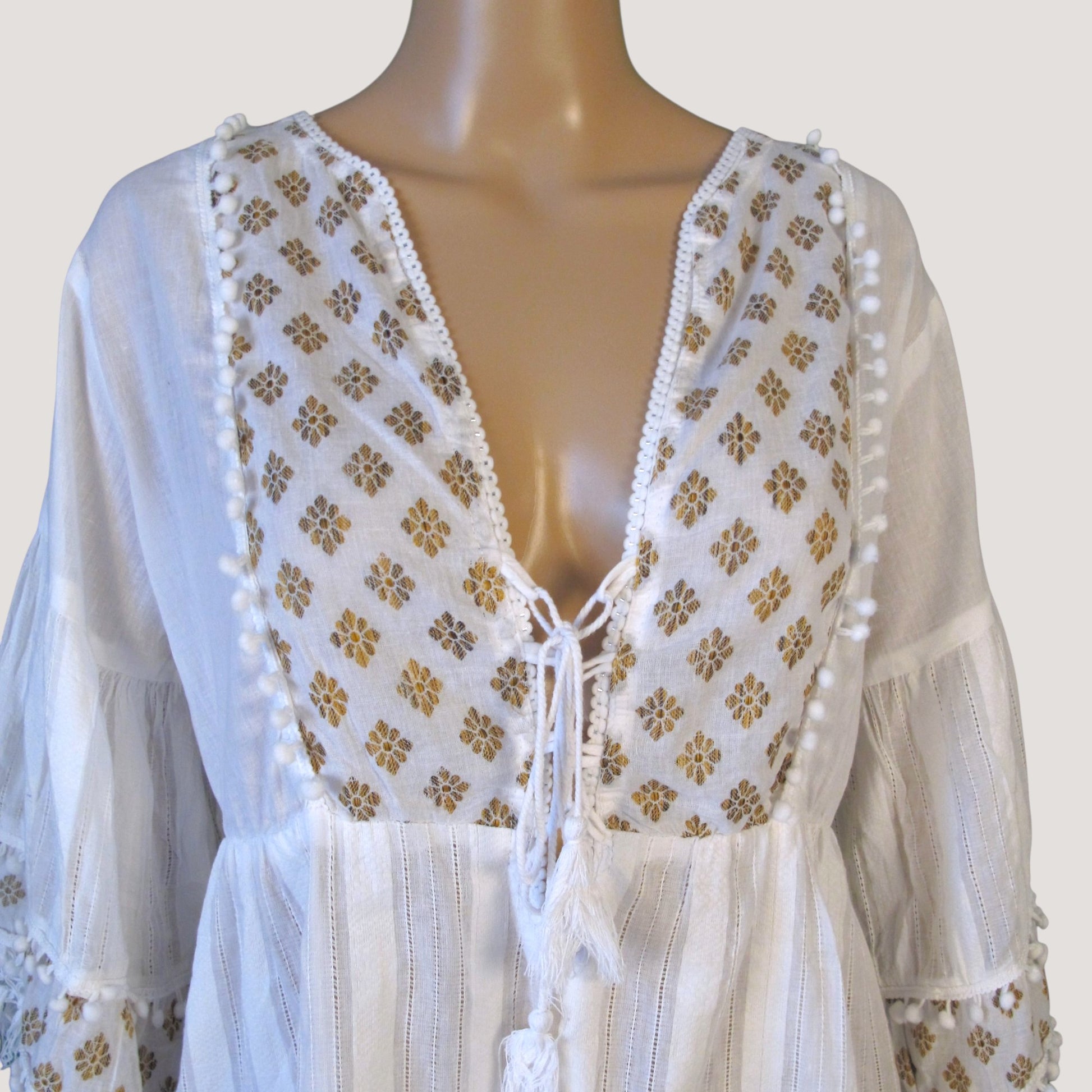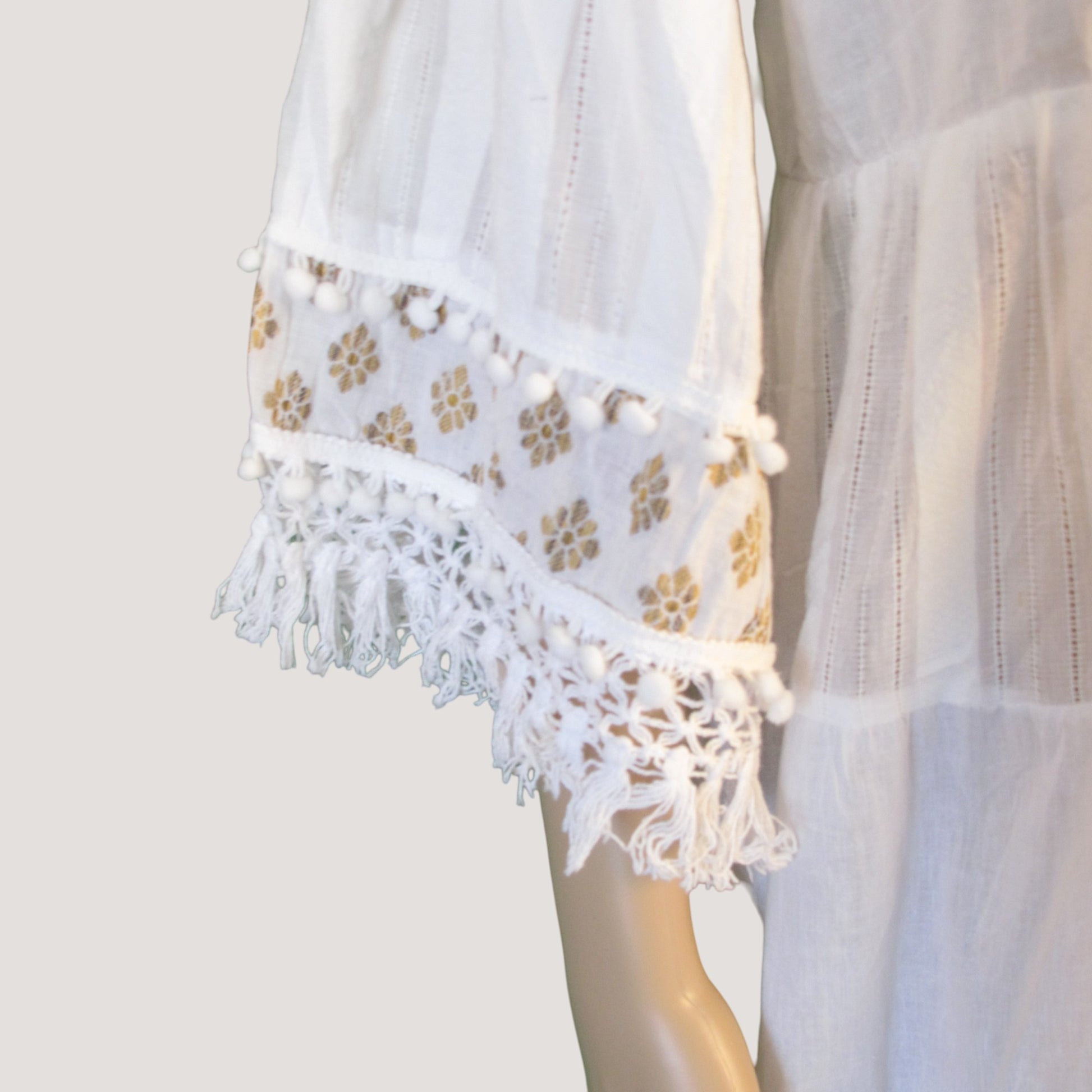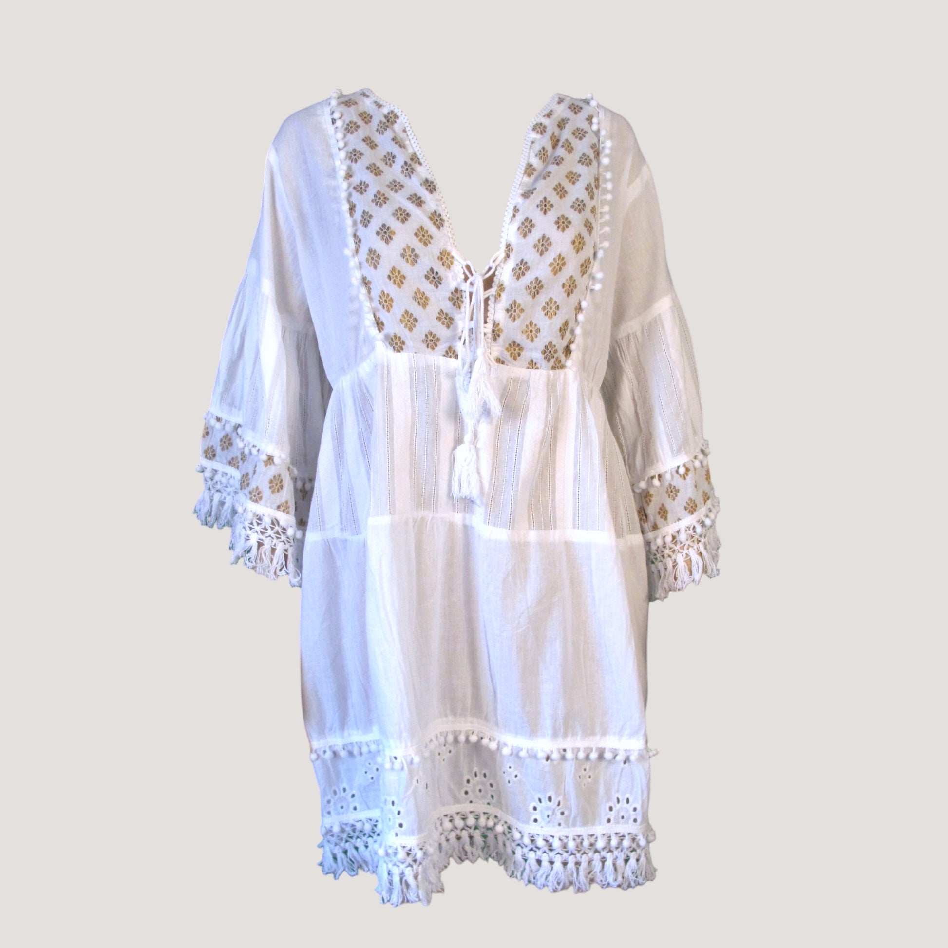 Bomullsklänning med guldtryck och V-ringad framtill. Trekvarts arm och fransar nertill både på armar och klänningens slut.