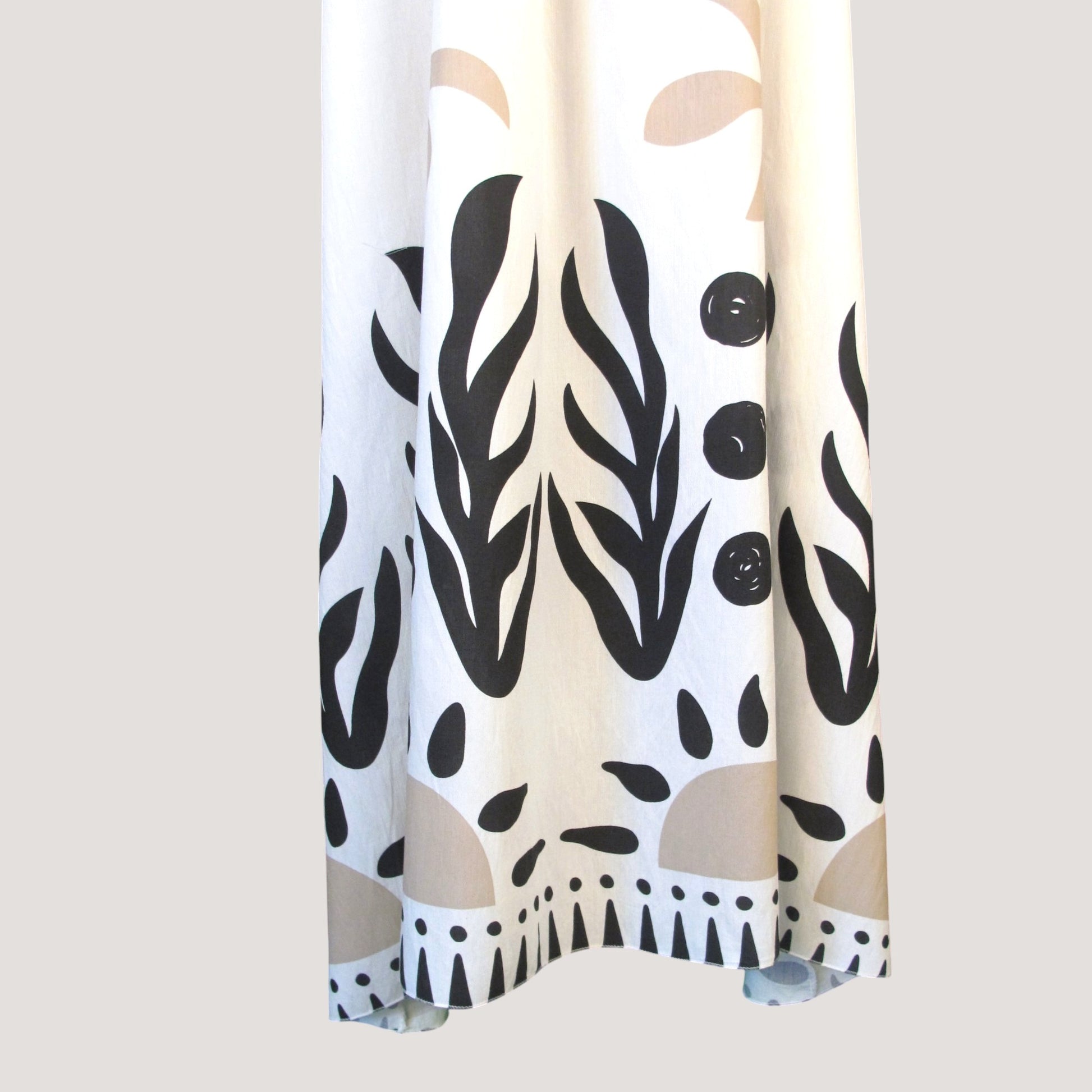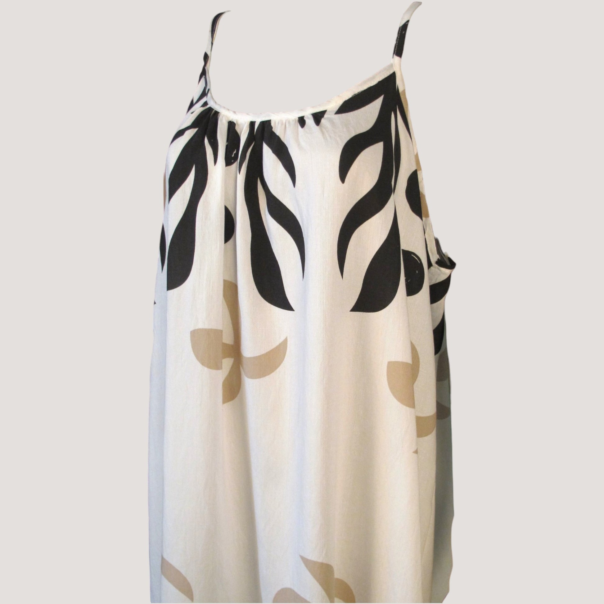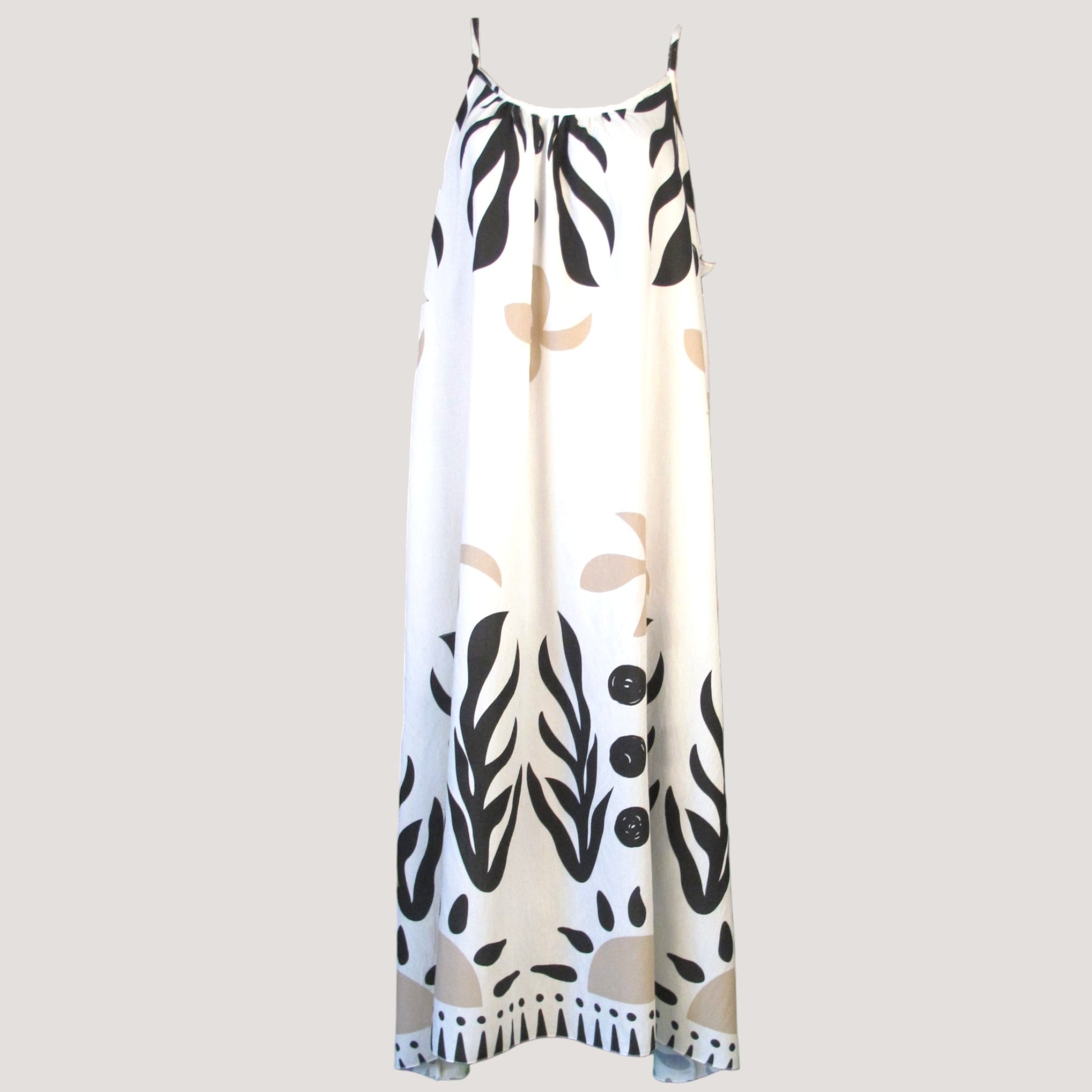 Lång mönstrad viskos klänning med smala band och knapp i ryggen.